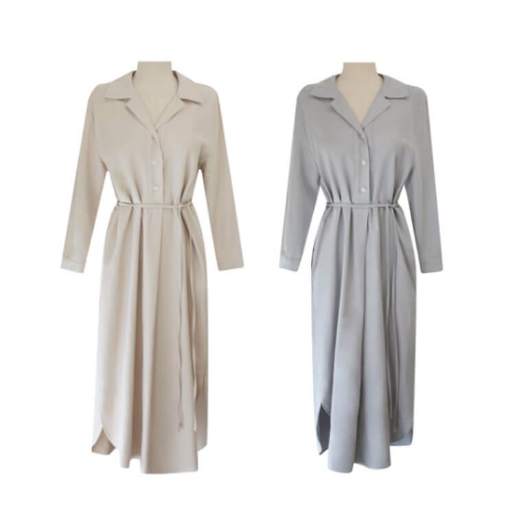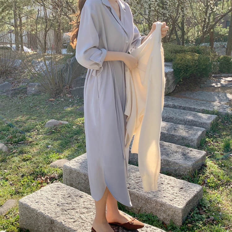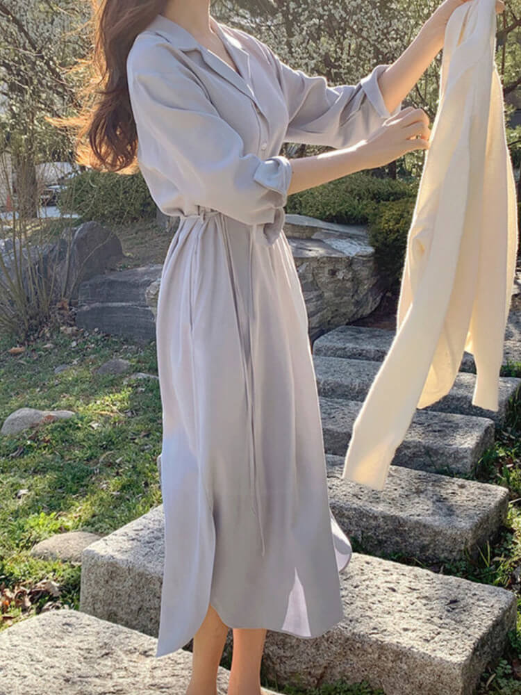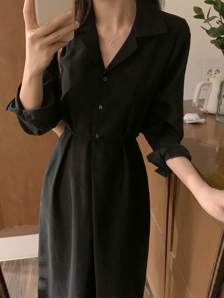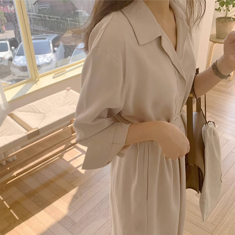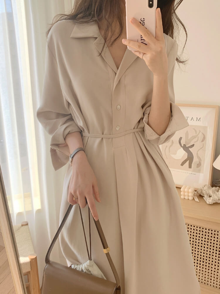 韓国デザインのキレイ系シンプルなミモレ丈シャツワンピース。