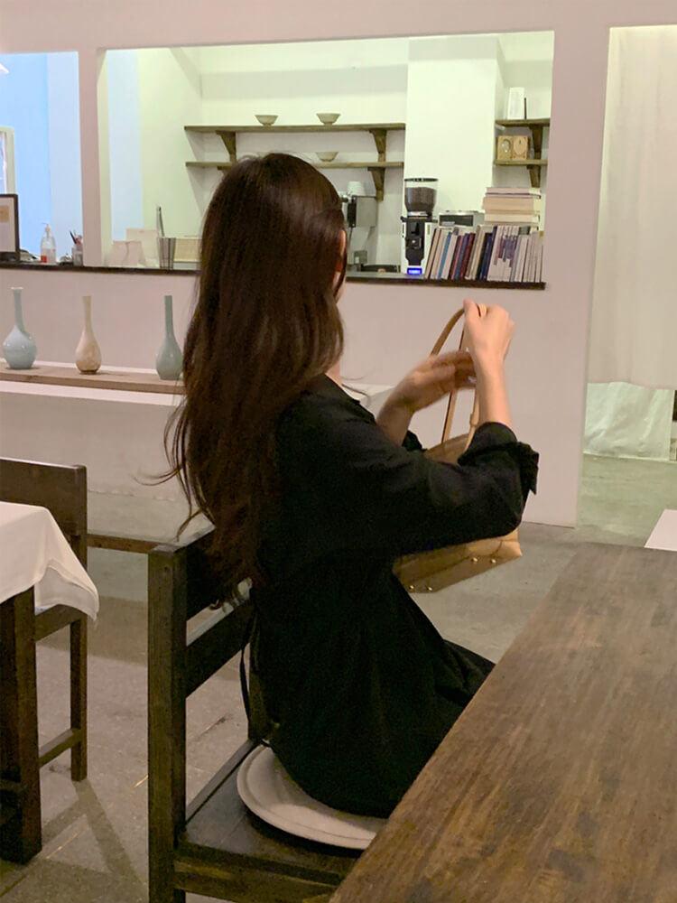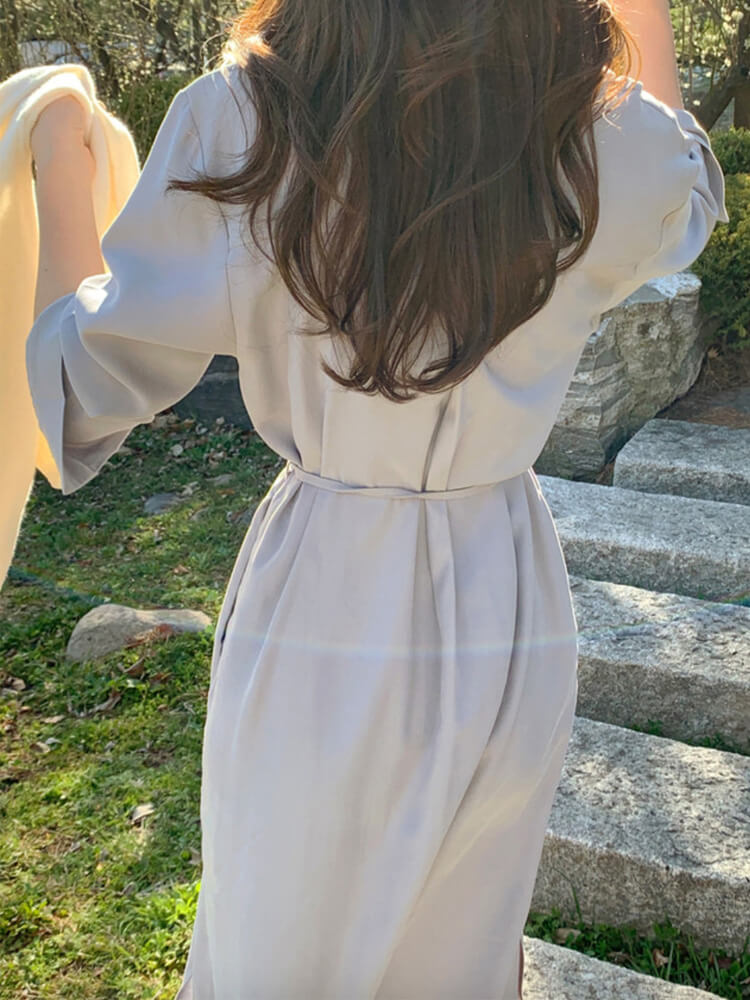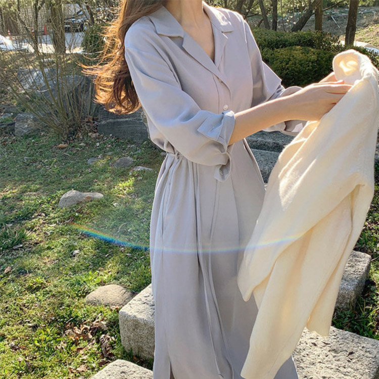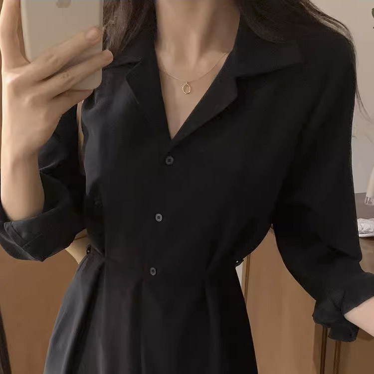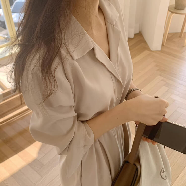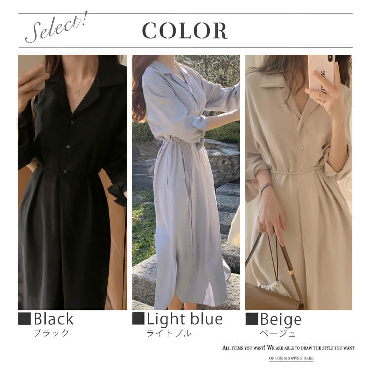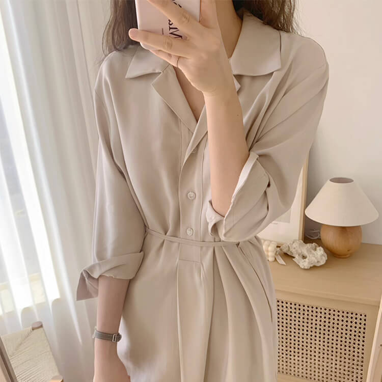 韓国デザインのキレイ系シンプルなミモレ丈シャツワンピース。
