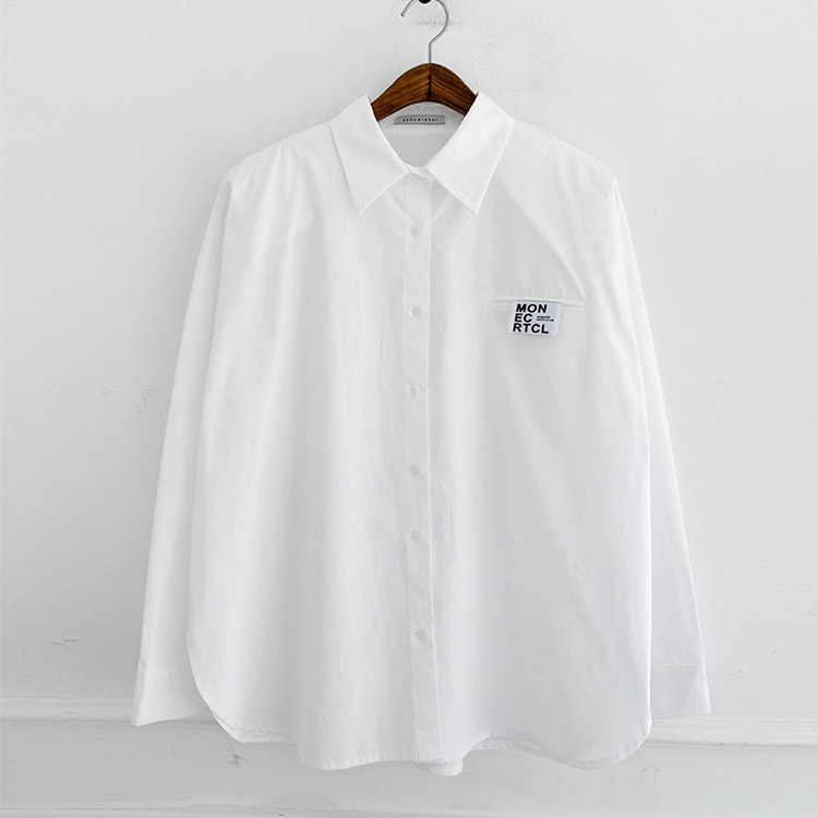 胸ポケットにアルファベットプリントのタグ布風の飾りをプラスしカジュアルデザインに。