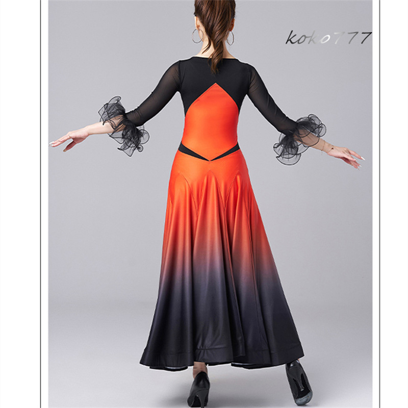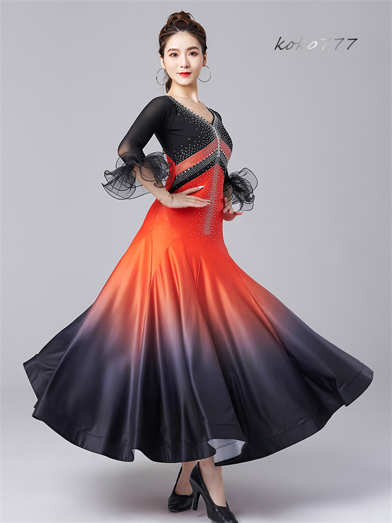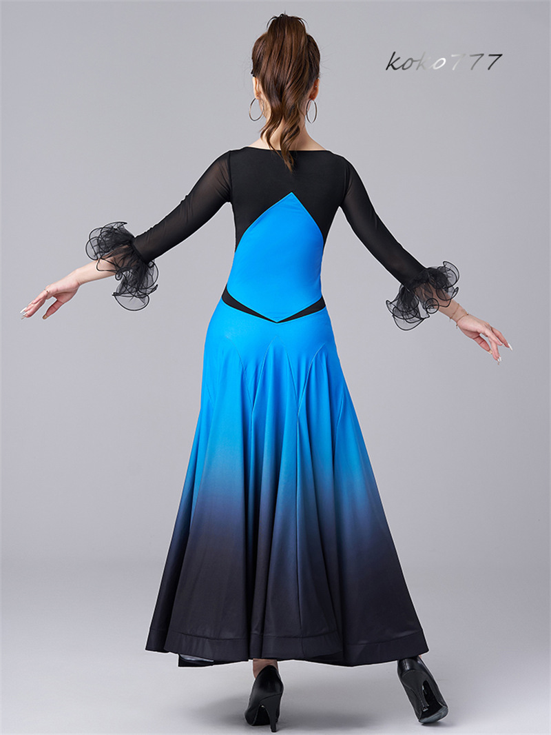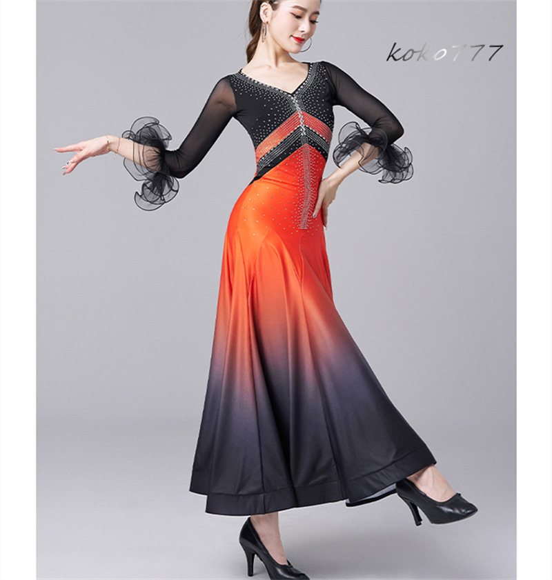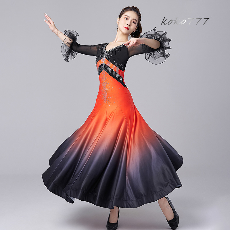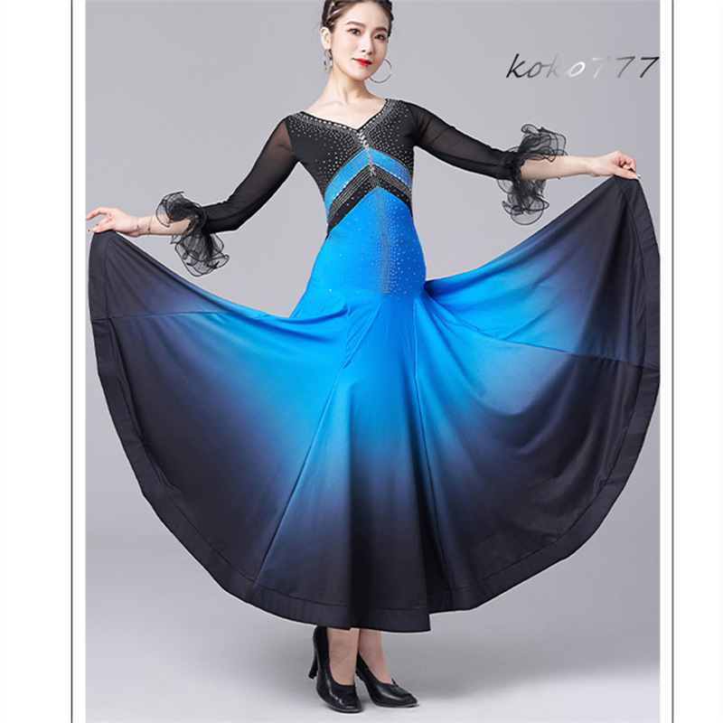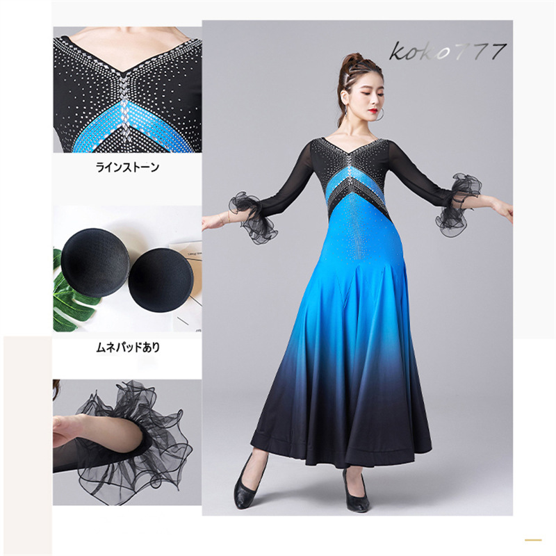 ロングドレス レディース ワンピース ラテンダンス ラインストーン パーティー モダンダンス グラデーション 発表会 公演 ワルツ 社交ダンス 舞台衣装 洋服