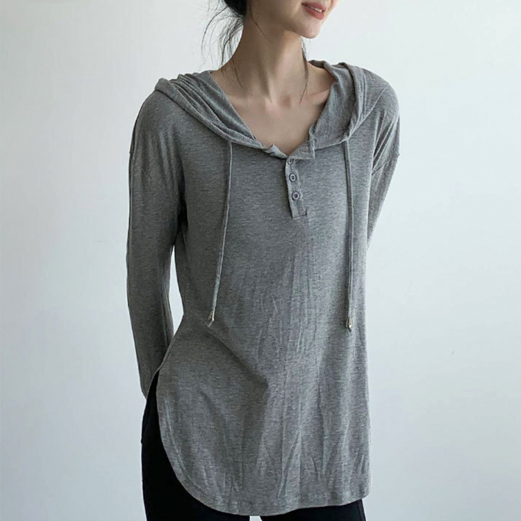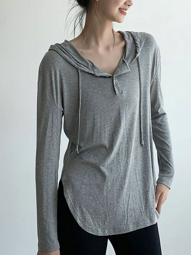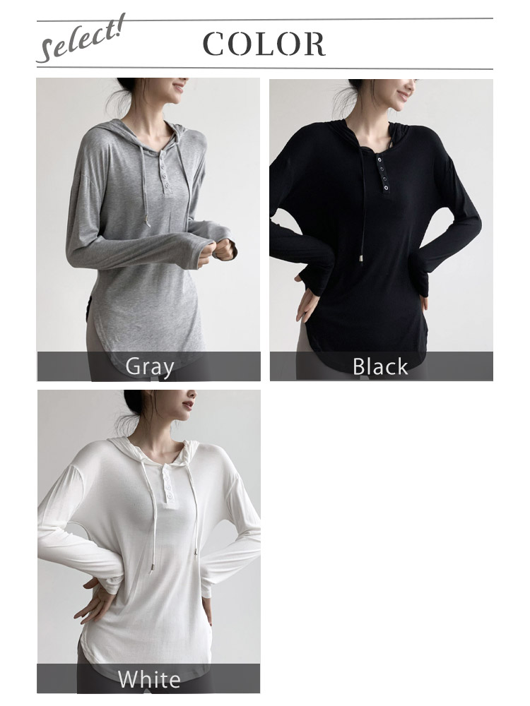 ヘンリーネック風ボタンデザインのフード付き長袖Tシャツ。