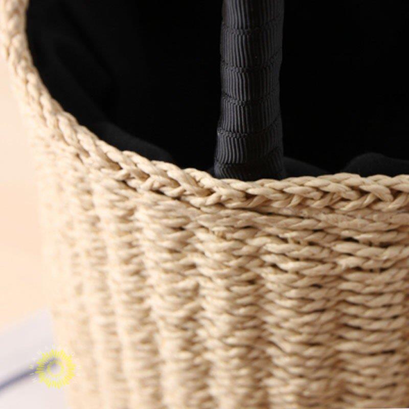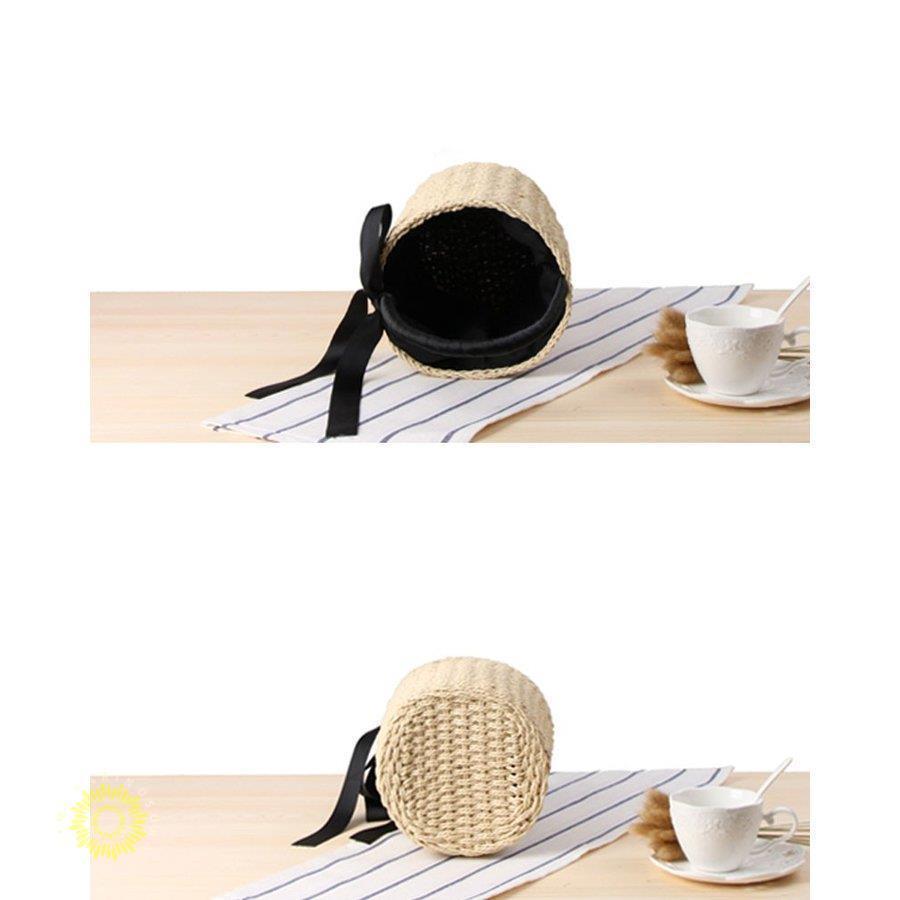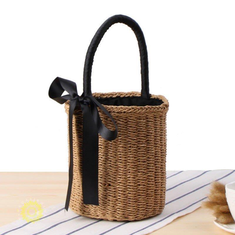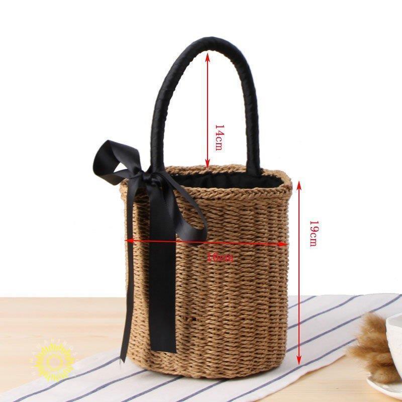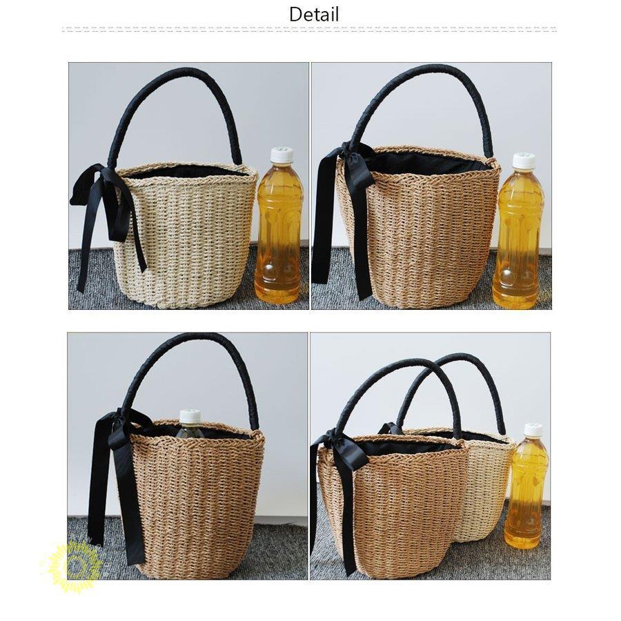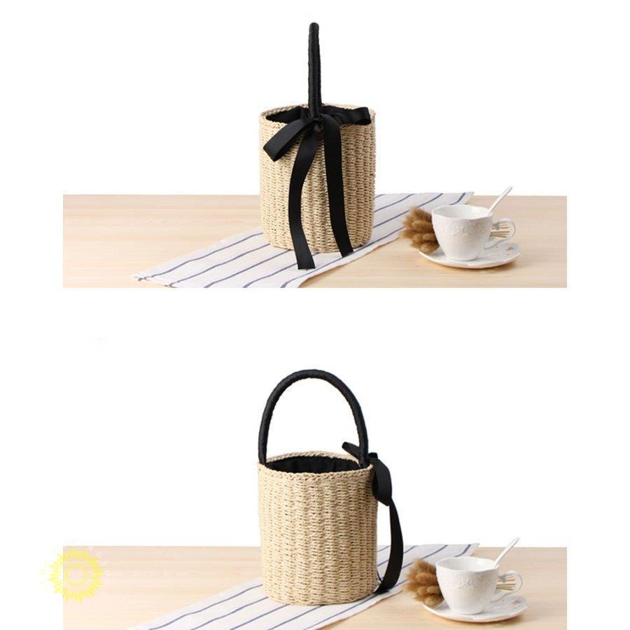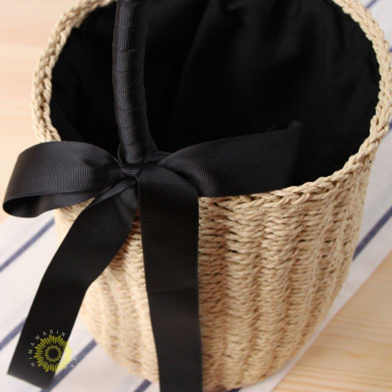 かごバッグ バケツ型 リボン付き ストローバッグ 手提げ バスケット ハンドバッグ 巾着 トートバッグ ペーパーストローバッグ 鞄 ブラウン 夏 ベージュ