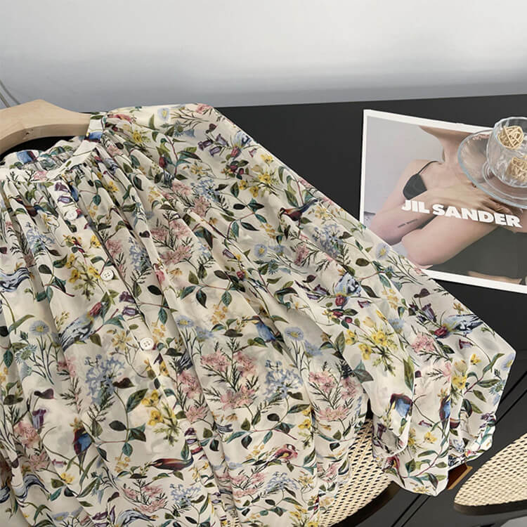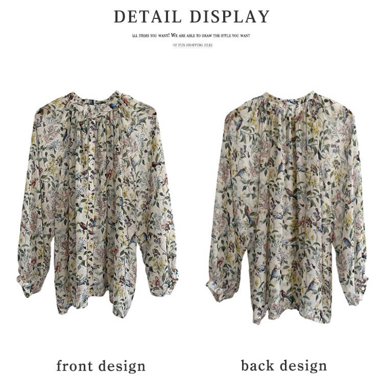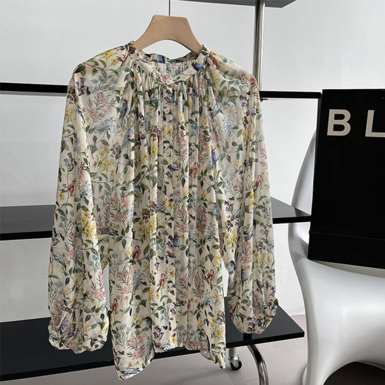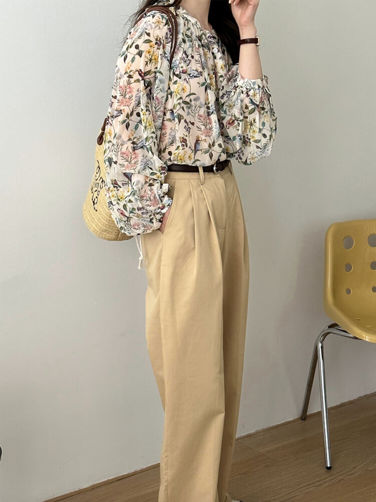 韓国デザインのボタニカル風花柄ノーカラーギャザーネックブラウス。