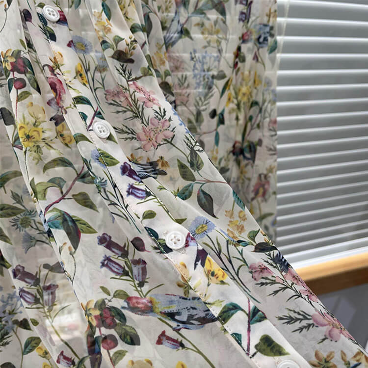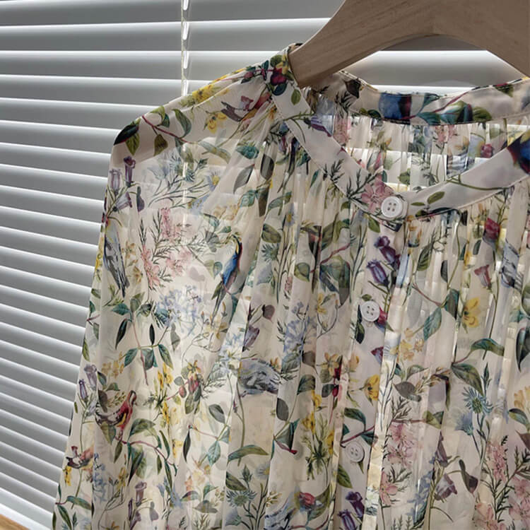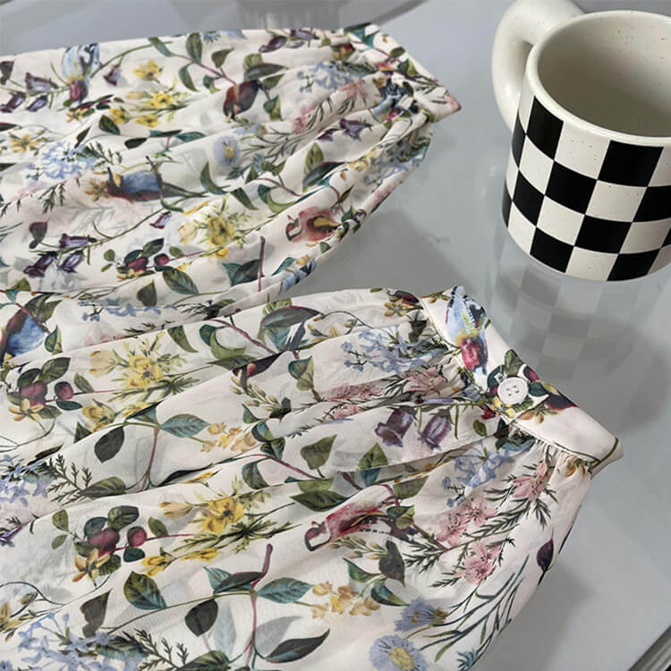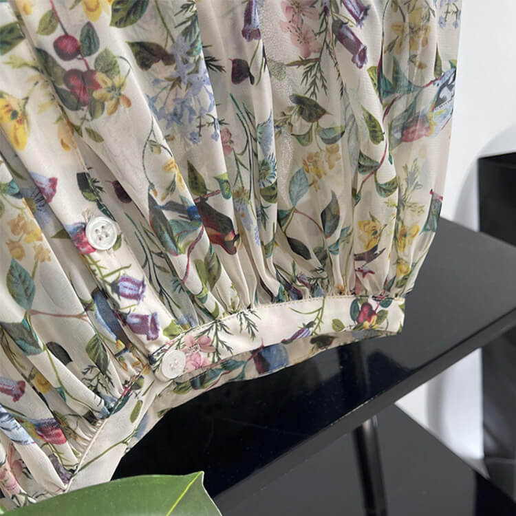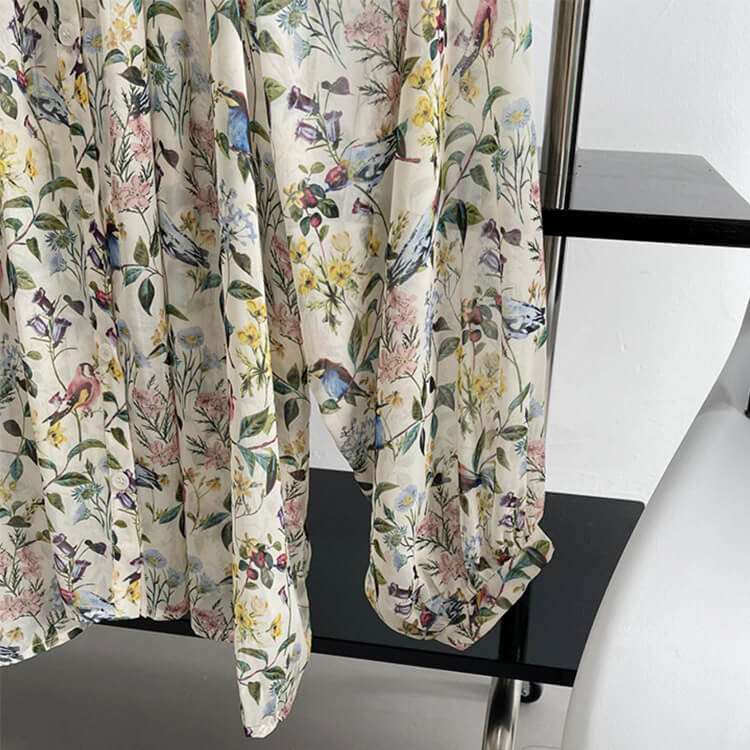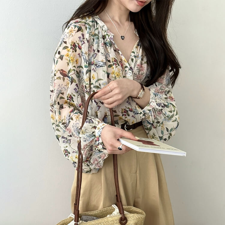 柔らかな薄手シフォン素材にカラフルなボタニカル風の花柄がきれいな長袖ブラウス。