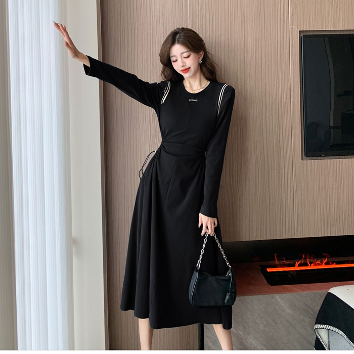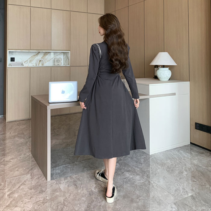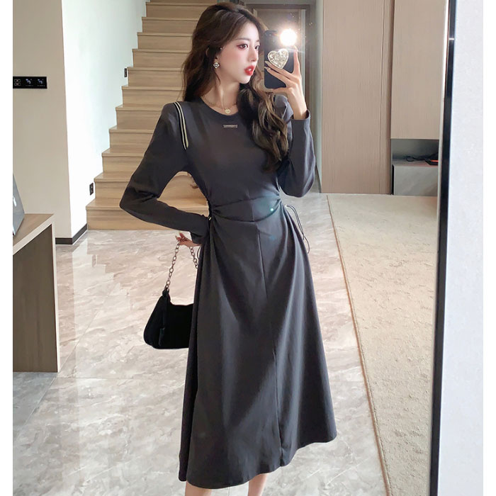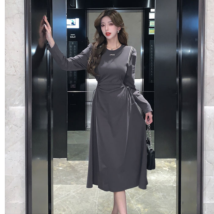 ウエストカットアウト 長袖フレアロングワンピース グレー 黒 カジュアル おしゃれ レディース きれいめ 韓国 服