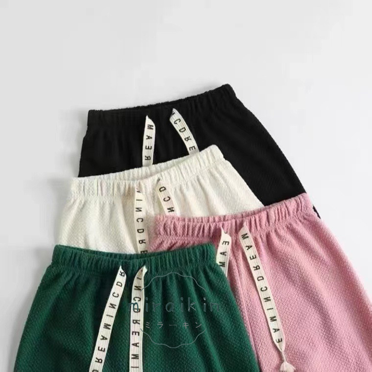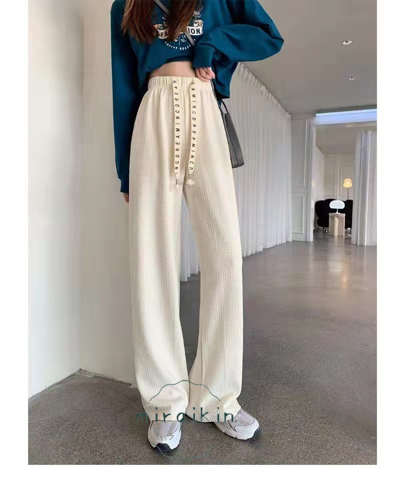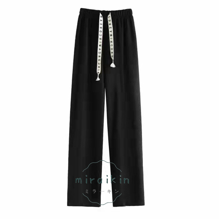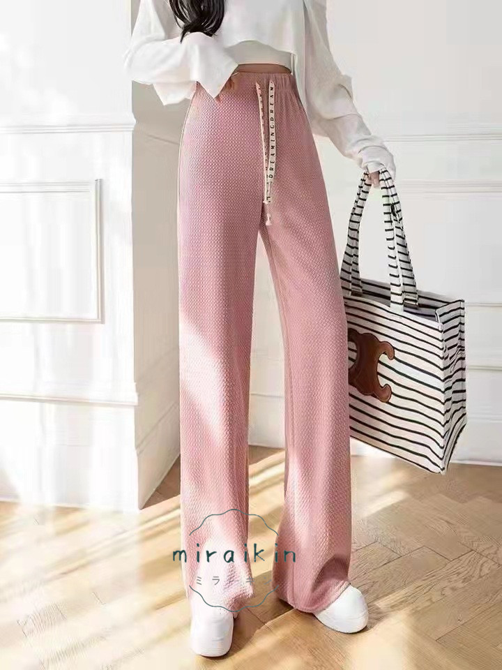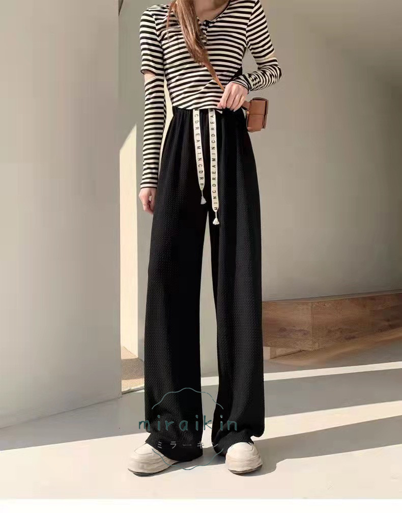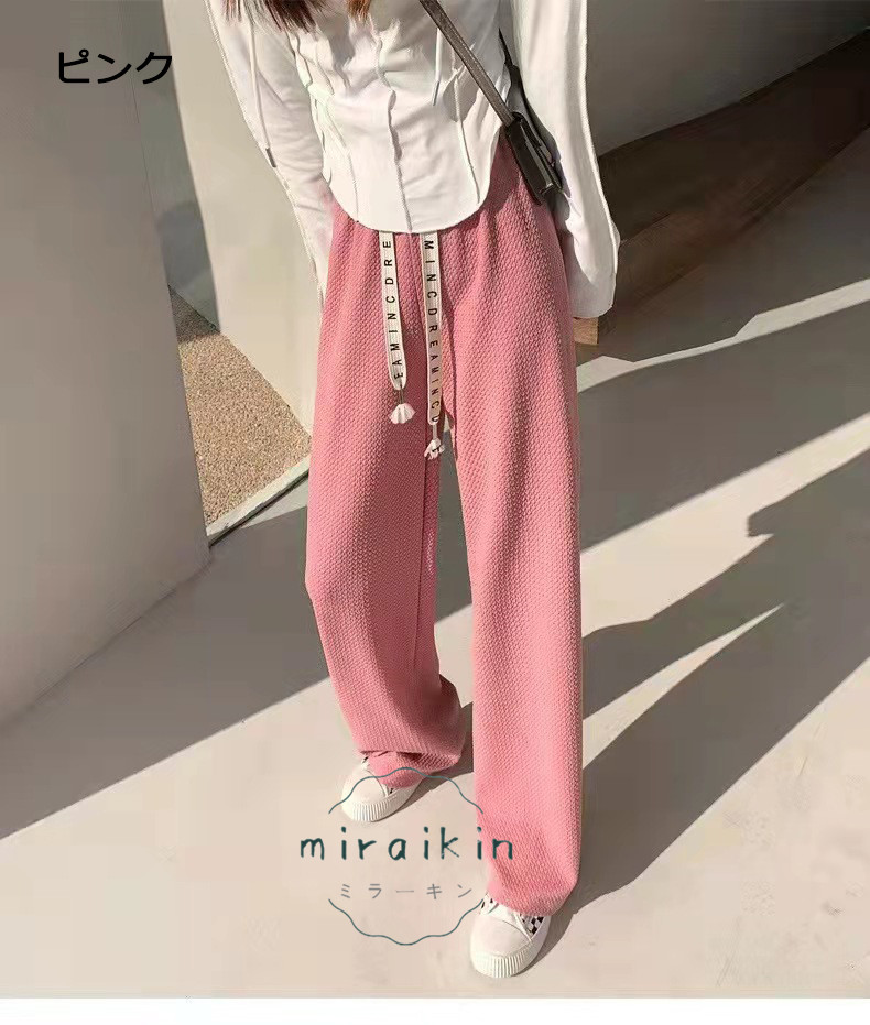 ワッフル調ストレートパンツ レディース 夏 楽ちんワイドパンツ ロゴ紐 韓国風