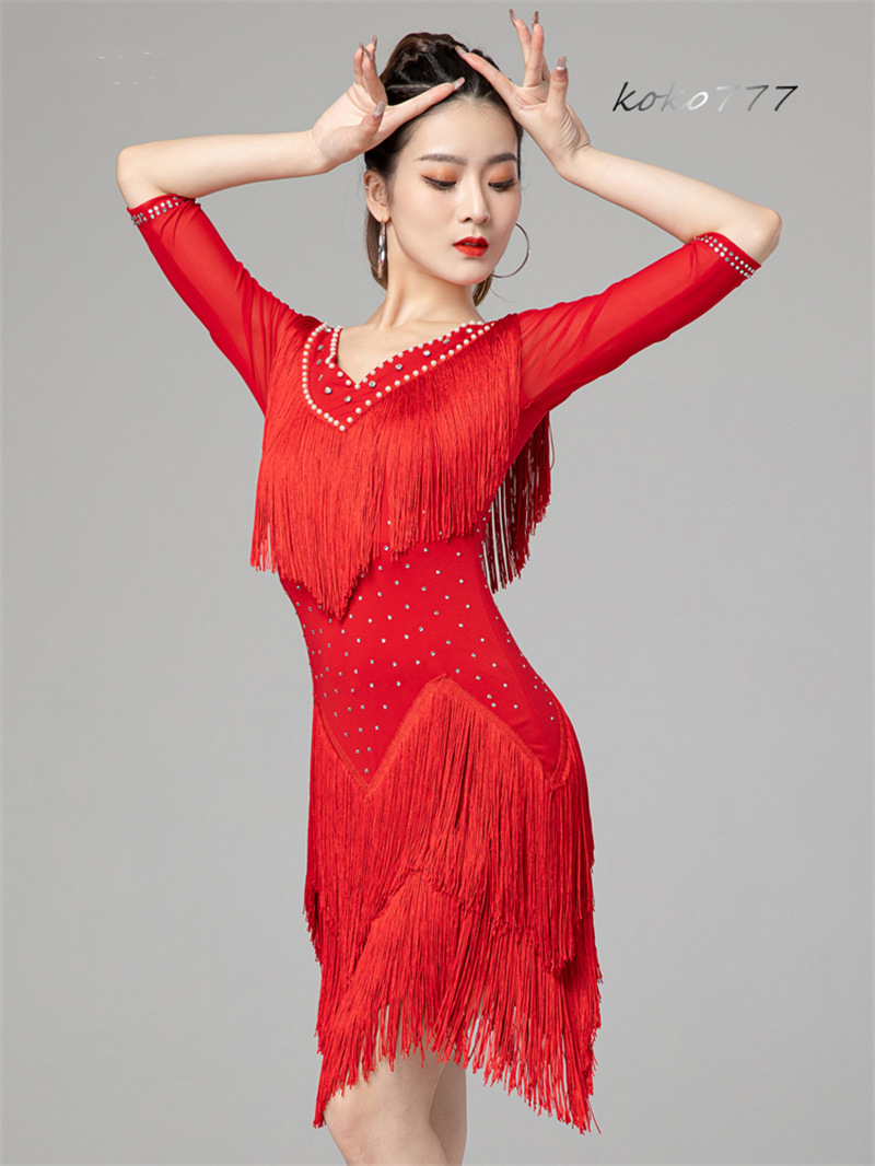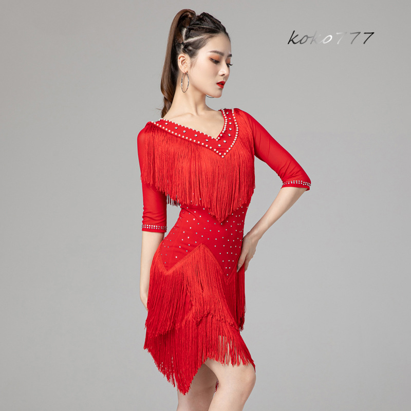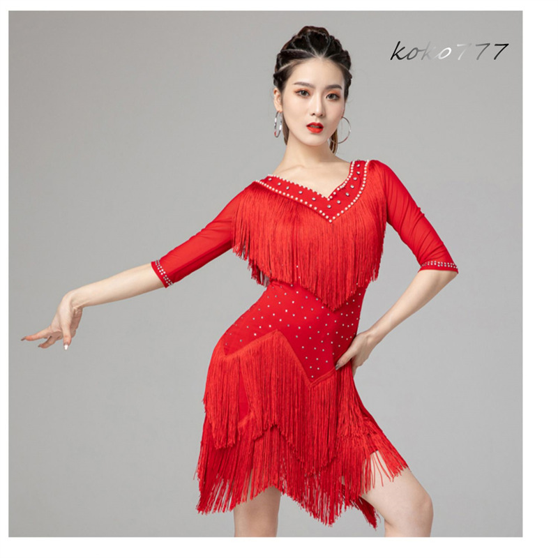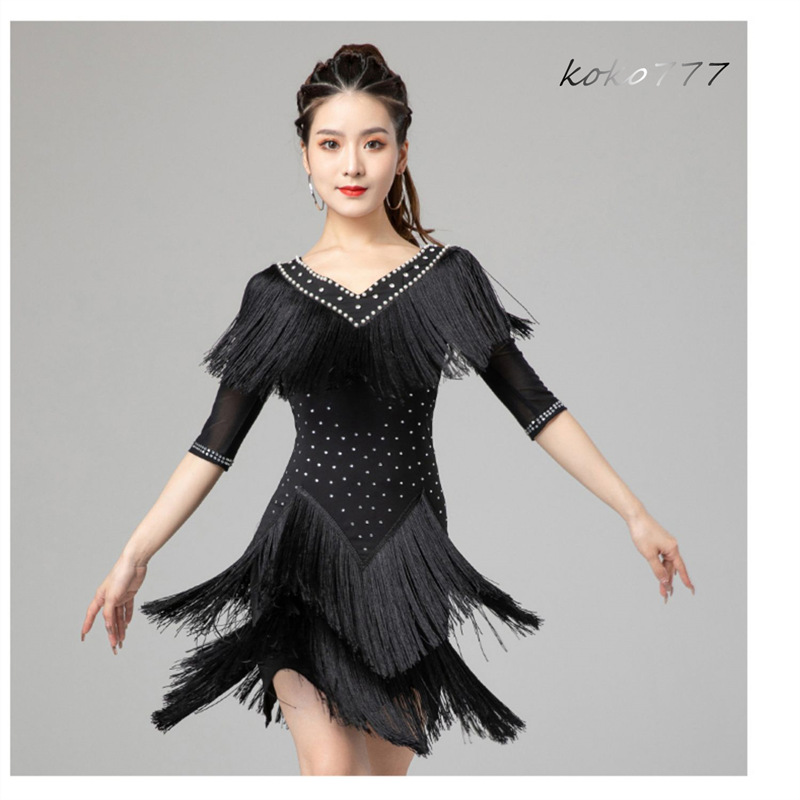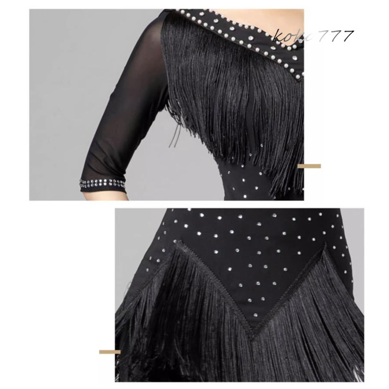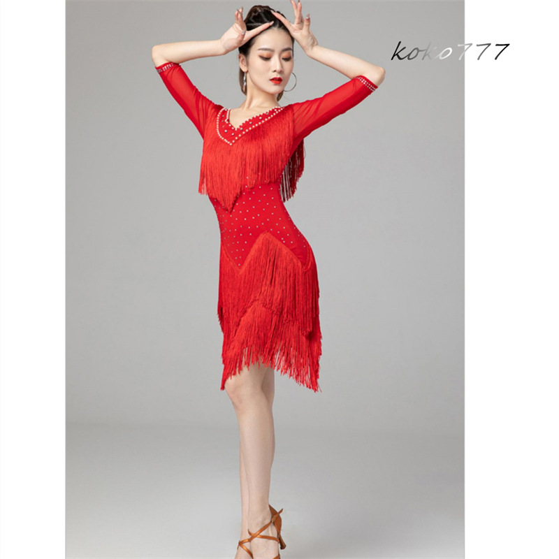 ドレス レディース ワンピース ラテンダンス ラインストーン フリンジ 公演 ひざ丈 発表会 コスチューム モダンダンス ワルツ 舞台衣装 洋服 パーティー