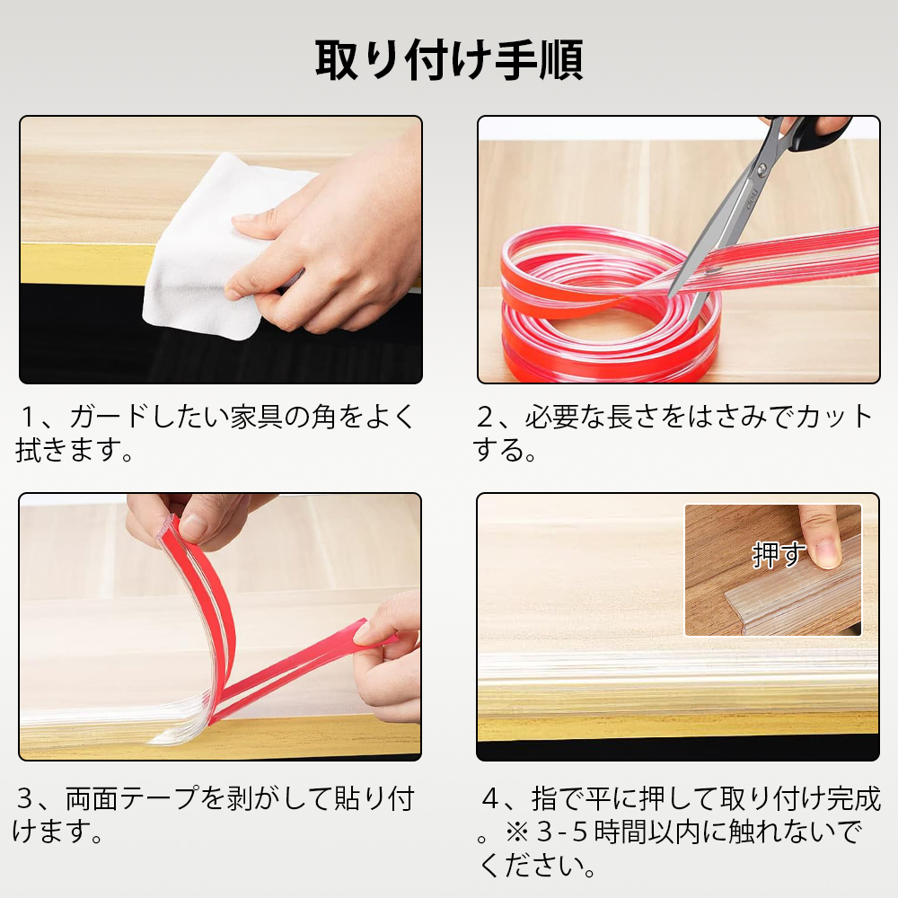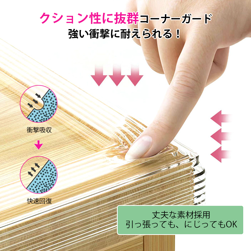 耐摩耗性、引っかき強度、耐油性などに優れている上、クッション性が高く、テーブル、キャビネット、棚、椅子の角や縁などに幅広く使用できます。