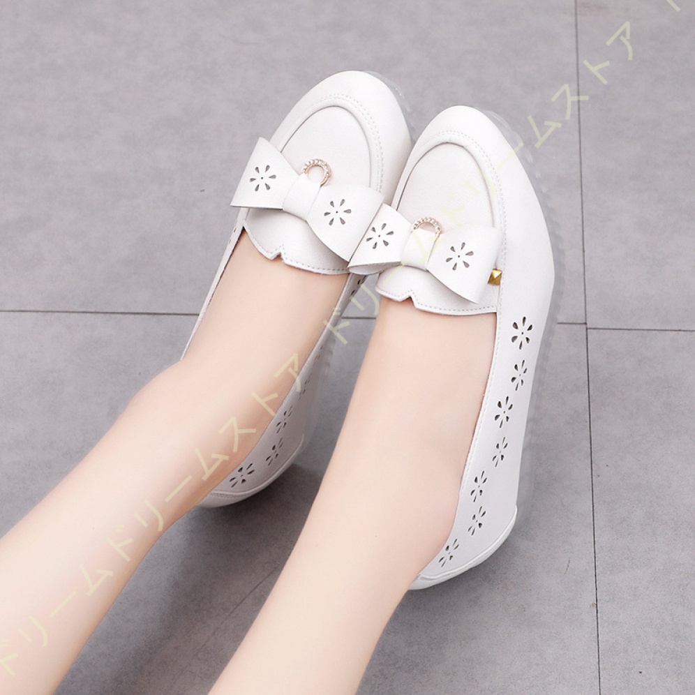 歩きやすく履きやすいウェッジヒール。ストームがついている、高低差を緩和し、足への負担を軽減。