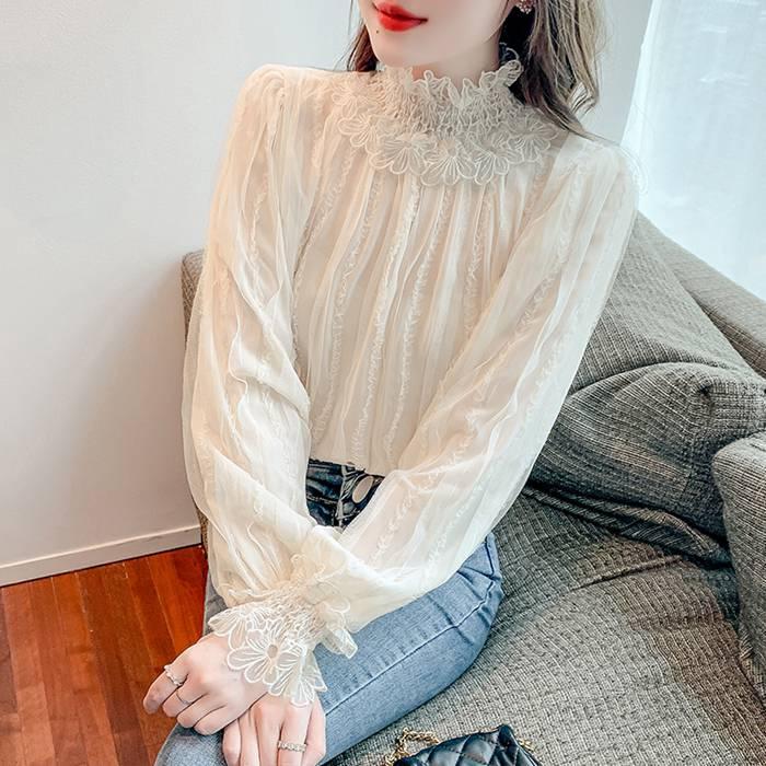 レースブラウス 長袖 シフォンシャツ 花柄 春秋 トップス インナー シャツブラウス レディース プチハイネック フリル トップス 着やせ おしゃれ プルオーバー インナー 透け感