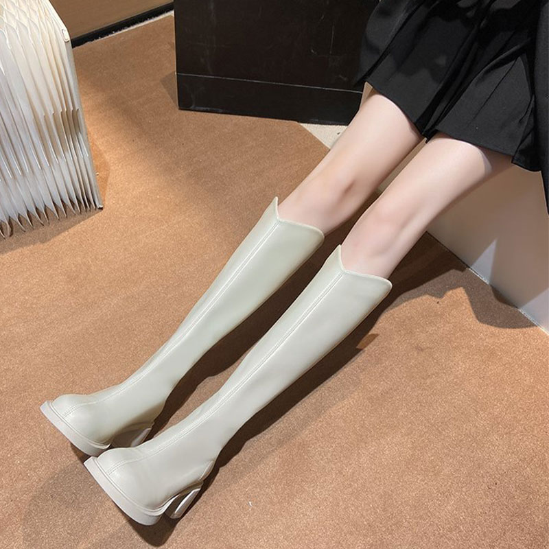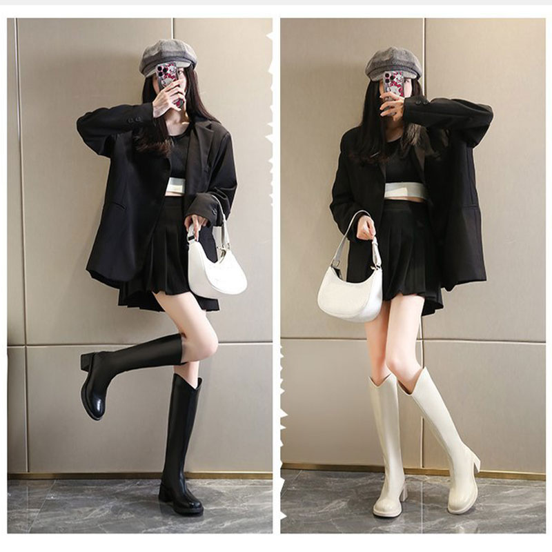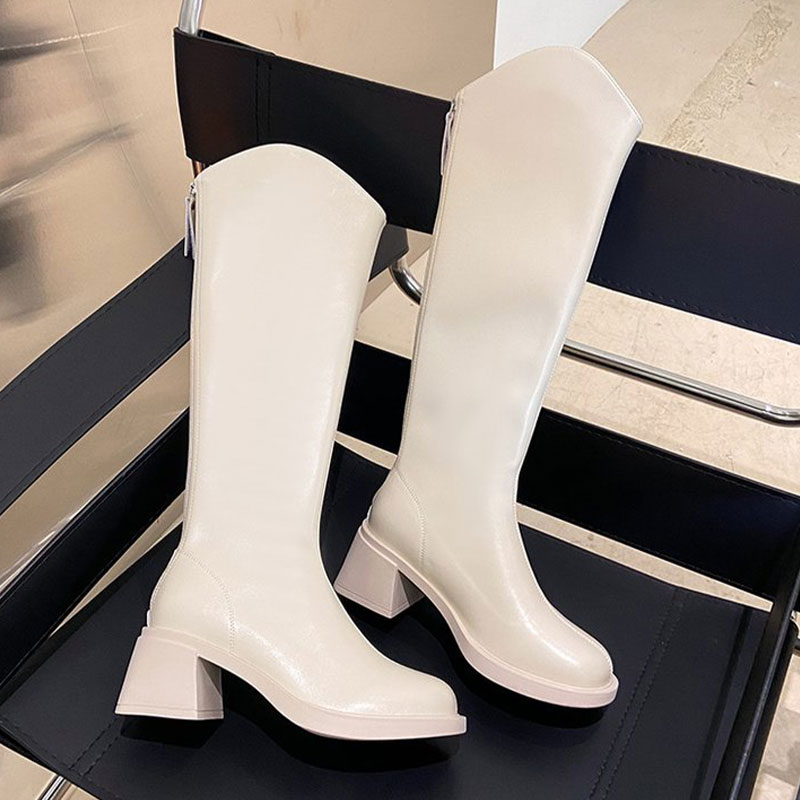 ストレッチブーツ 膝下 ジョッキーブーツ バックジップ ギザギザ厚底 PUブーツ 太ヒール おでこ靴 履きやすい