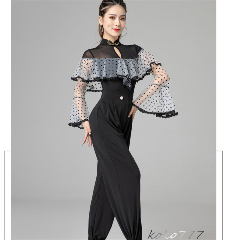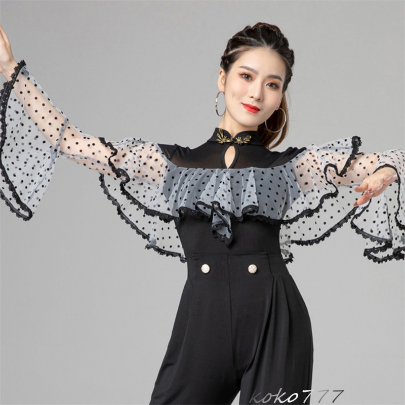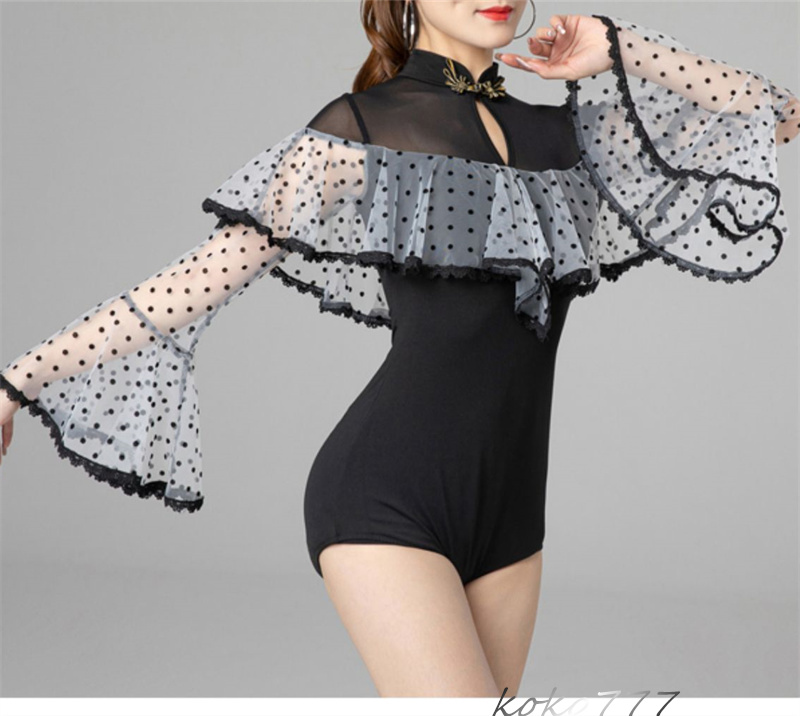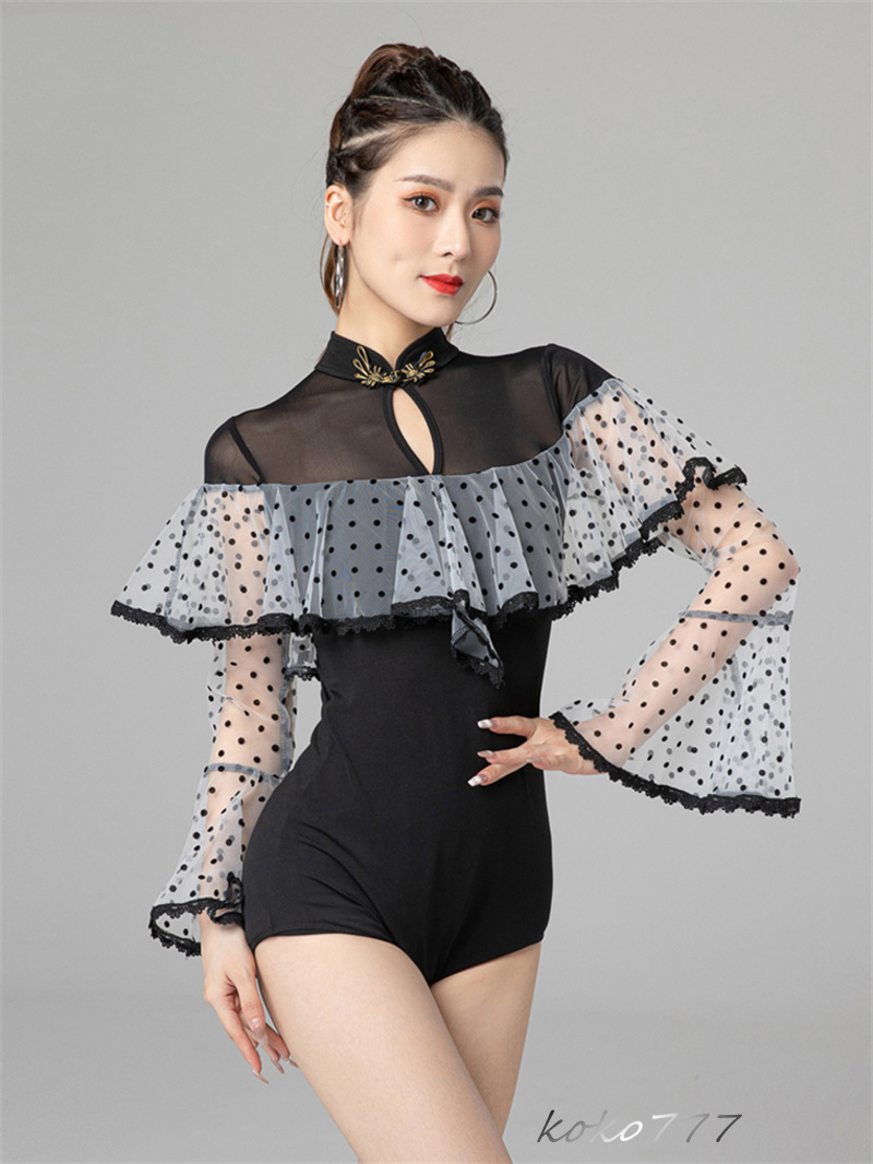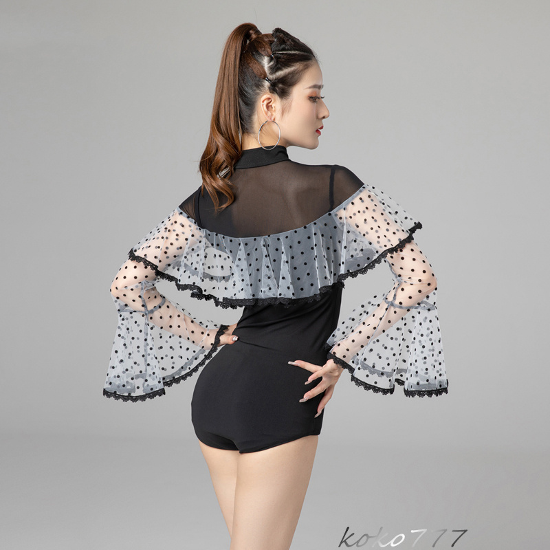 レディース レオタード 上衣 フリンジ ラテンダンス ウェア 学園祭 発表会 部活 トップス モダンダンス 舞台衣装 練習着 体操服 ロンパース 公演 ドット柄