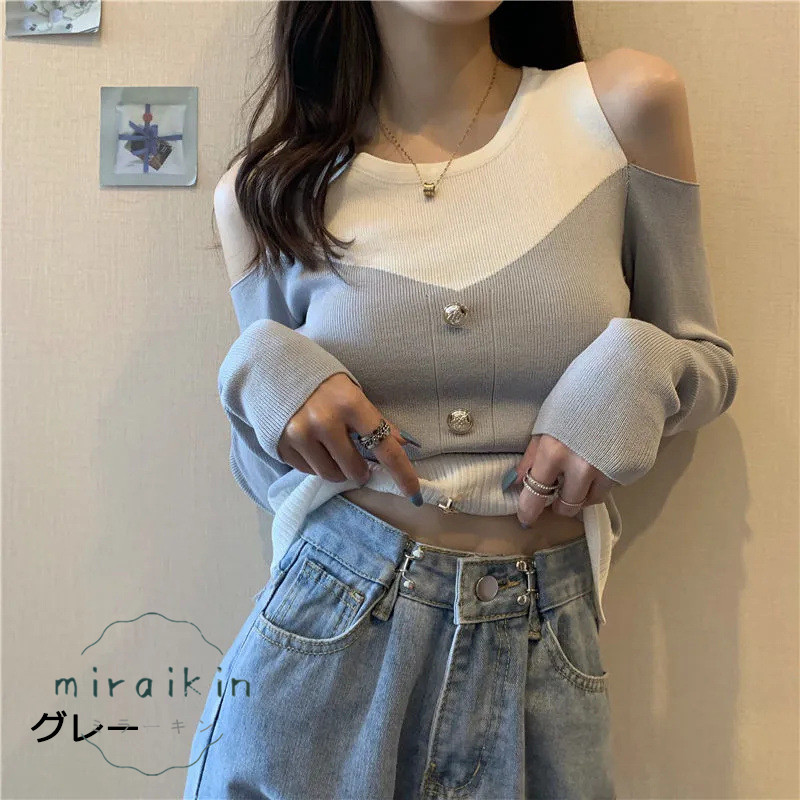 ニットトップス 長袖 リブニット 肩出し ボタンデザイン ドッキング セーター おしゃれ 韓国ファッション オフショルダー セクシー オシャレ 綺麗 送料無料