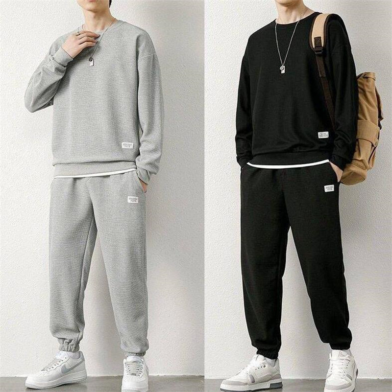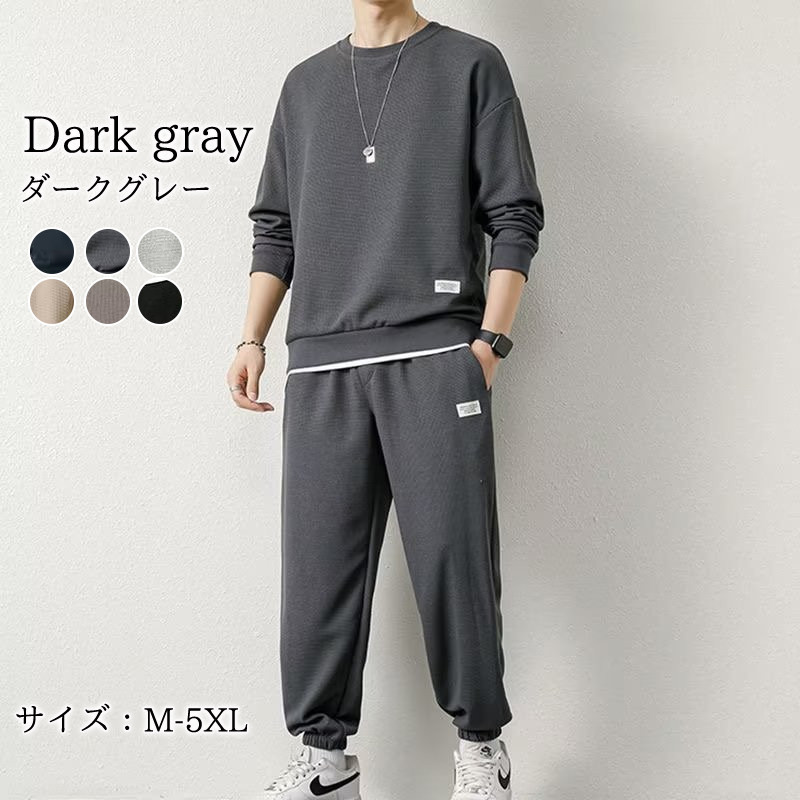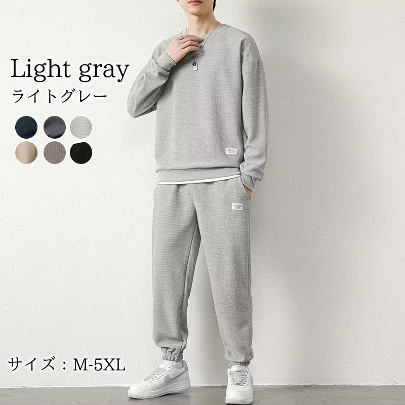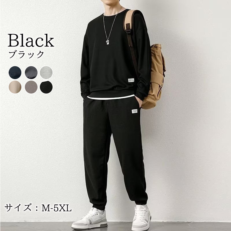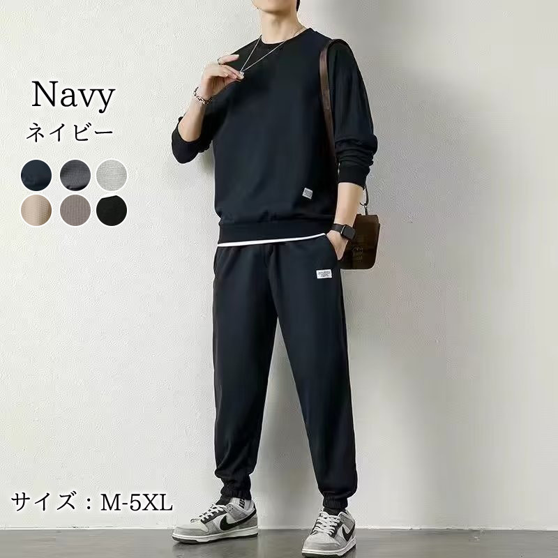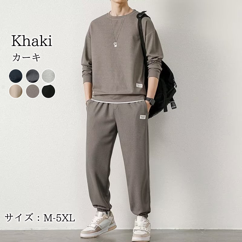 秋の長袖プルオーバーパーカーとロング丈スエットパンツのオシャレなセットアップジャージです。