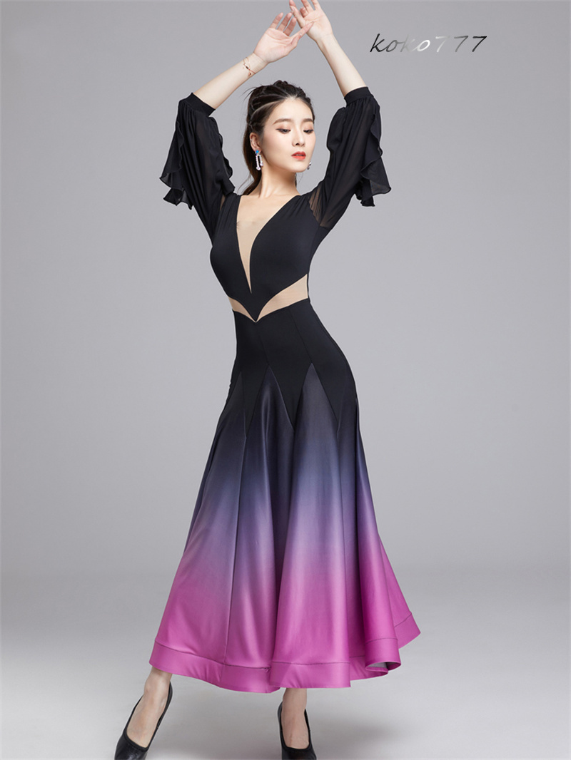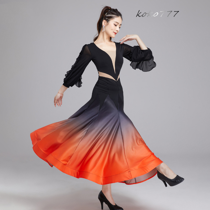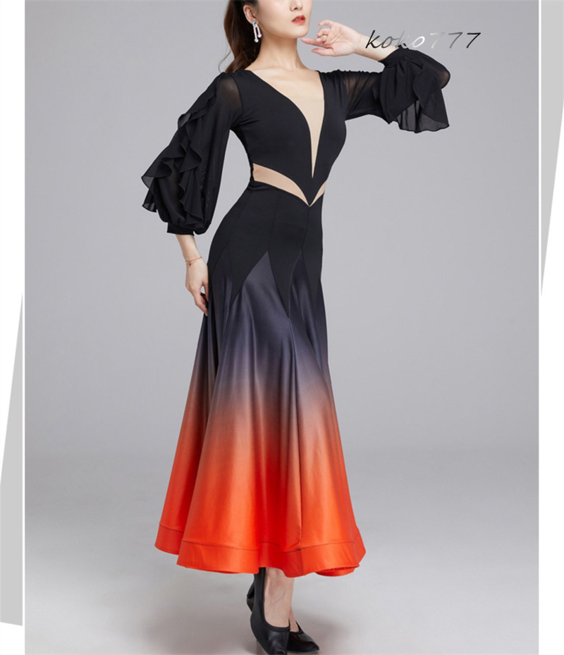 ロングドレス レディース ワンピース ラテンダンス フリル パーティー ナショナルダンス グラデーション 公演 部活 洋服 発表会 舞台衣装 モダンダンス ワルツ