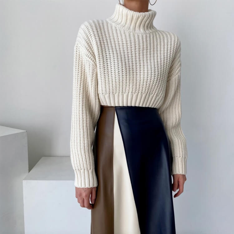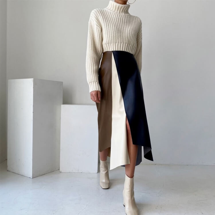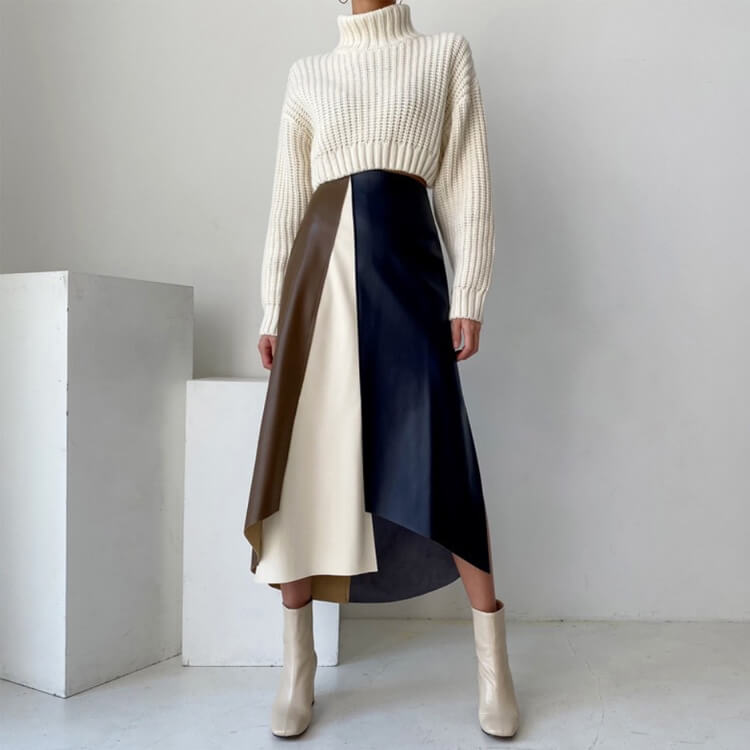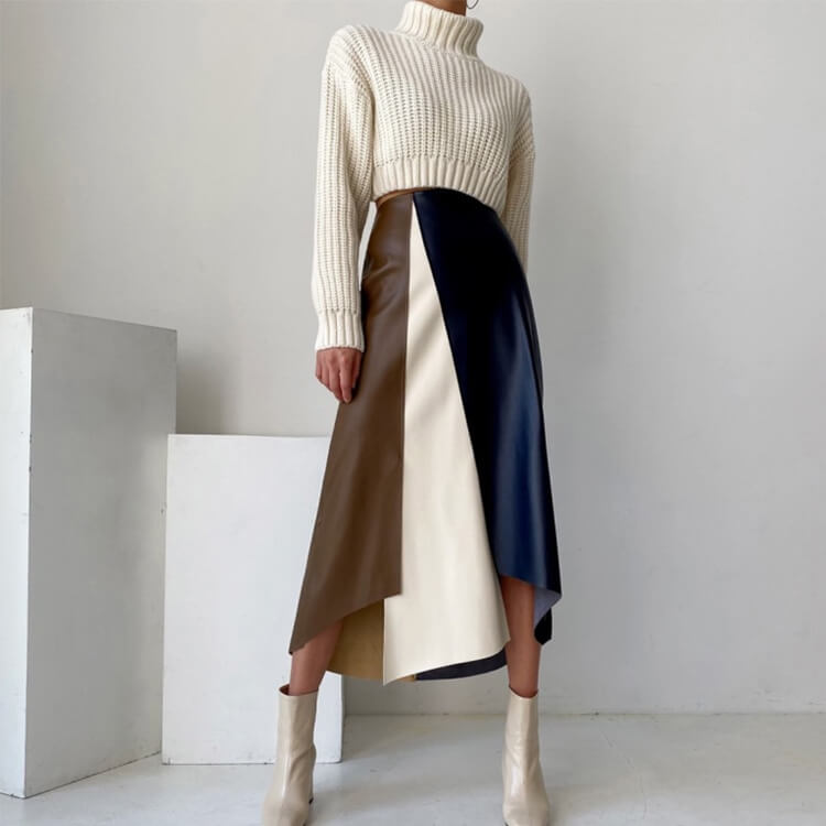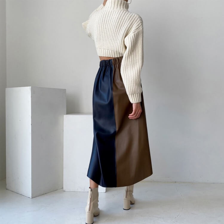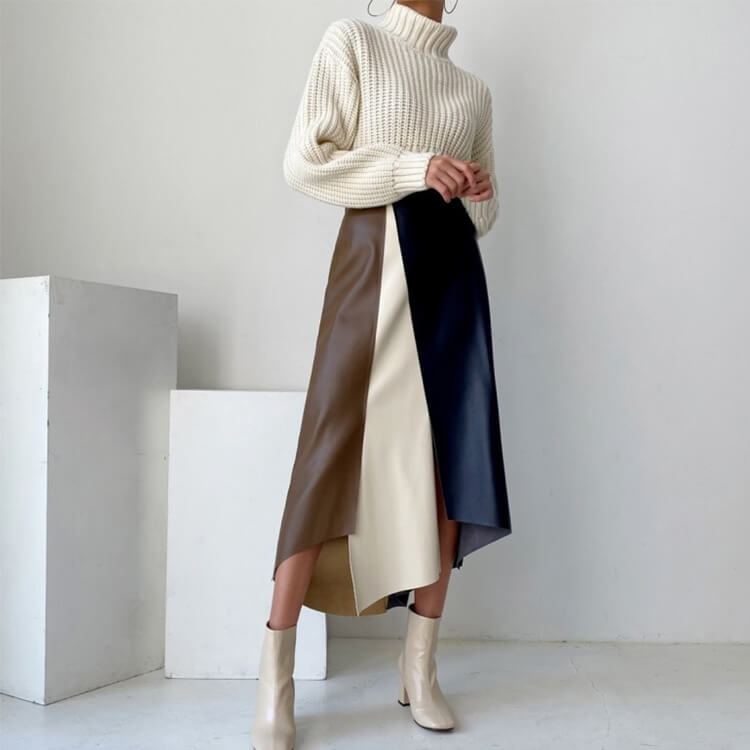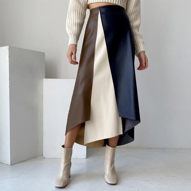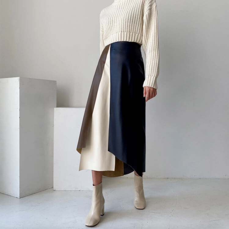 ブラウンとホワイトとネイビーのフェイクレザーを切り替えアンシンメトリーデザインが個性的なミモレ丈スカート。