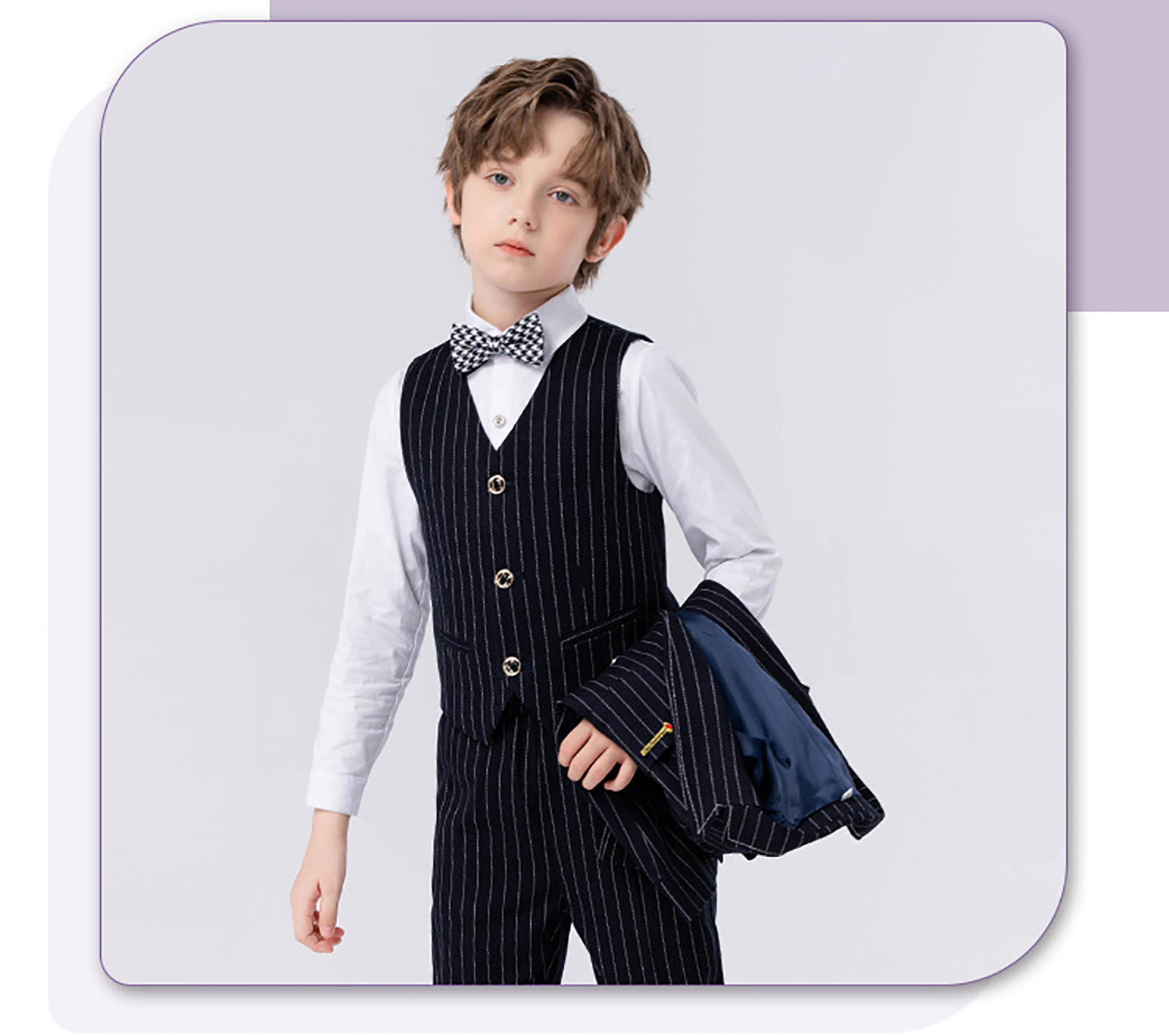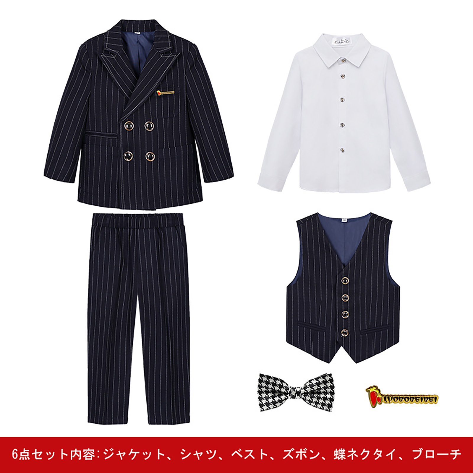 セット内容:ジャケット、ベスト、シャツ、パンツ、蝶ネクタイ、ブローチ
