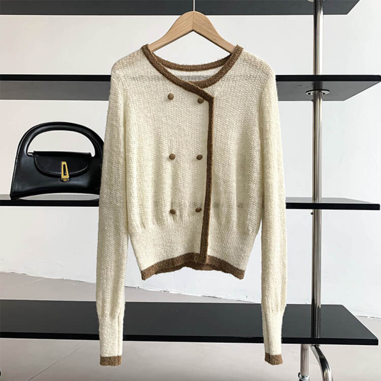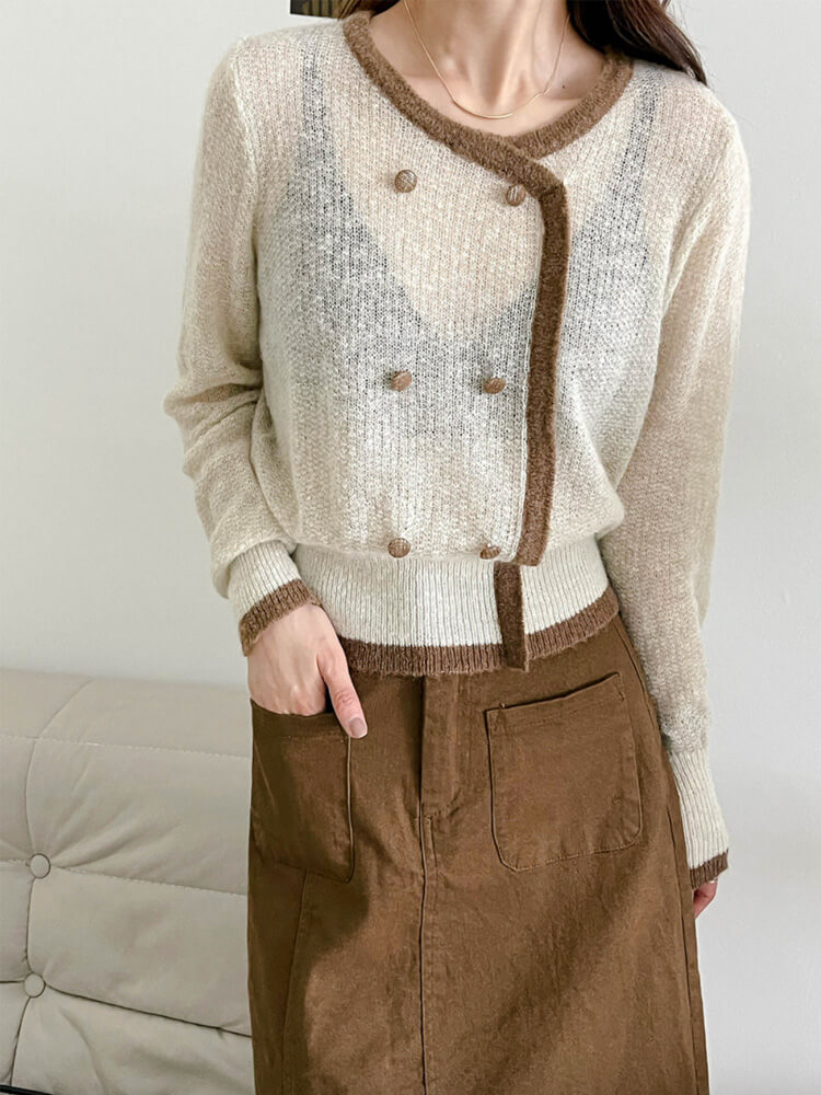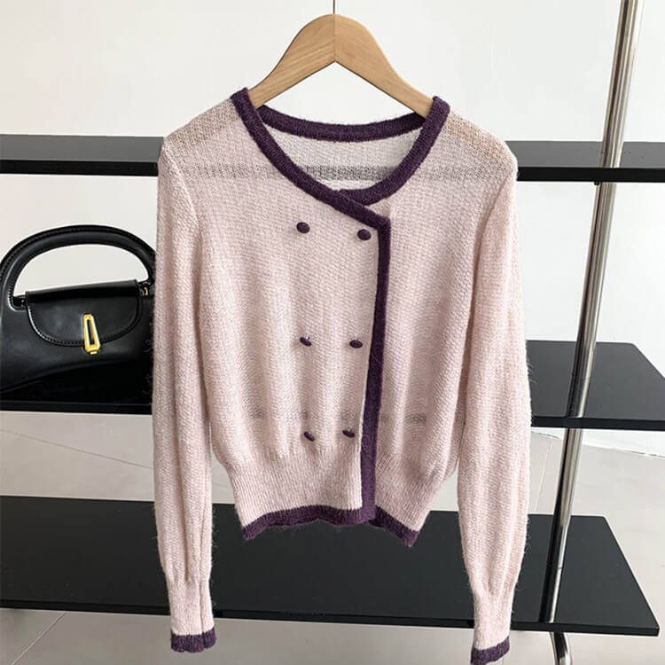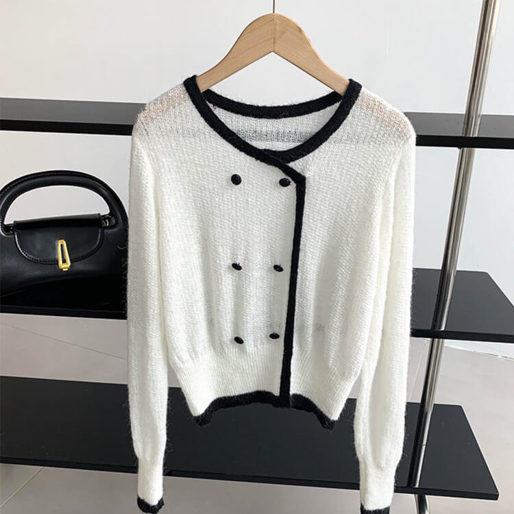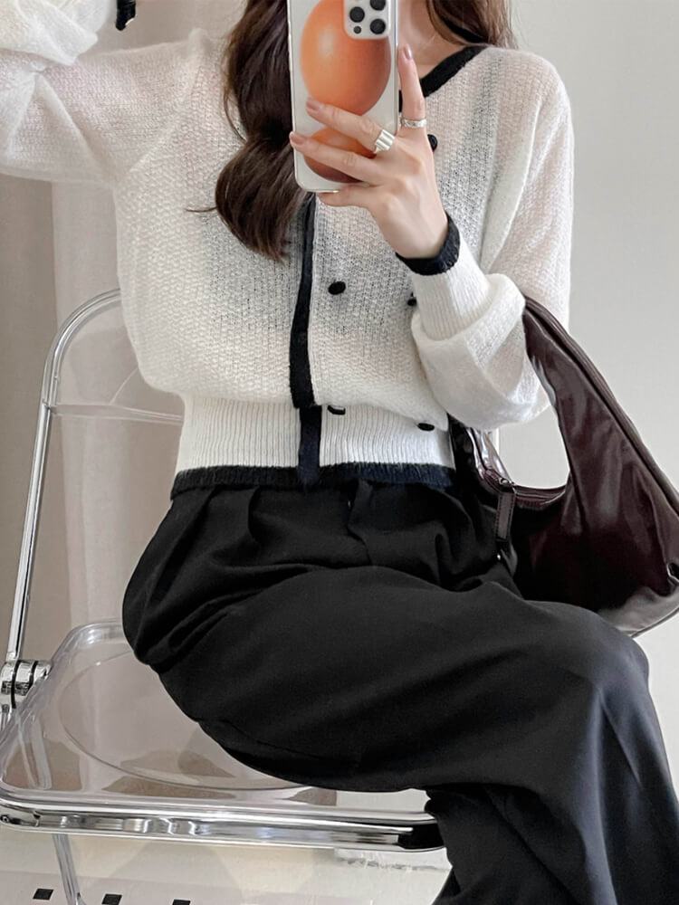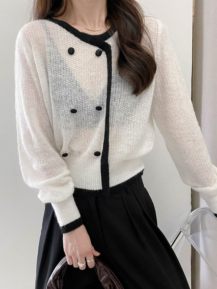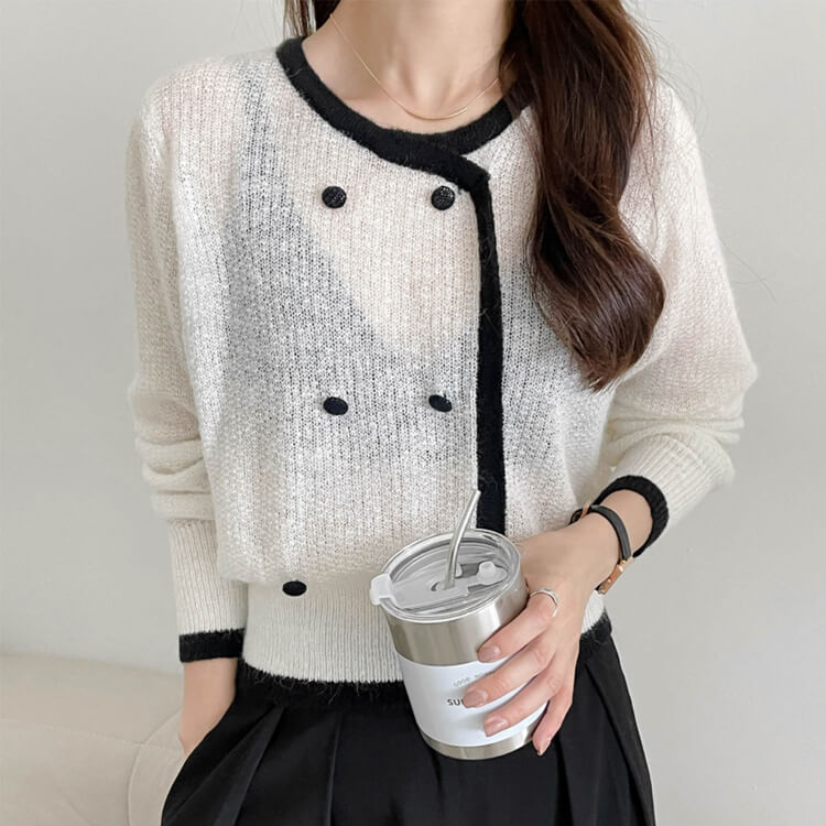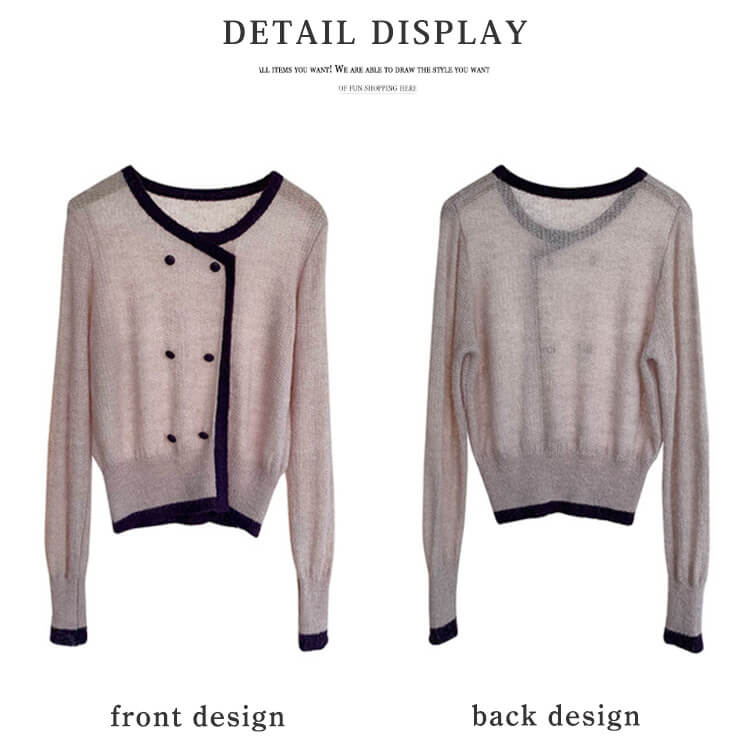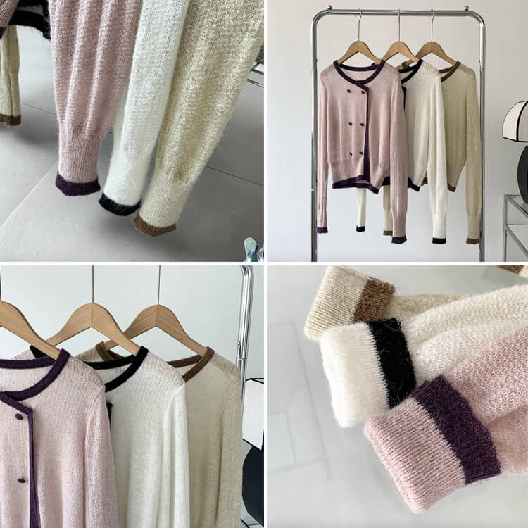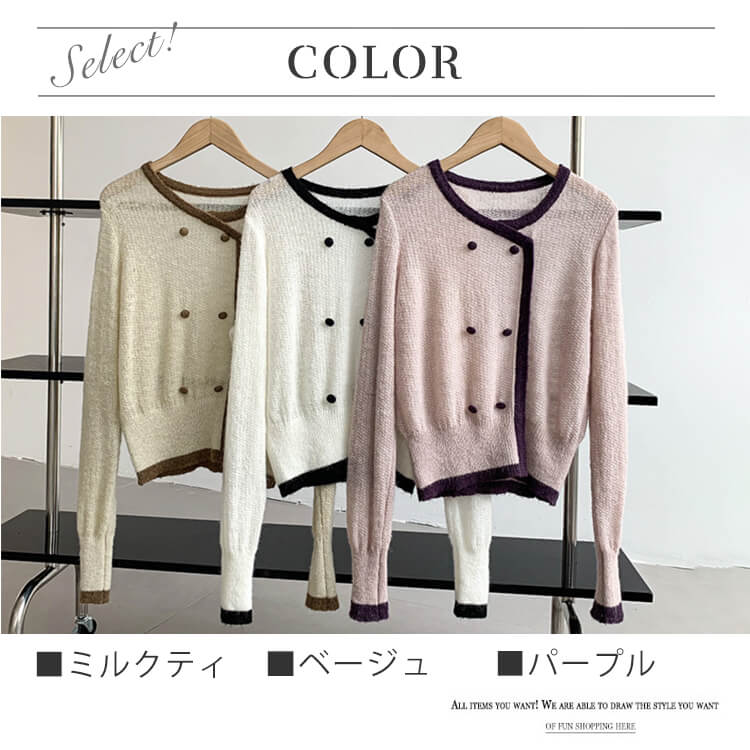 カーディガン風に合わせたアンシンメトリーデザインに縁取りをバイカラーに。