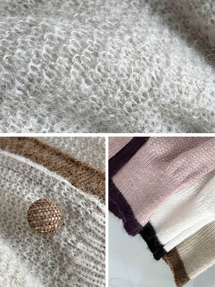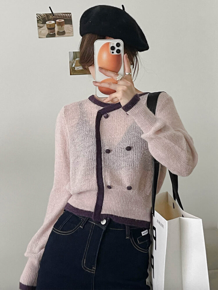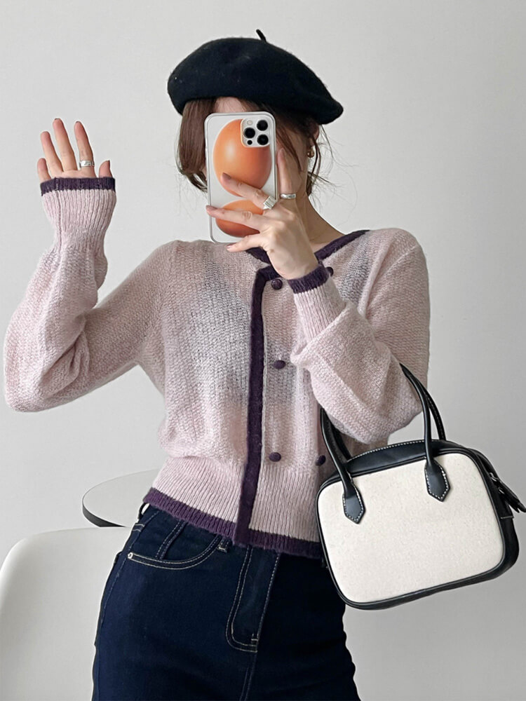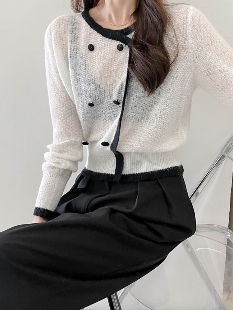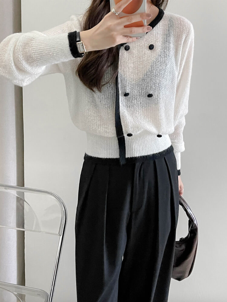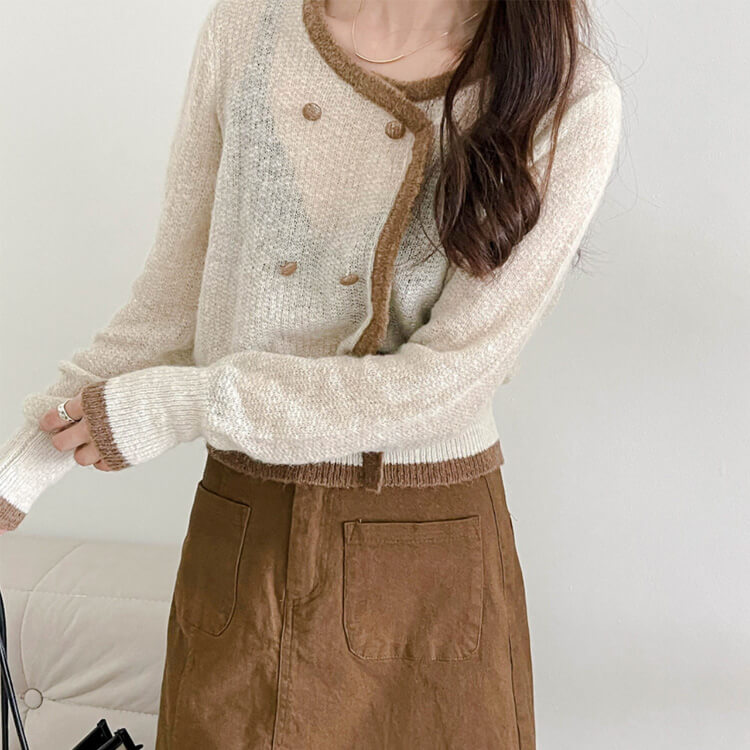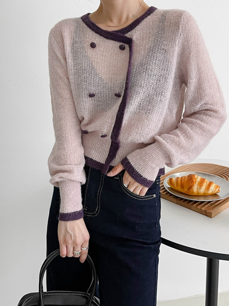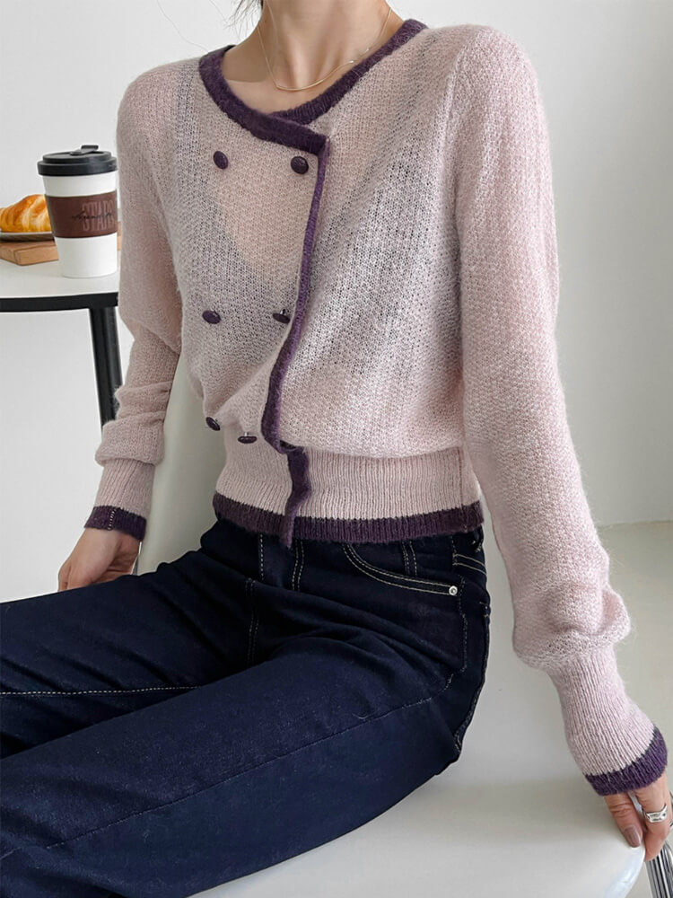 カーディガン風に合わせたアンシンメトリーデザインに縁取りをバイカラーに。