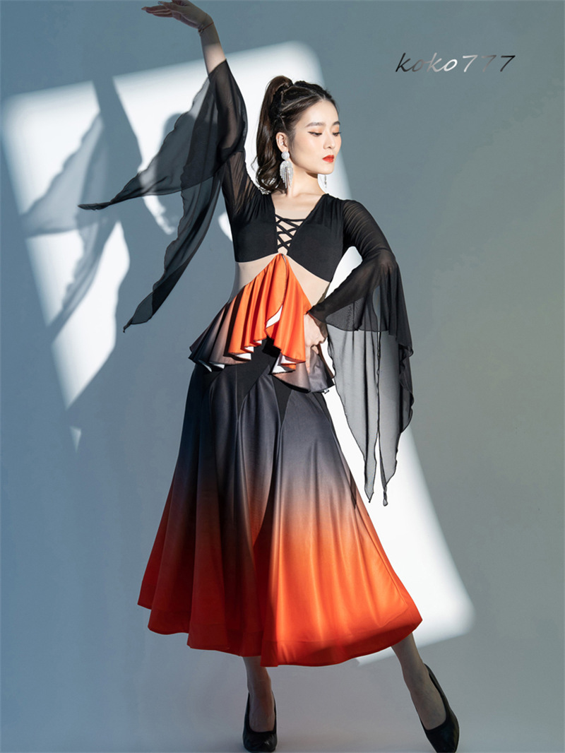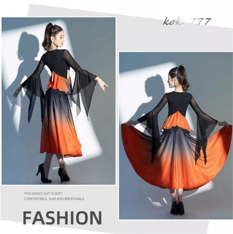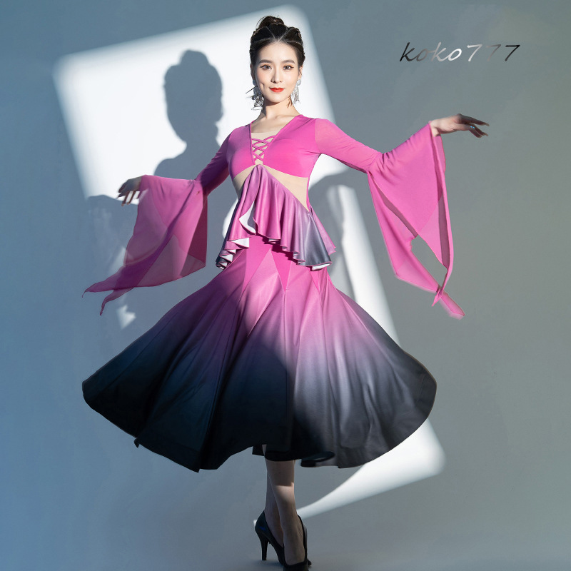 ロングドレス レディース ワンピース ラテンダンス フリル フレア袖 ワルツ グラデーション 舞台衣装 モダンダンス パーティー 公演 発表会 洋服 社交ダンス