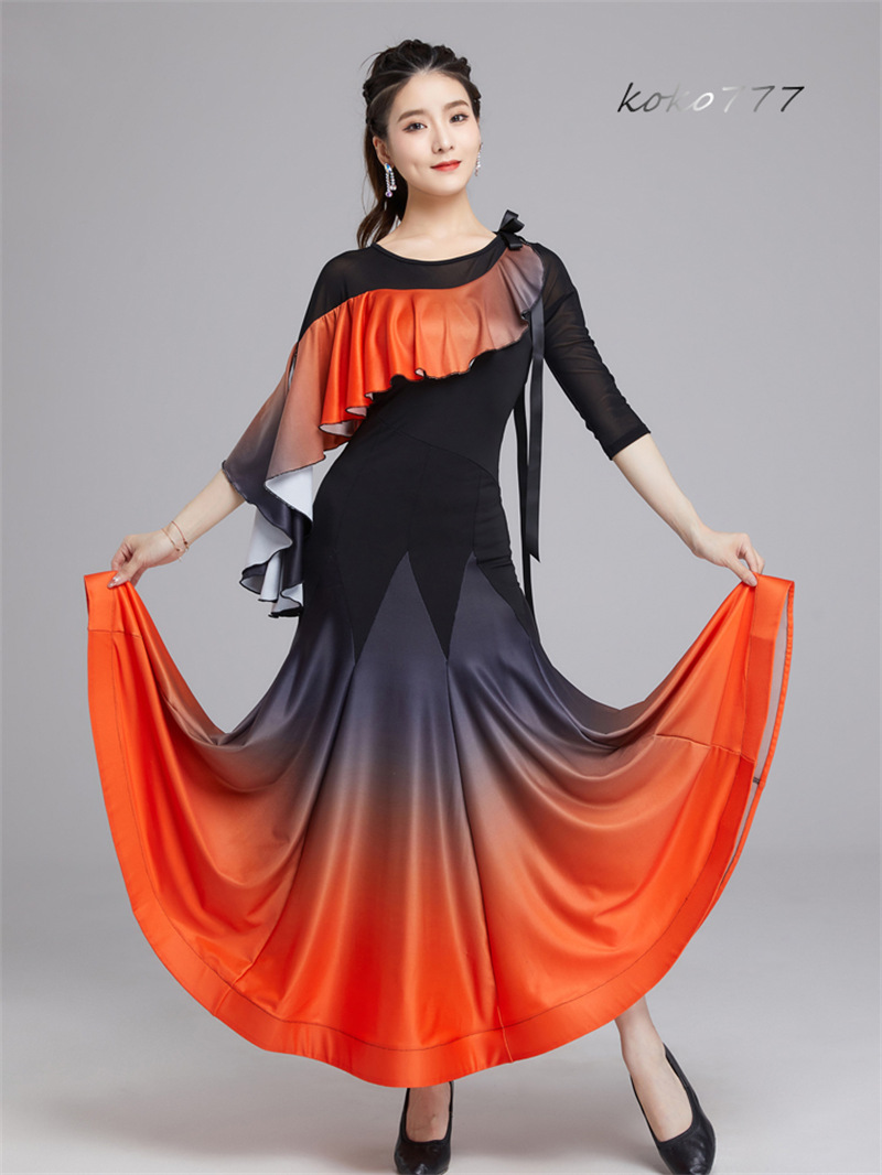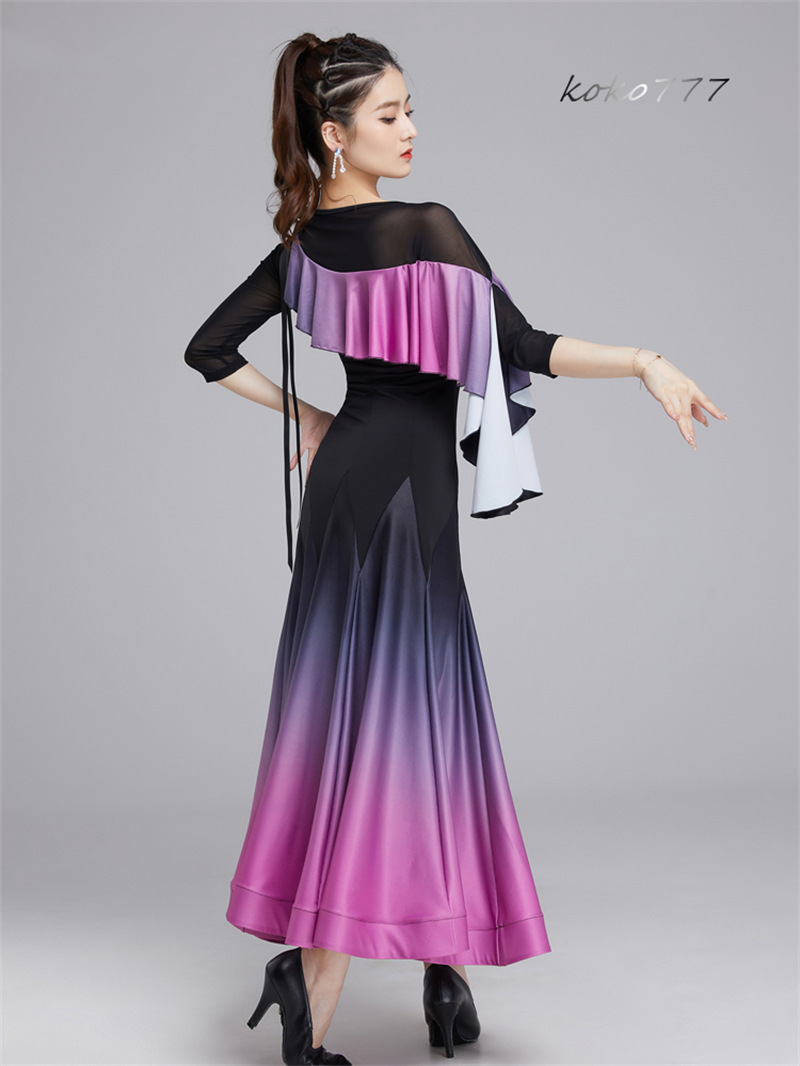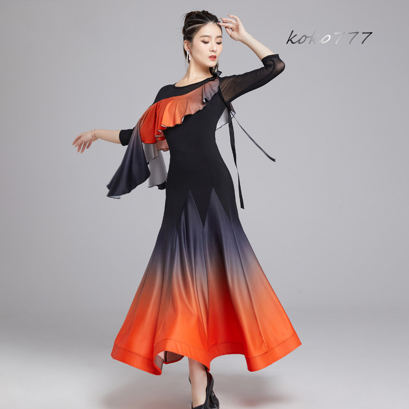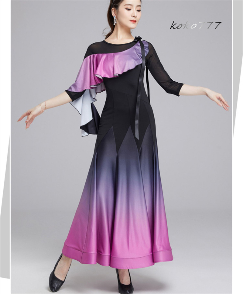 ロングドレス レディース ワンピース ラテンダンス フリル リボン 洋服 ナショナルダンス 発表会 パーティー ワルツ モダンダンス グラデーション 舞台衣装 公演