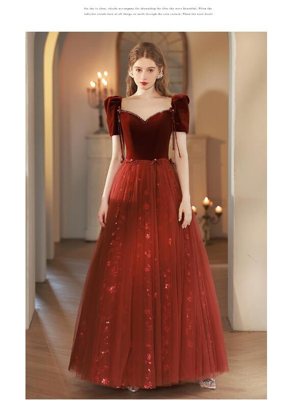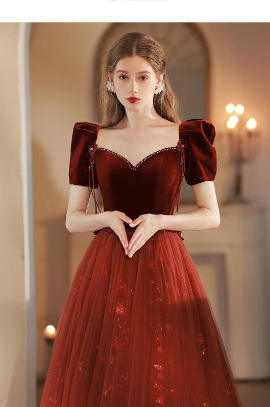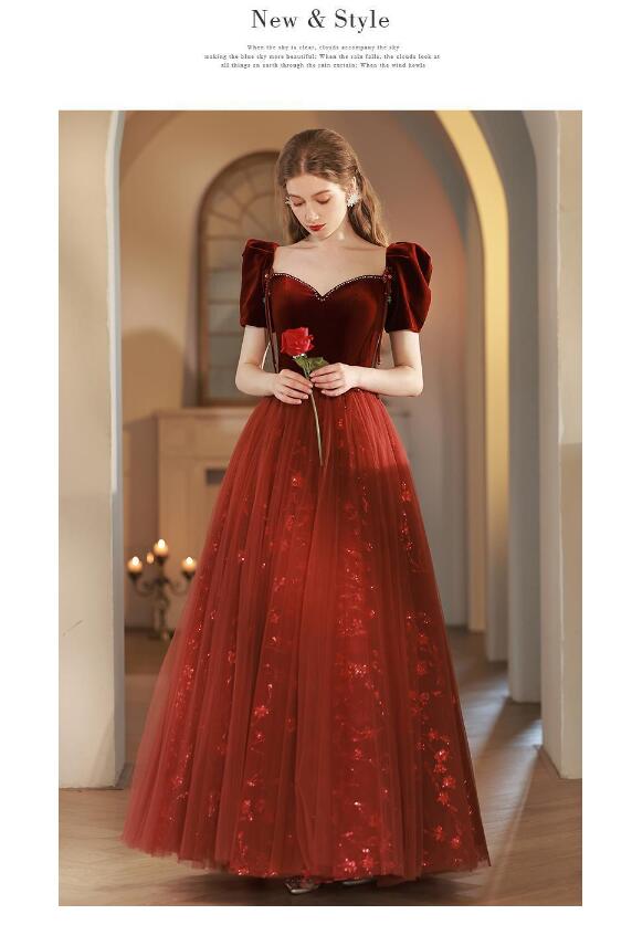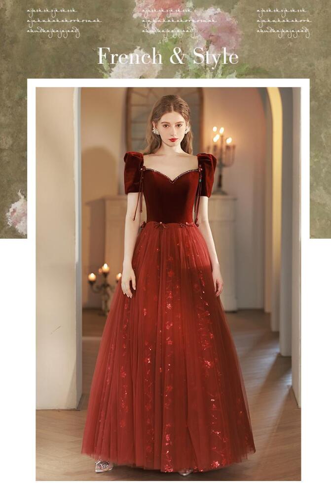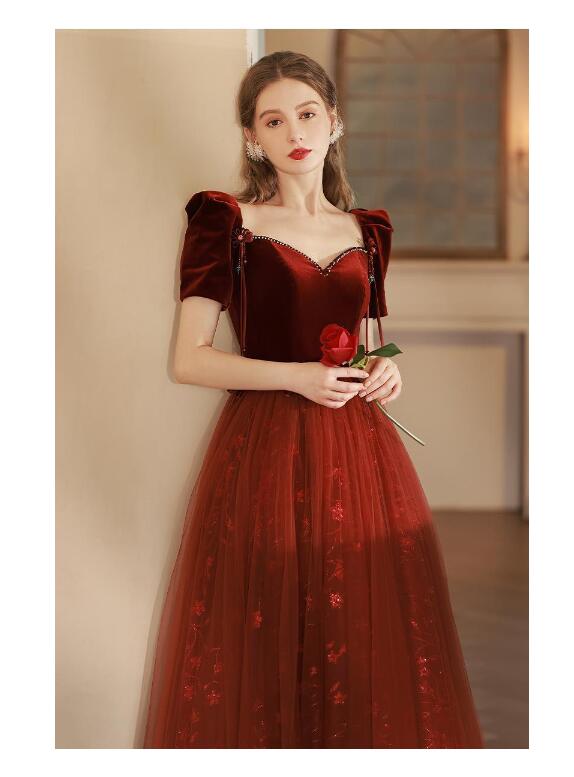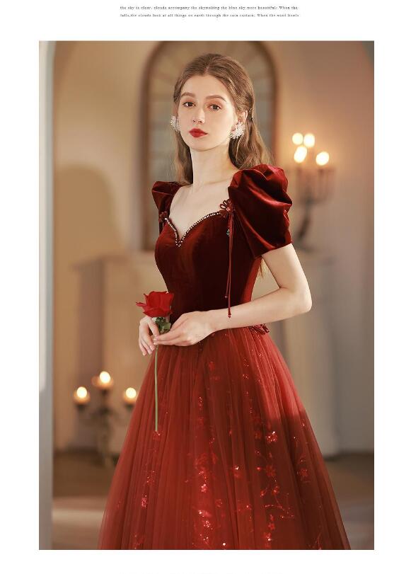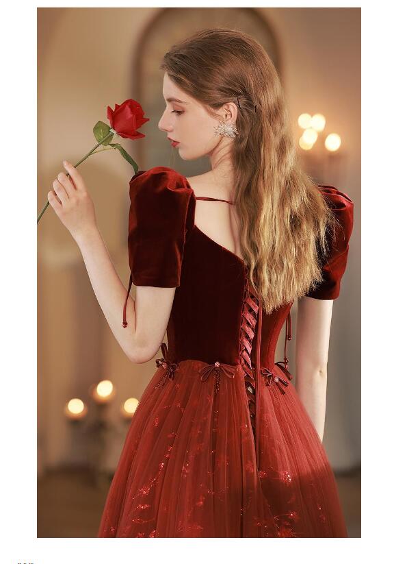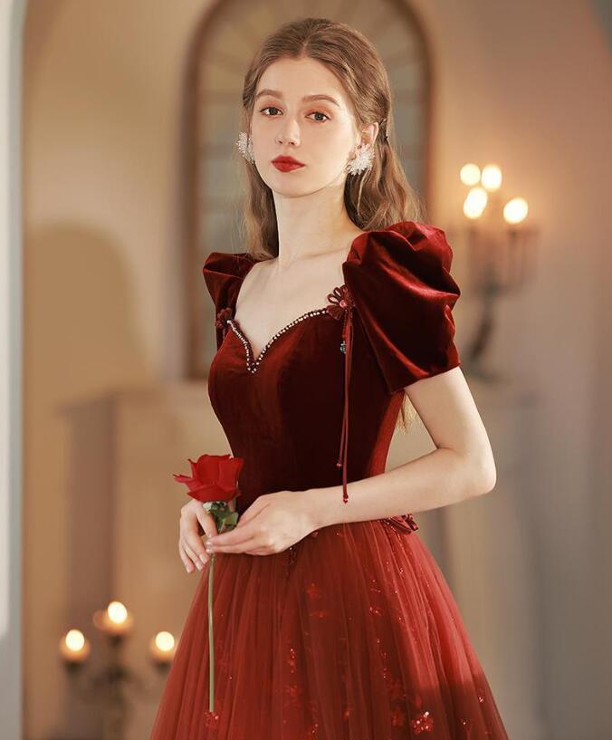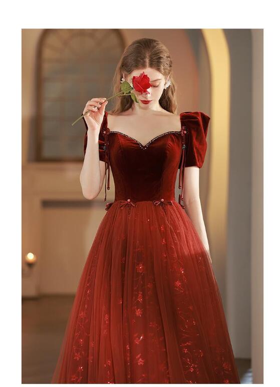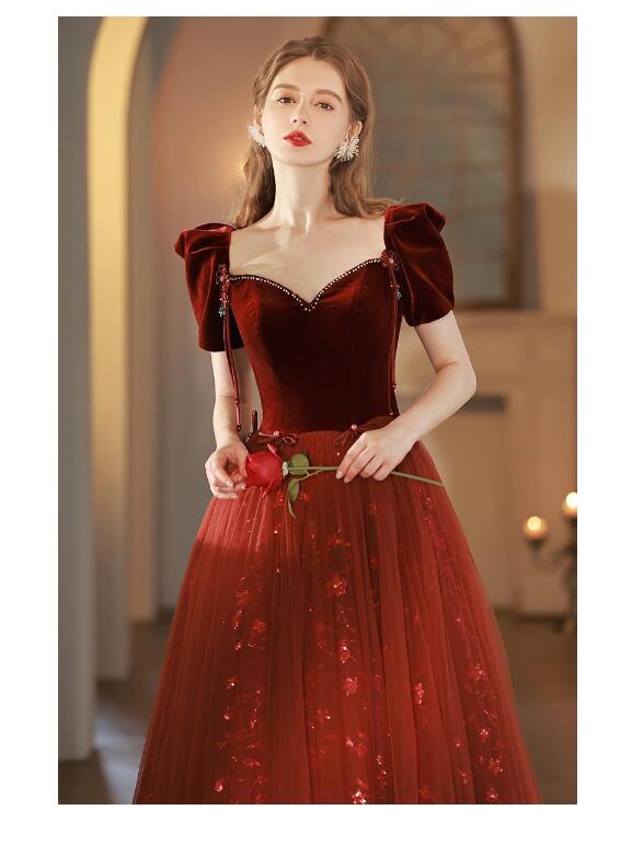 イブニングドレス 発表会ドレス パフスリーブ ベロア チュール ドッキング パーティードレス 結婚式ドレス 演奏会ドレス ワイン赤