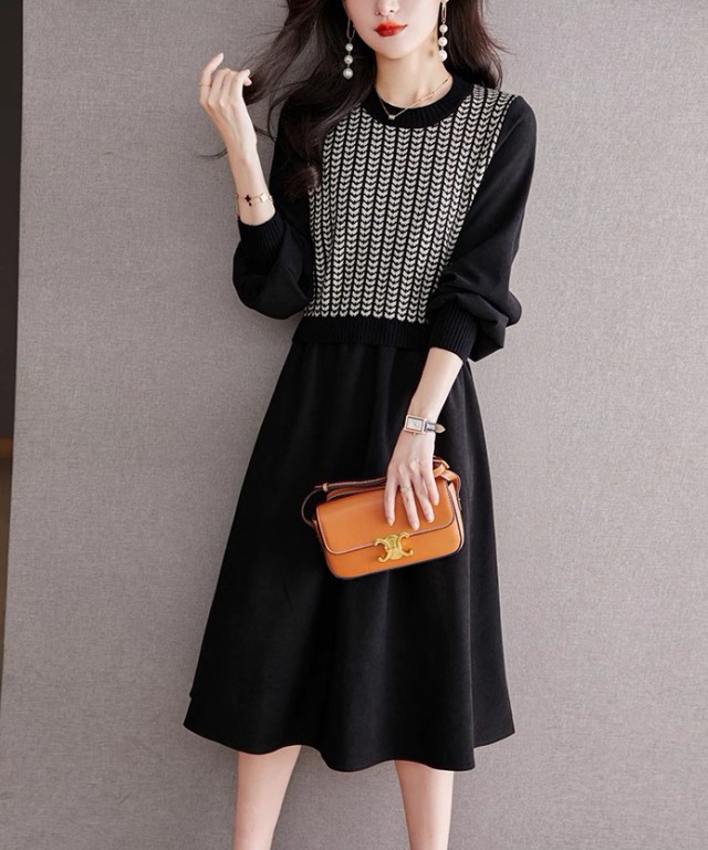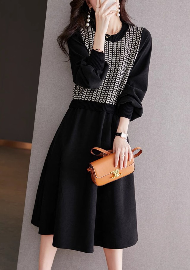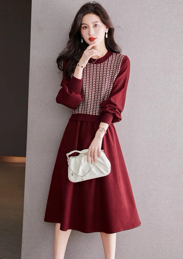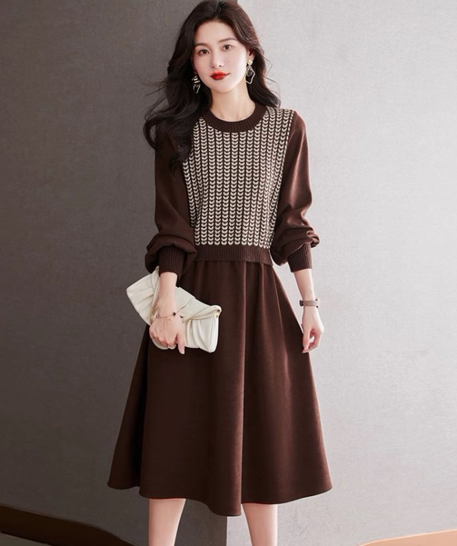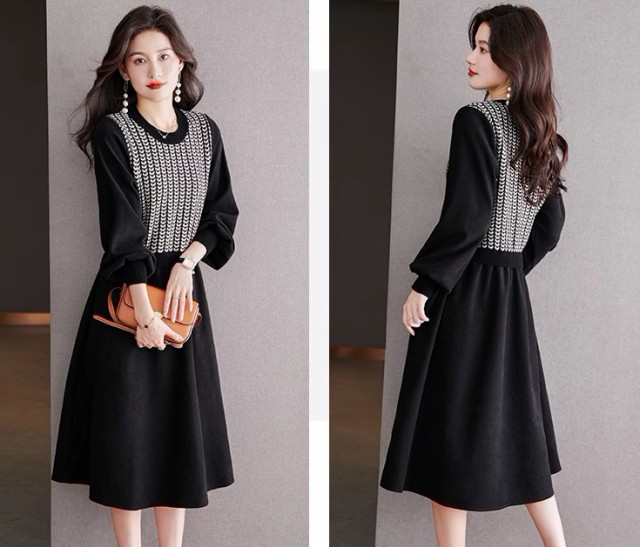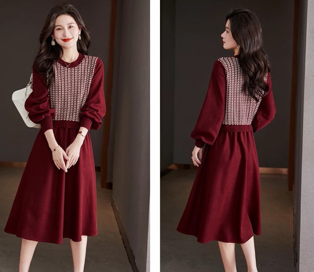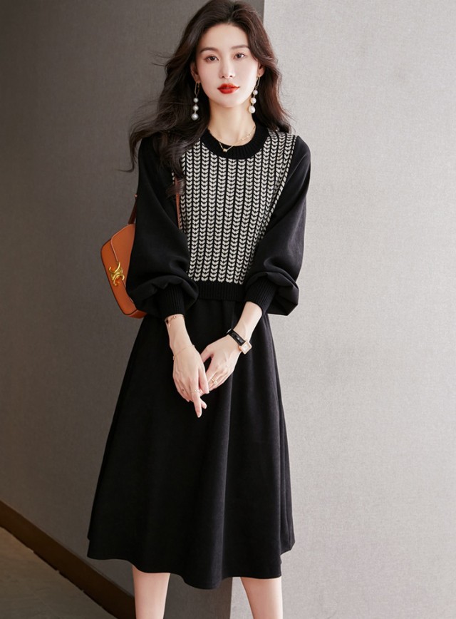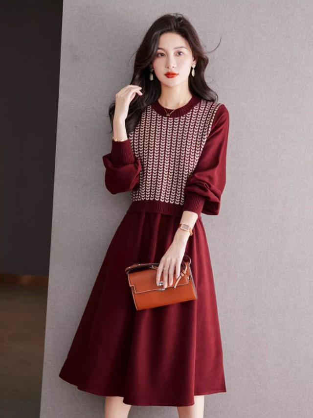 レイヤード風ワンピース ニットワンピース 秋冬 ワンピース レディース 長袖 膝丈 パフスリーブ 大きいサイズ 3L きれいめ カジュアル 黒 赤 レトロ