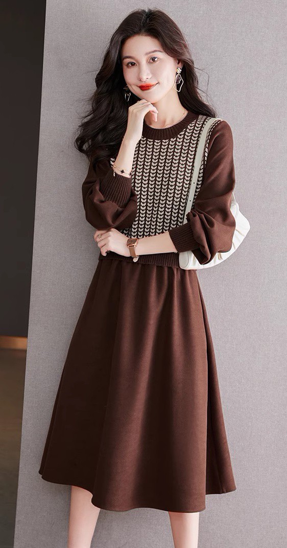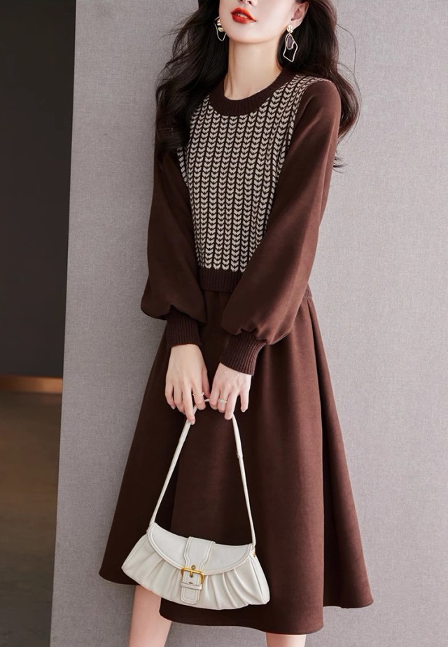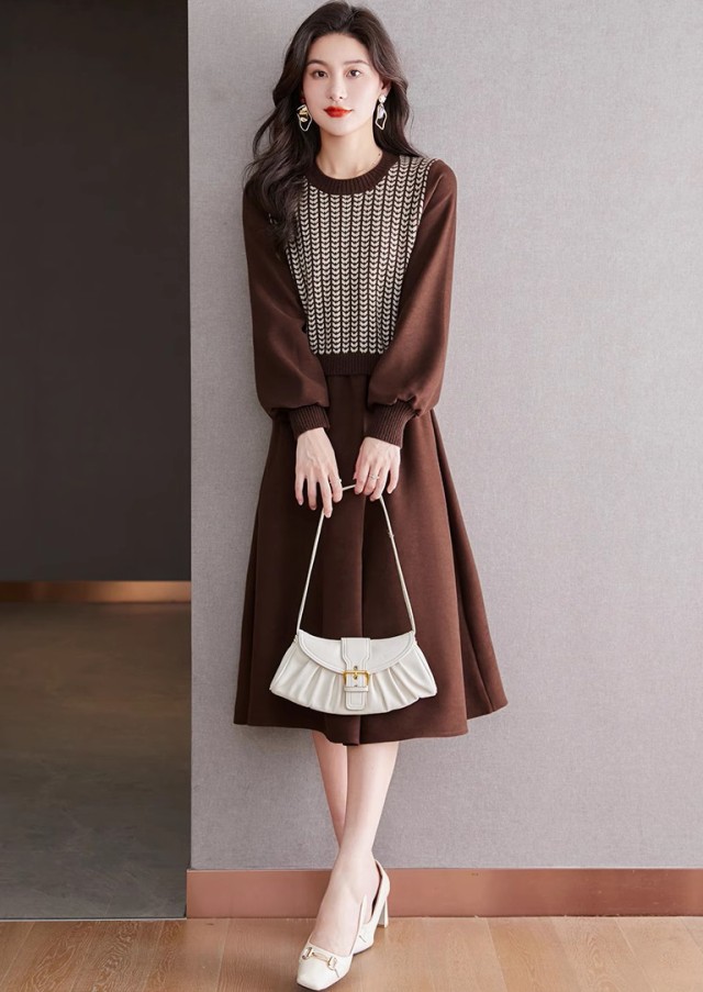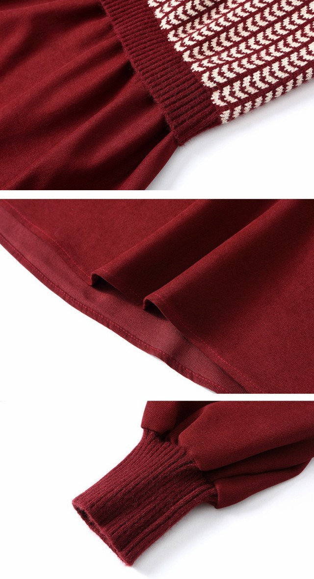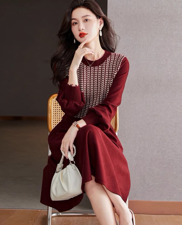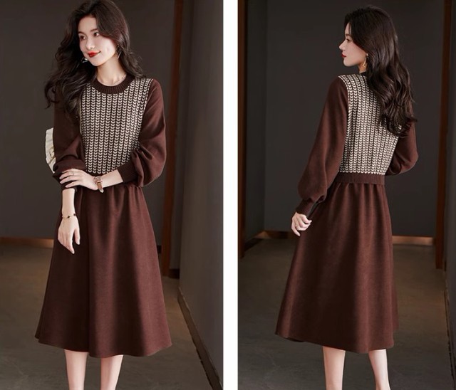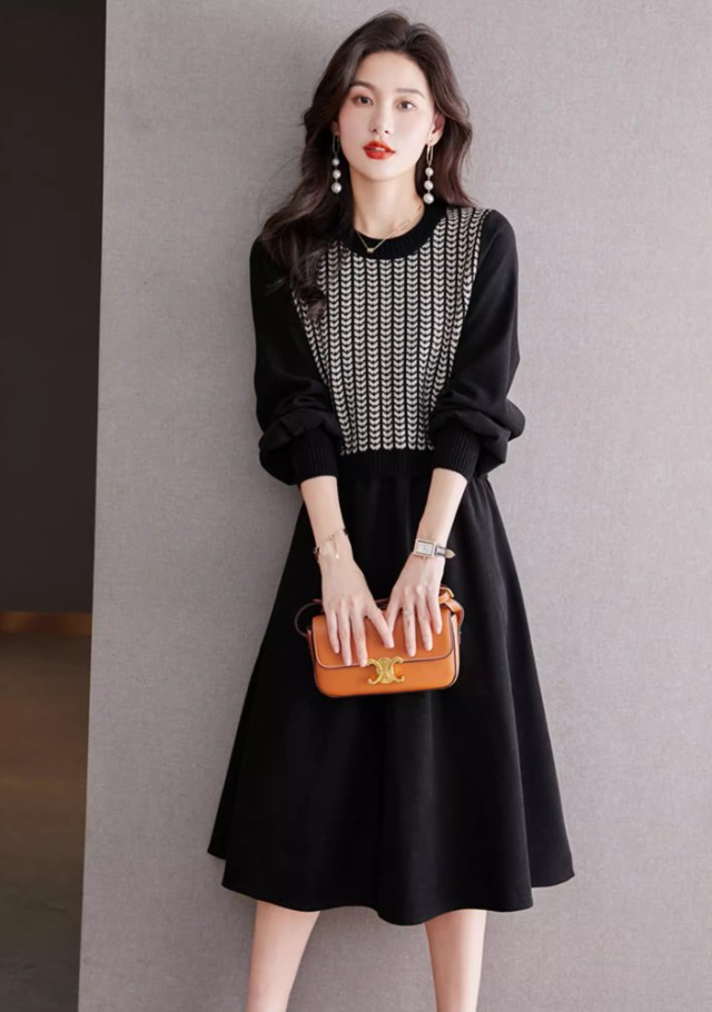 レイヤード風ワンピース ニットワンピース 秋冬 ワンピース レディース 長袖 膝丈 パフスリーブ 大きいサイズ 3L きれいめ カジュアル 黒 赤 レトロ