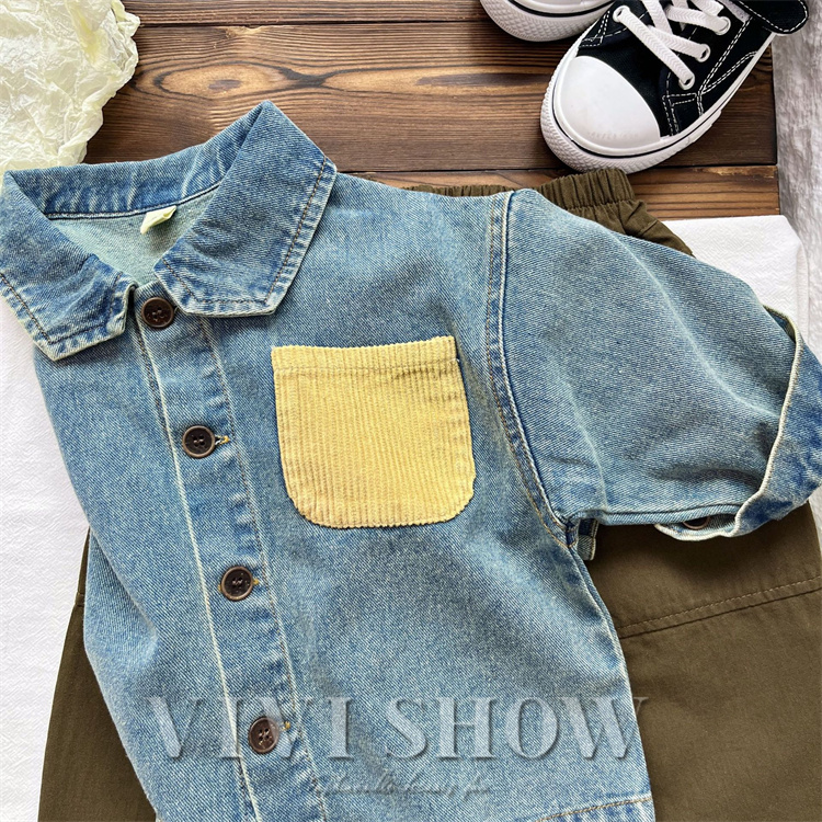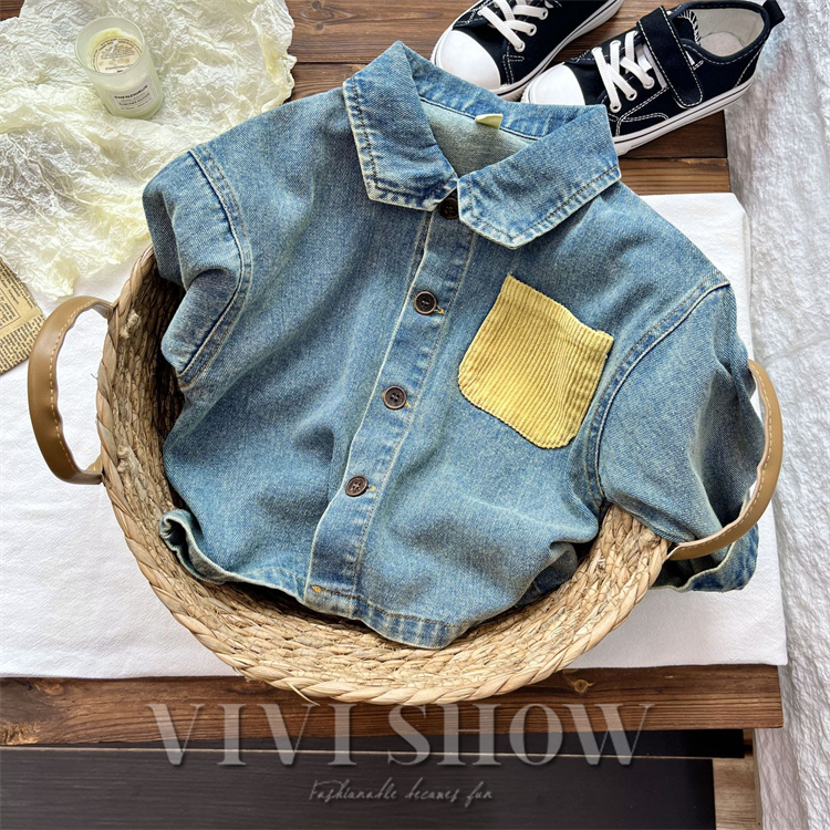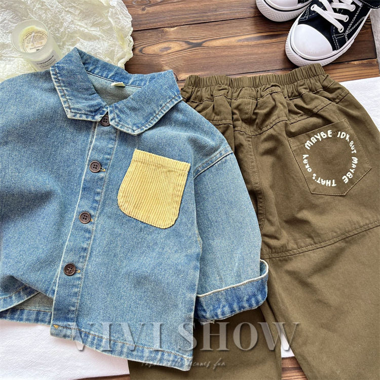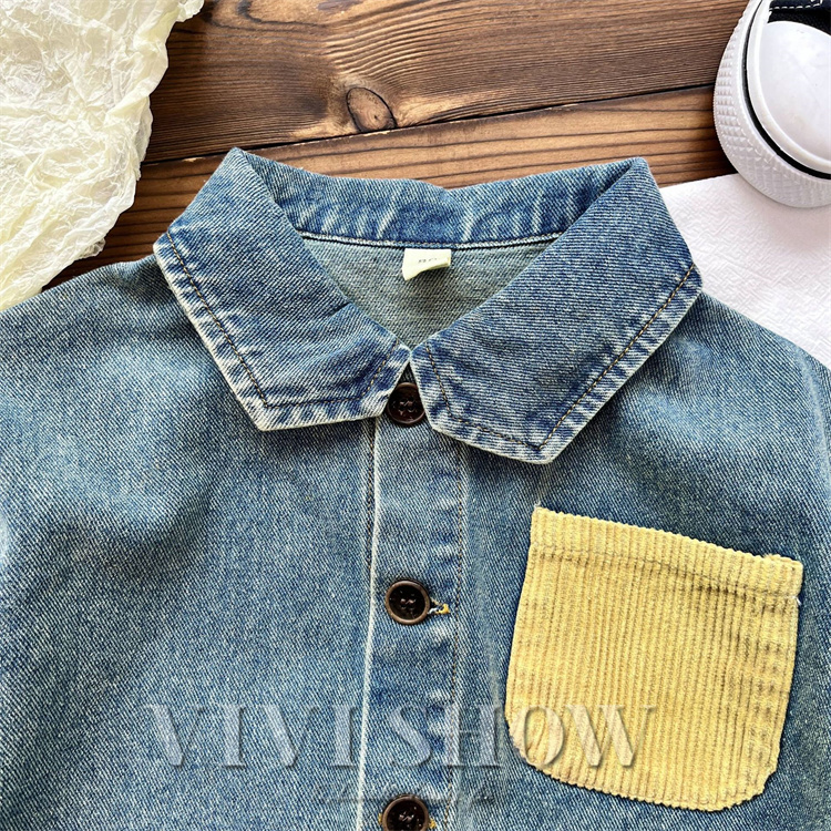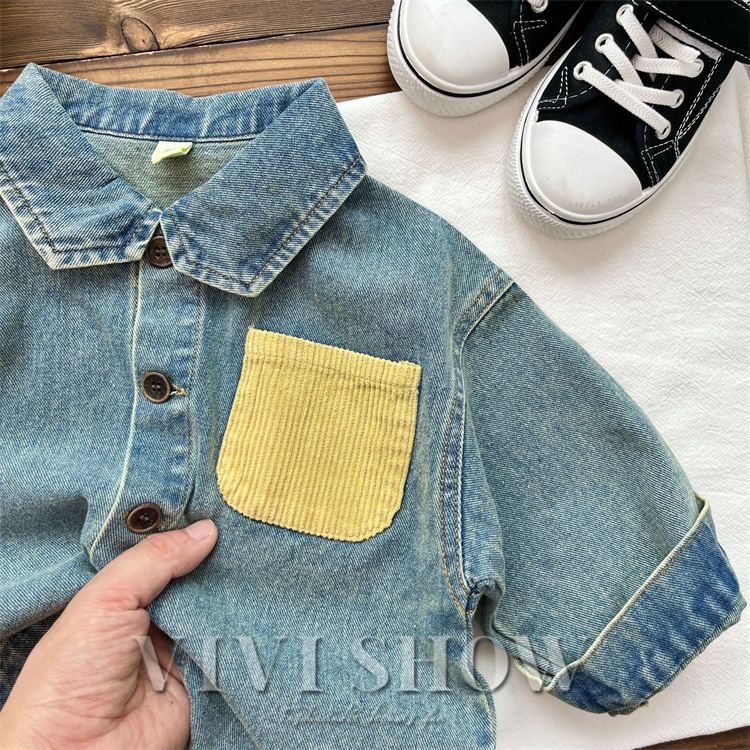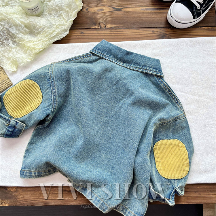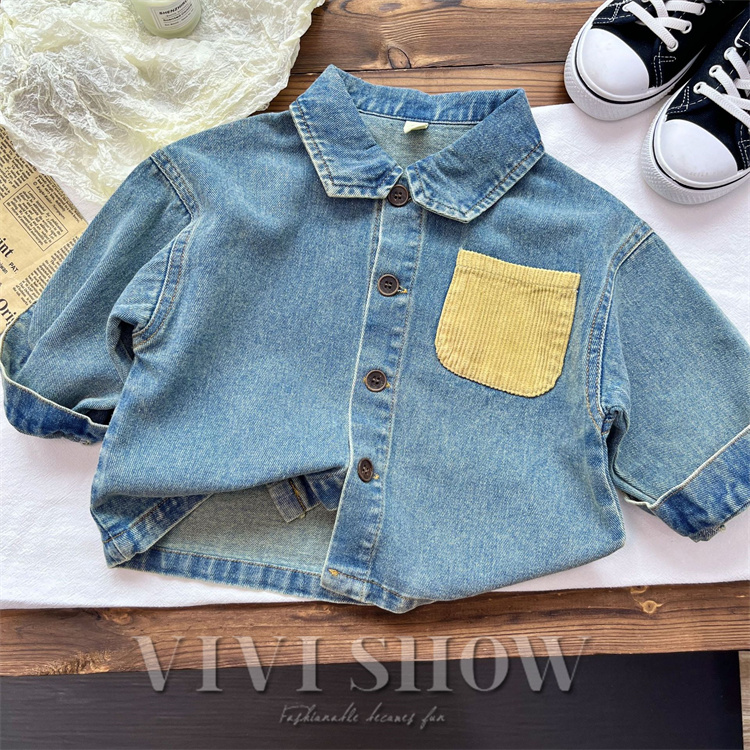 キッズ アウター 長袖 デニム トップス シンプル シャツ風 動きやすい ワンポイント おしゃれ 襟付き カジュアル あわせやすい ゆったり 着やすい