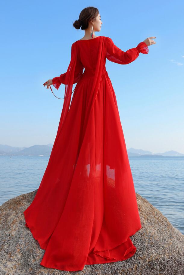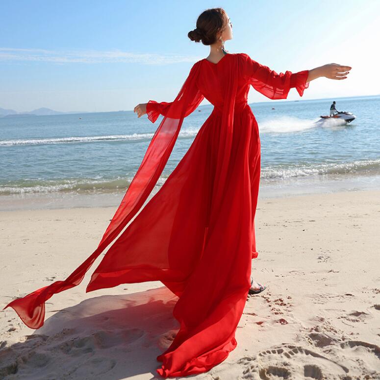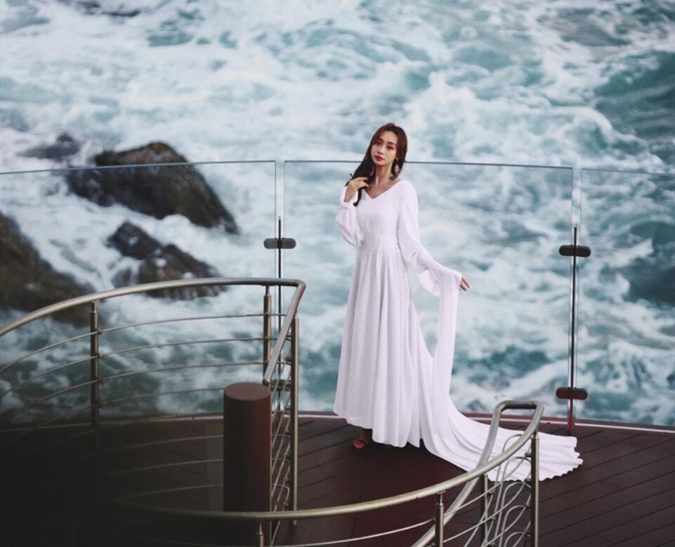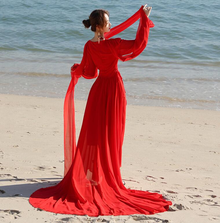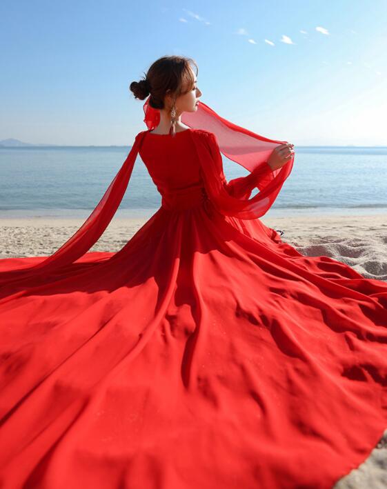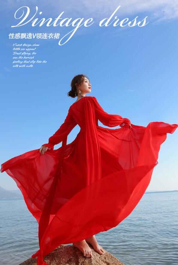 レディース ビーチドレス フィッシュテール ワンピース カラードレス 広がる Vネック 演奏会 舞台演出服 大裾幅 披露宴 長袖 撮影写真 トレーン海旅行