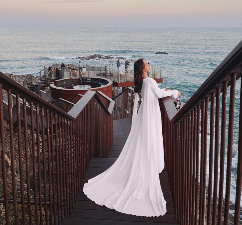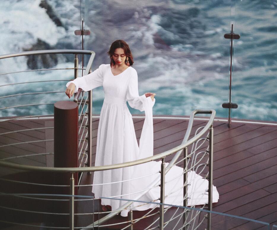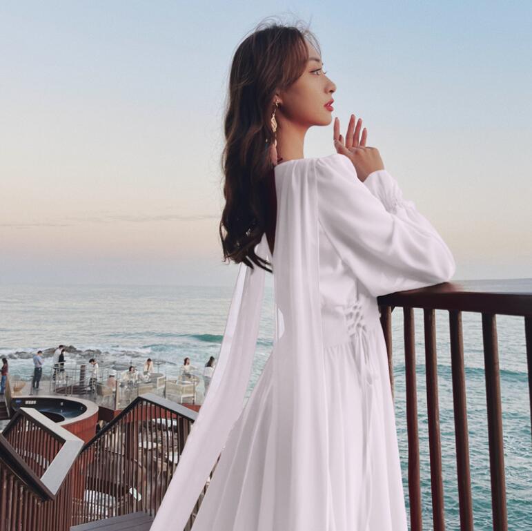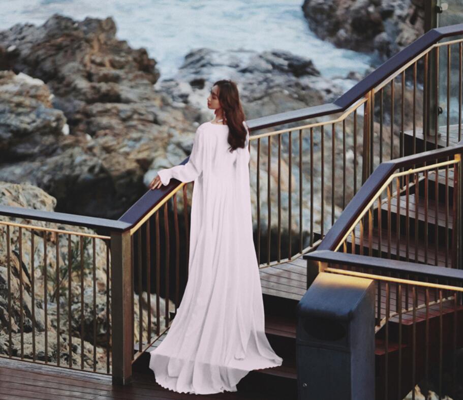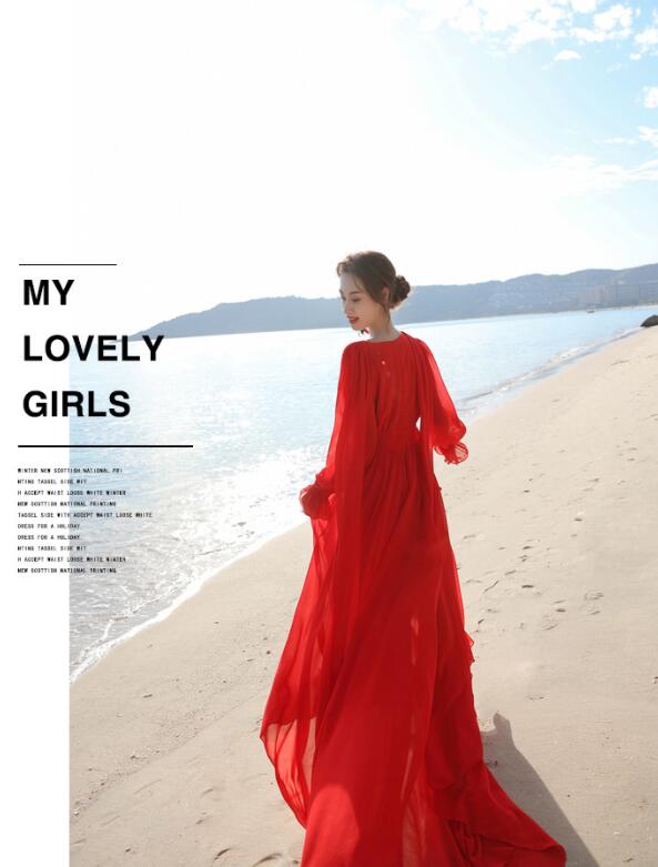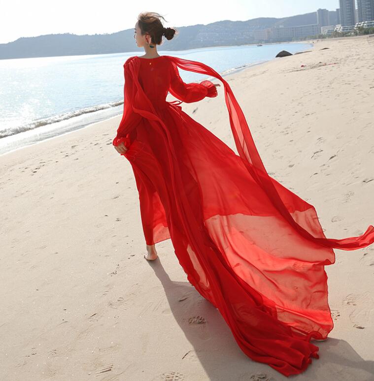 レディース ビーチドレス フィッシュテール ワンピース カラードレス 広がる Vネック 演奏会 舞台演出服 大裾幅 披露宴 長袖 撮影写真 トレーン海旅行