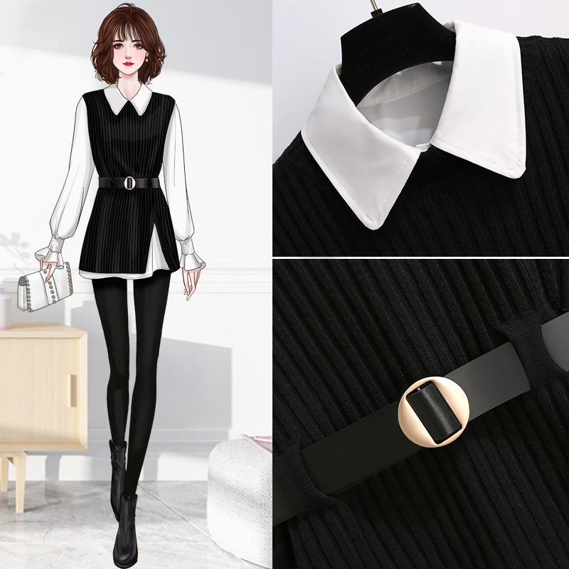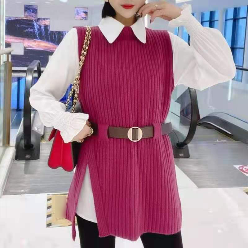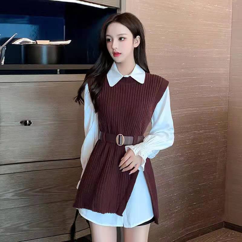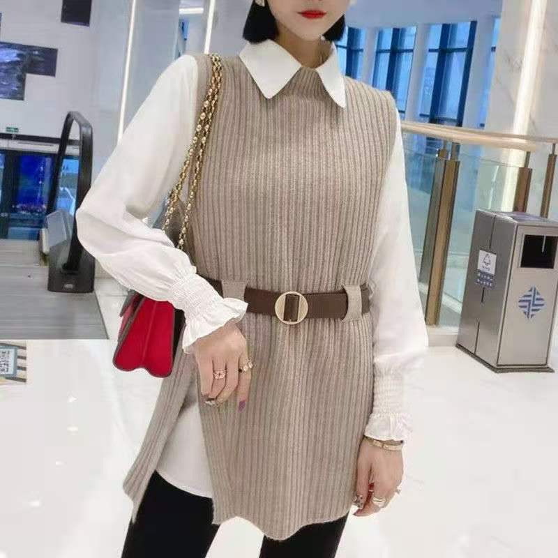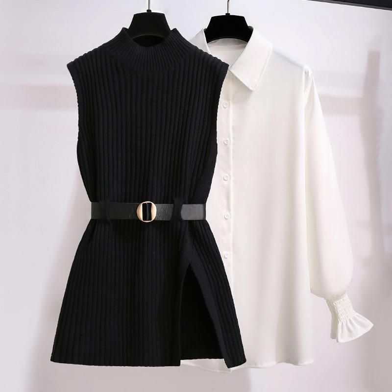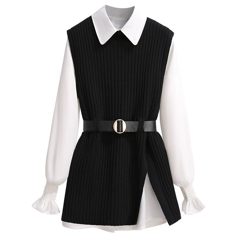 商品名:レディース ニットシャツ 2点セット ニットベスト 春秋冬 レイヤード シャツ ニット セットアップ 白シャツ 長袖 ブラウス トップス ノースリーブ ベスト セーター 重ね着 おしゃれ 体型カーバー 通勤