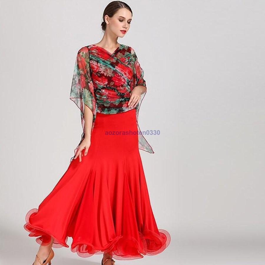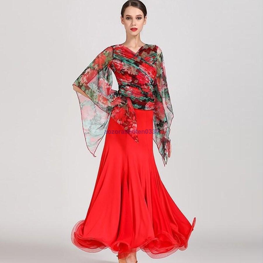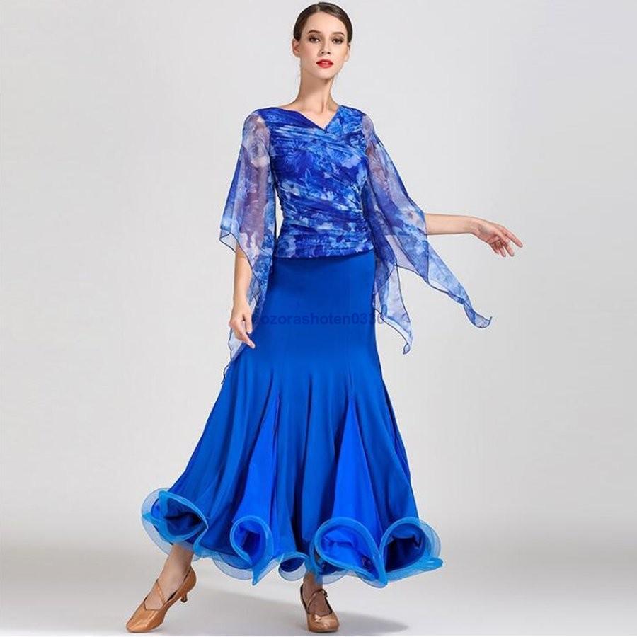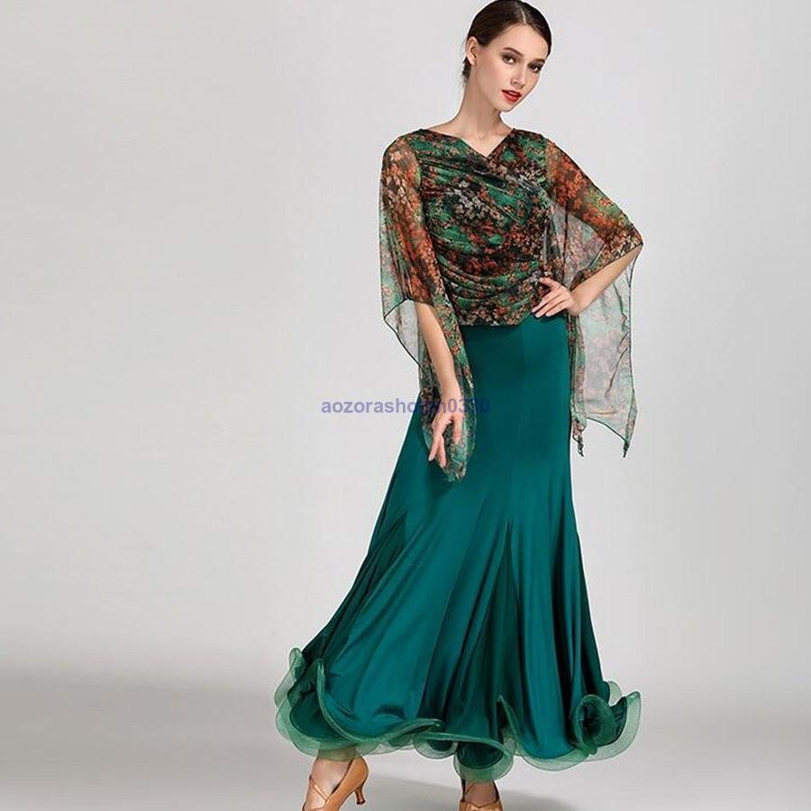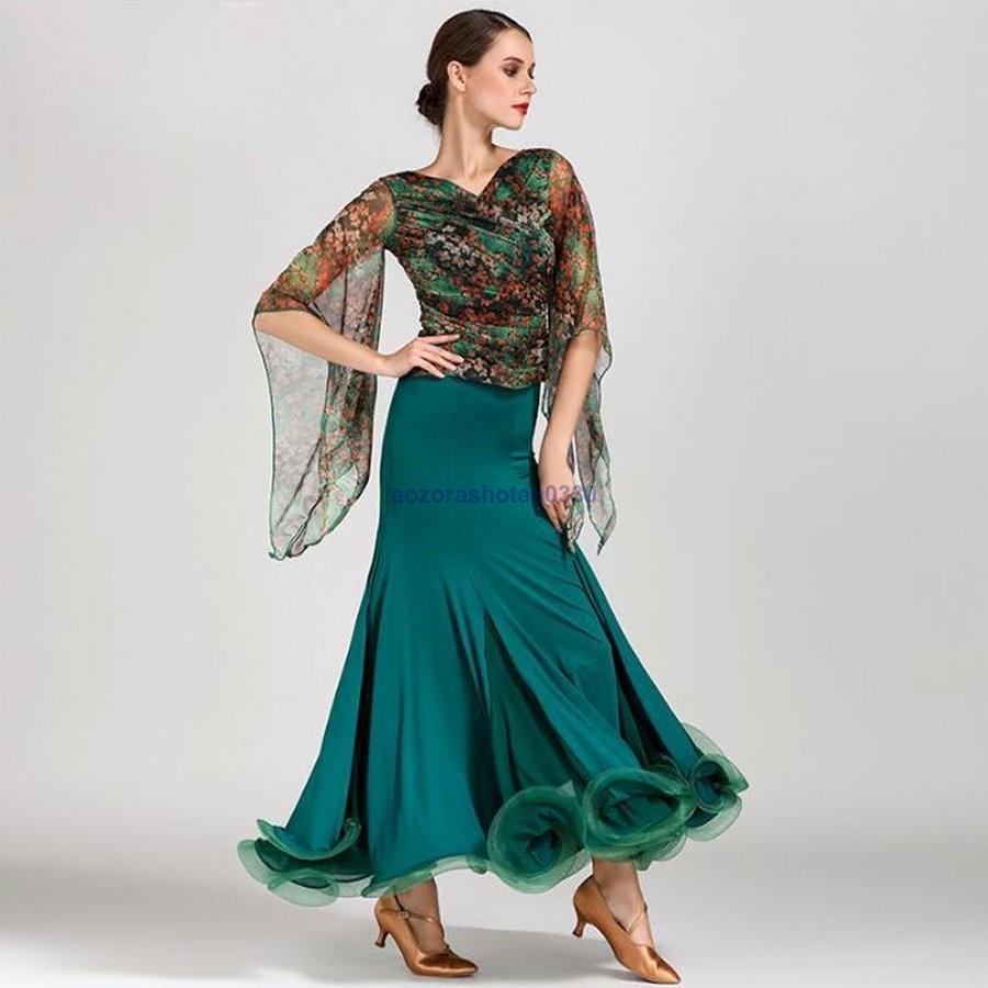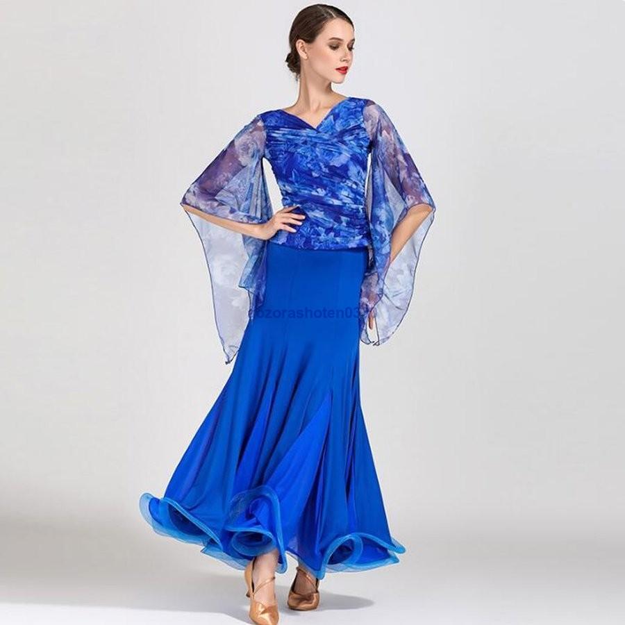 社交ダンス モダンダンス衣装 トップスとスカート2点セット ワルツ専用 ロングスカート広く裾 ルンバ 練習競技着デモ用 サンバ スタンダード発表会用演出服