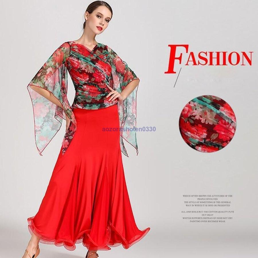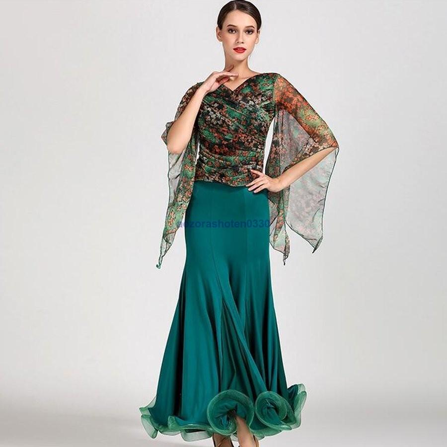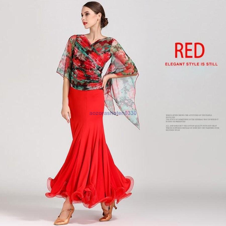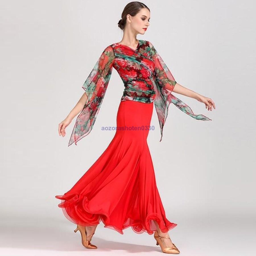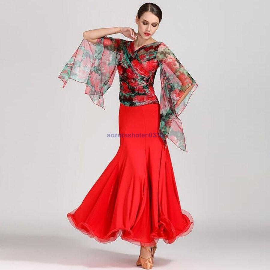 社交ダンス モダンダンス衣装 トップスとスカート2点セット ワルツ専用 ロングスカート広く裾 ルンバ 練習競技着デモ用 サンバ スタンダード発表会用演出服