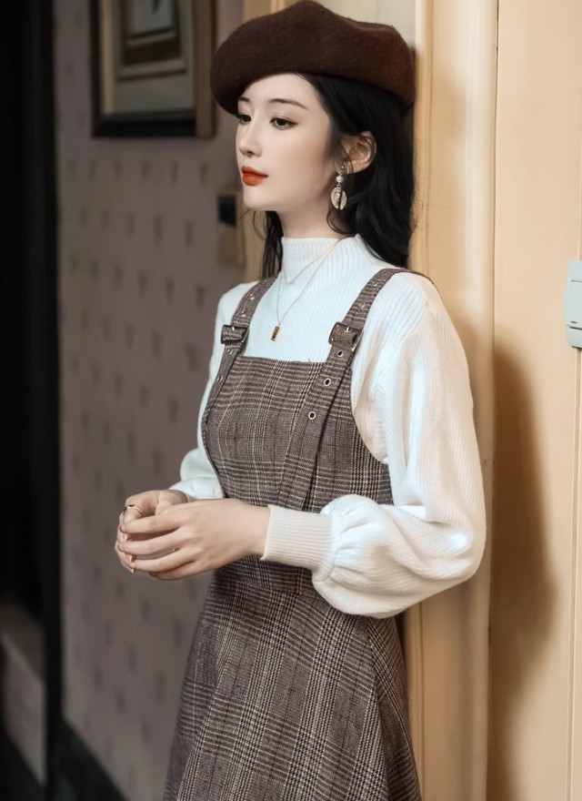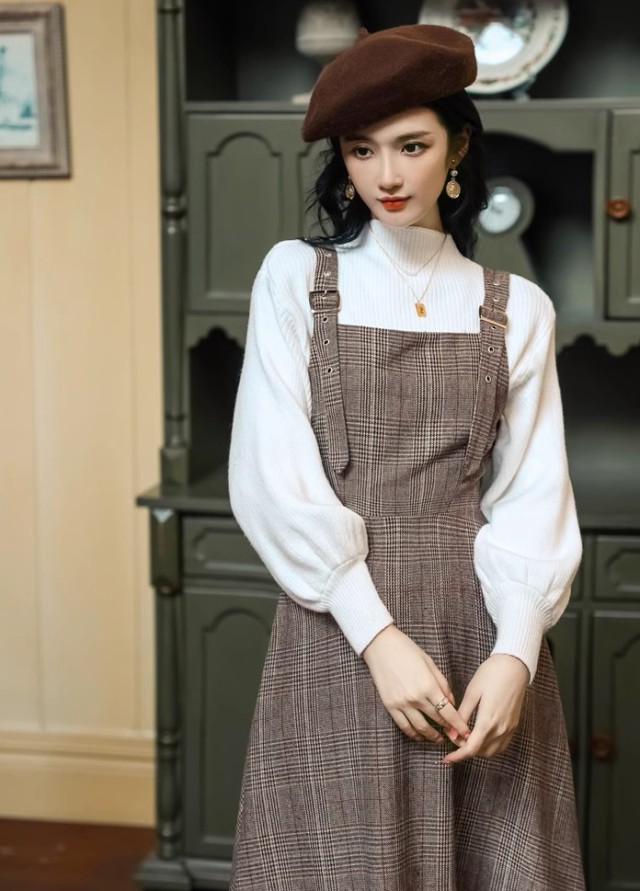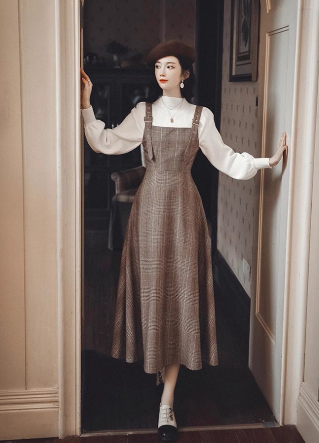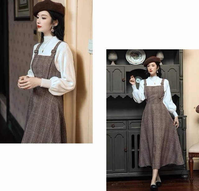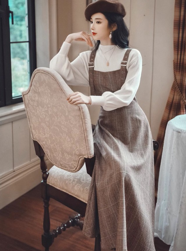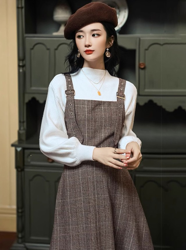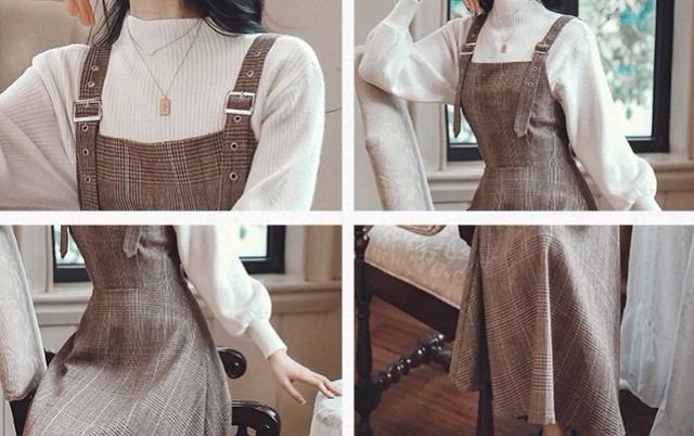 コーデセット レディース ジャンパースカート ロング セットアップ レディース ワンピース リブニット 長袖 グレンチェック 大きいサイズ モックネック 韓国