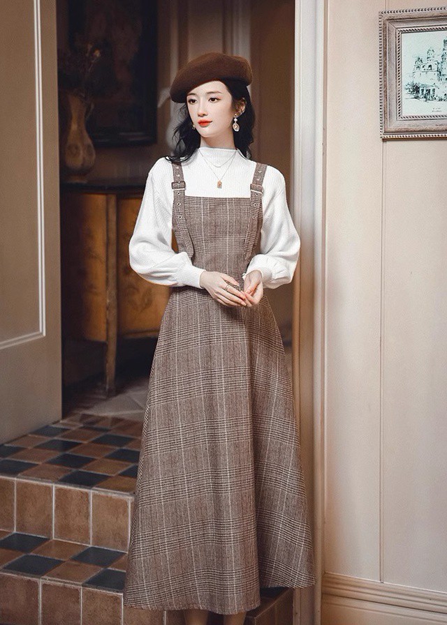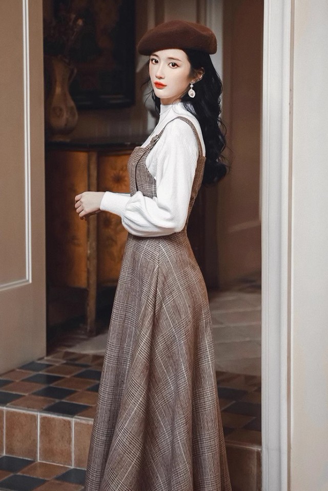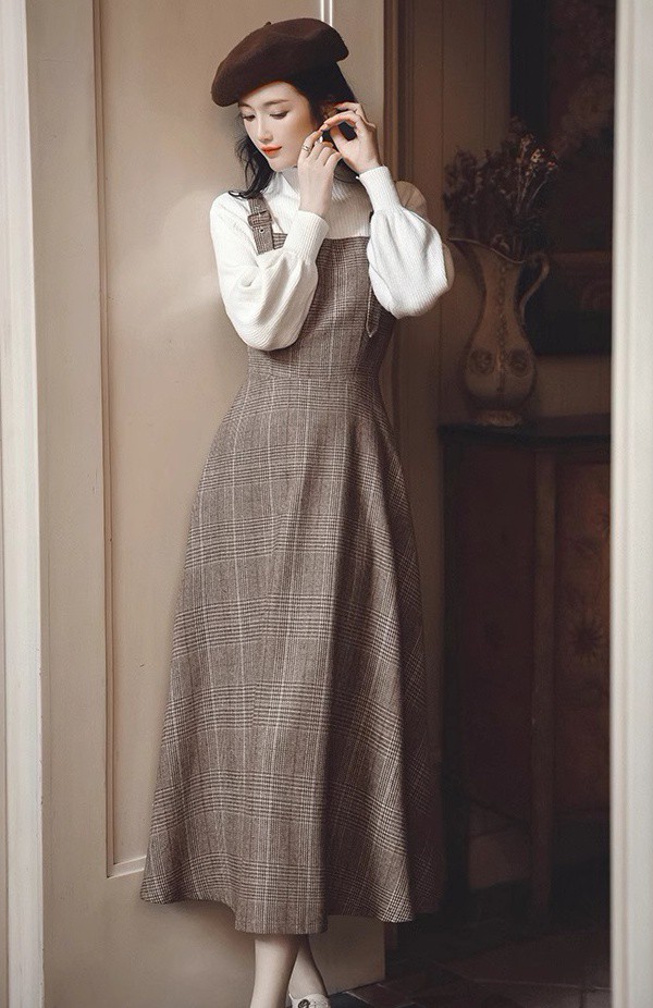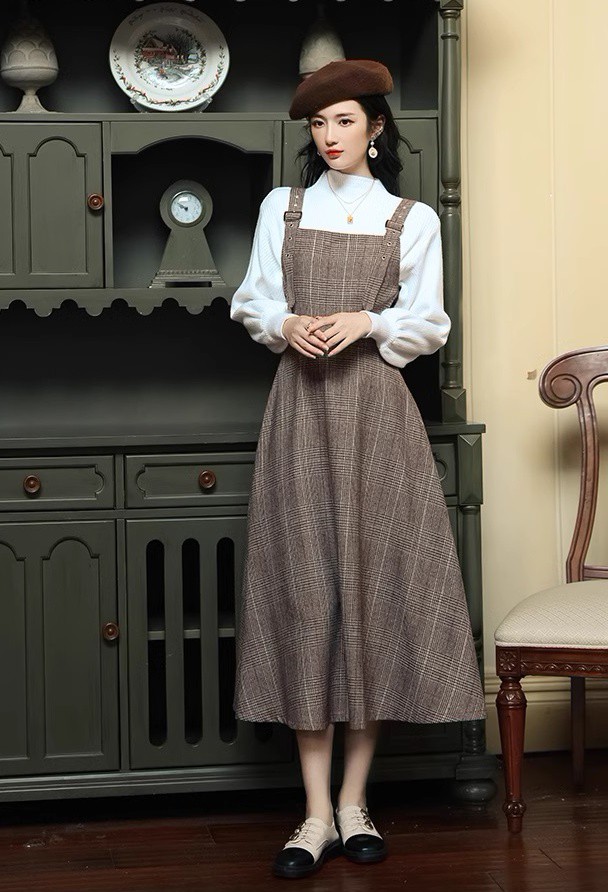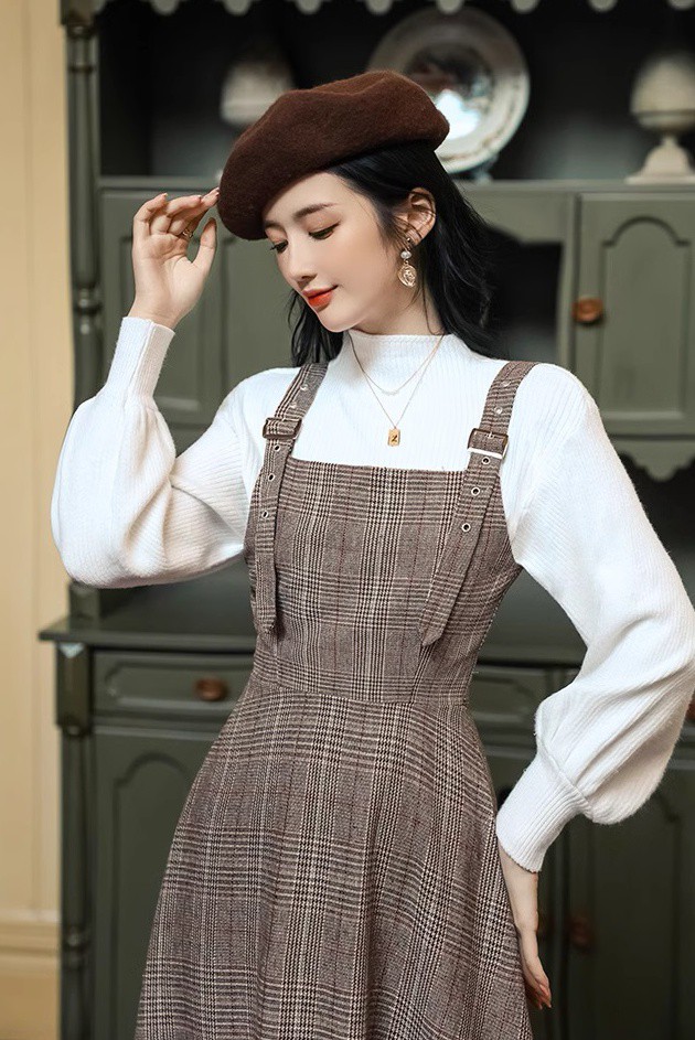 コーデセット レディース ジャンパースカート ロング セットアップ レディース ワンピース リブニット 長袖 グレンチェック 大きいサイズ モックネック 韓国