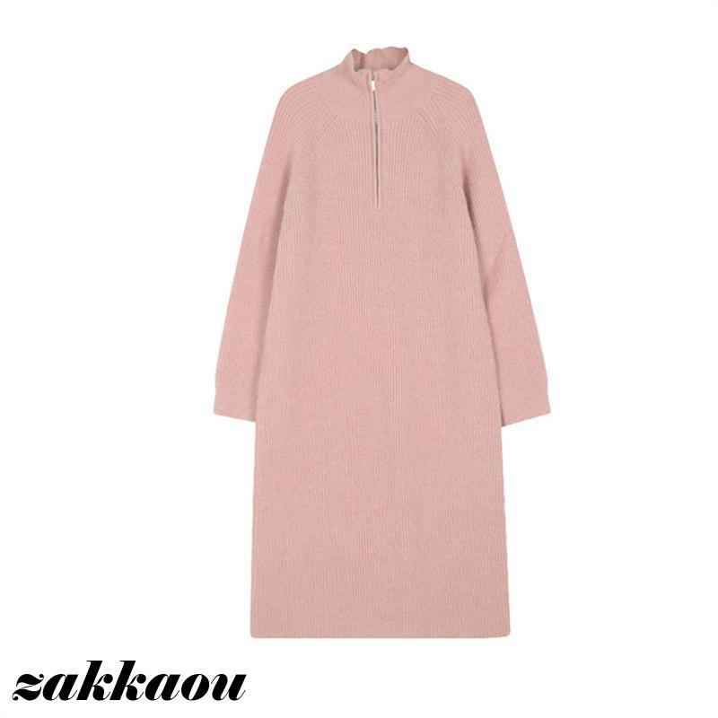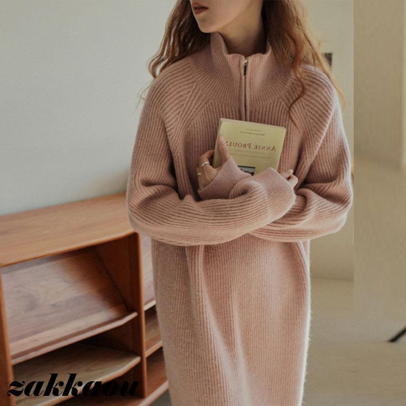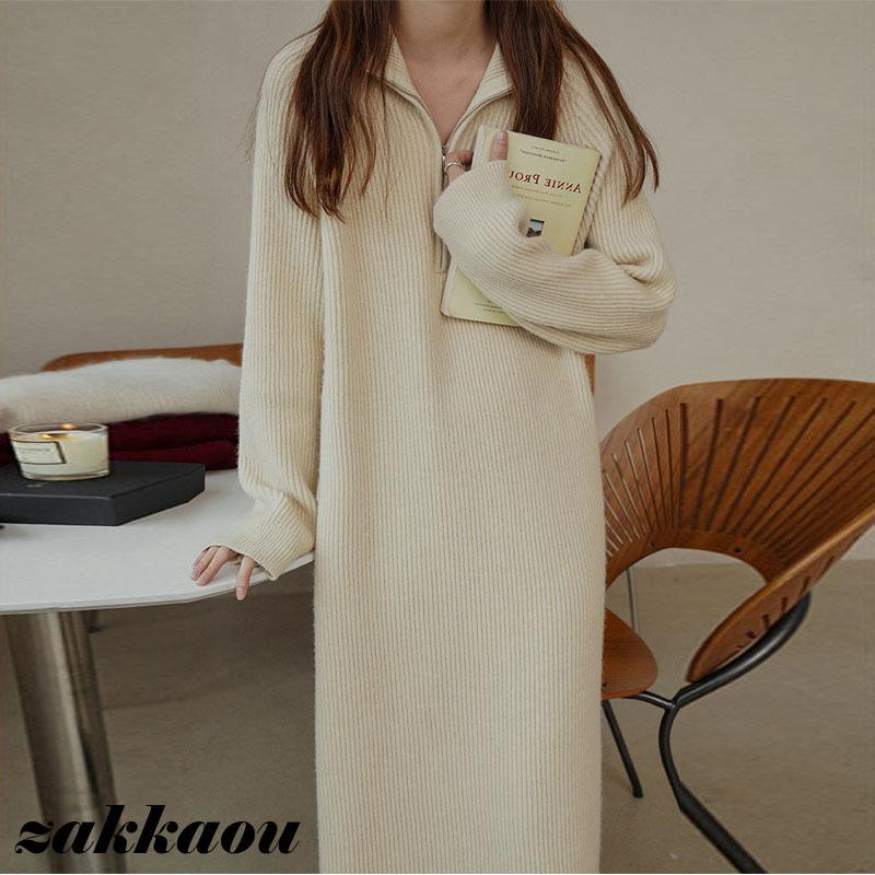 レディース 女性 秋冬 新作 韓国版 膝丈 スカート ミドル丈 ワンピース ニット 厚手 ボハーフジッパー ゆったり ロング