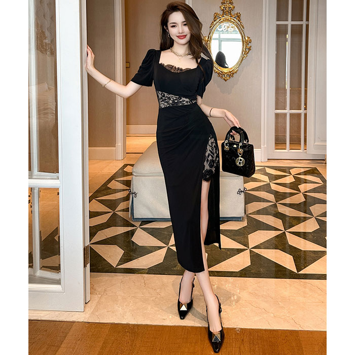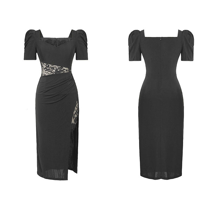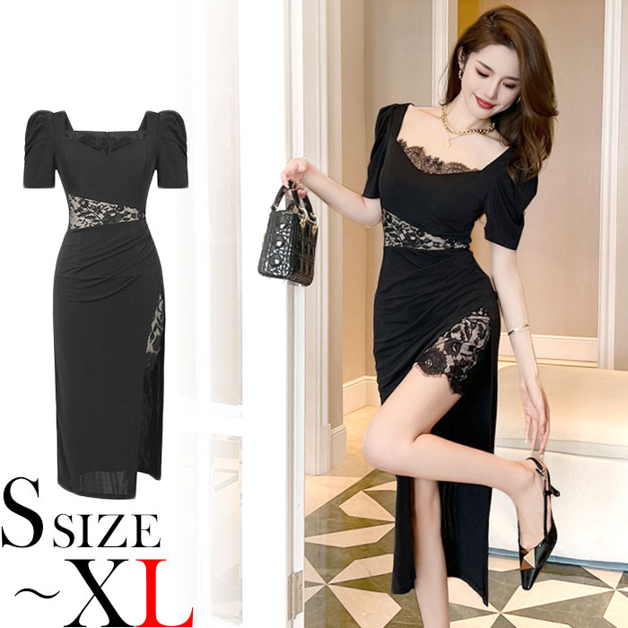 シンプルで細見えのタイト気味シルエットが大人のおしゃれな色気を放つ、半袖ロング丈ワンピースです。 シックな黒色カラーに、ハイウエスト部分とスカート部分のシースルーレース刺繍や肌触り良い生地がラグジュアリーなオーラを放ちます。軽やかな肩回りやゴージャスな半袖が暑い季節にも良く合い、お呼ばれパーティーなどでもとてもお薦めです。 着心地も良い、大人スタイルのドレスワンピ。