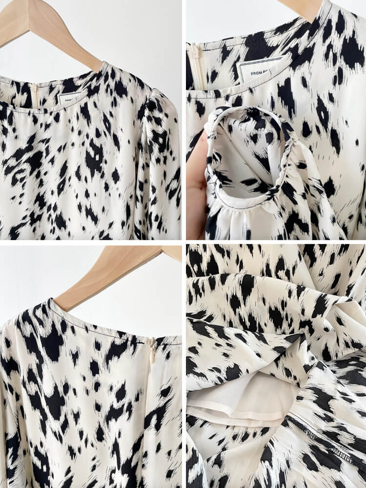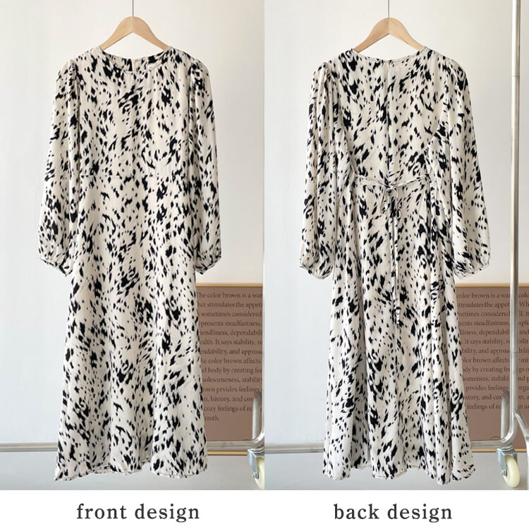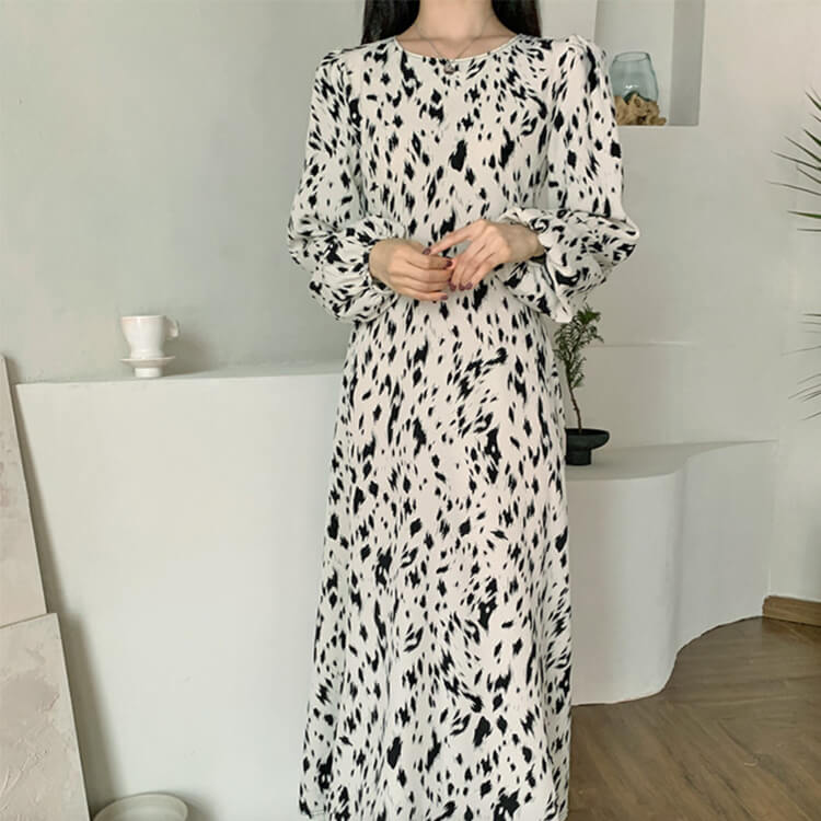 白地にアンシンメトリーな黒の牛柄プリントでエレガントな長袖ロングワンピース。