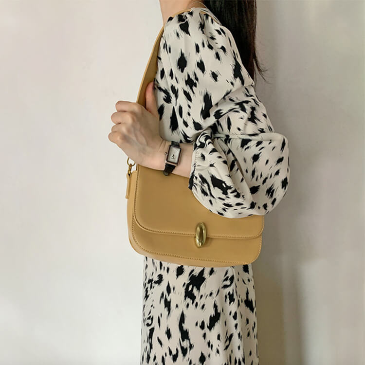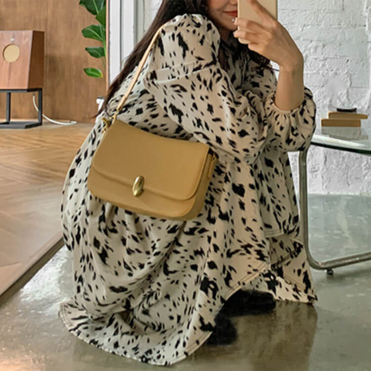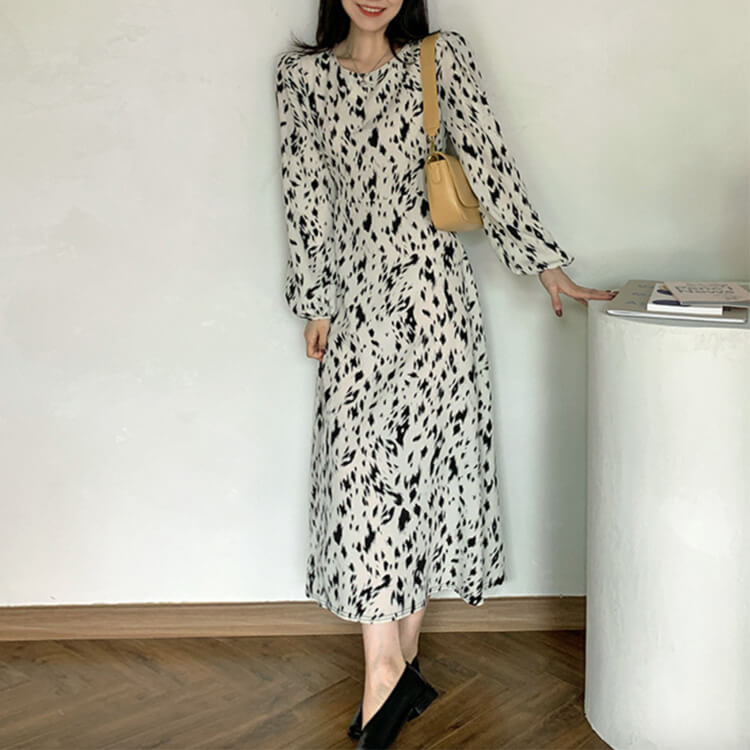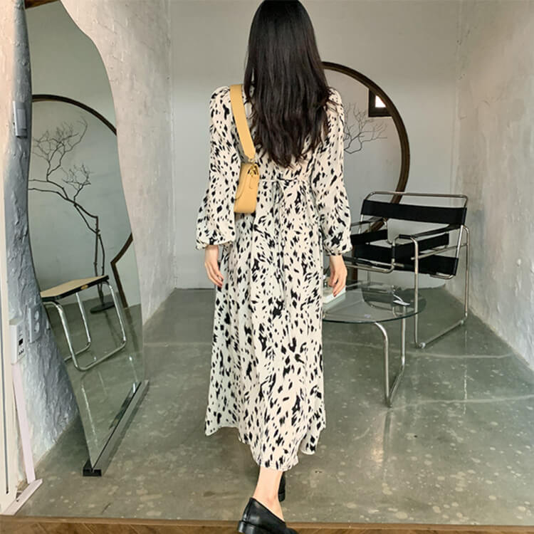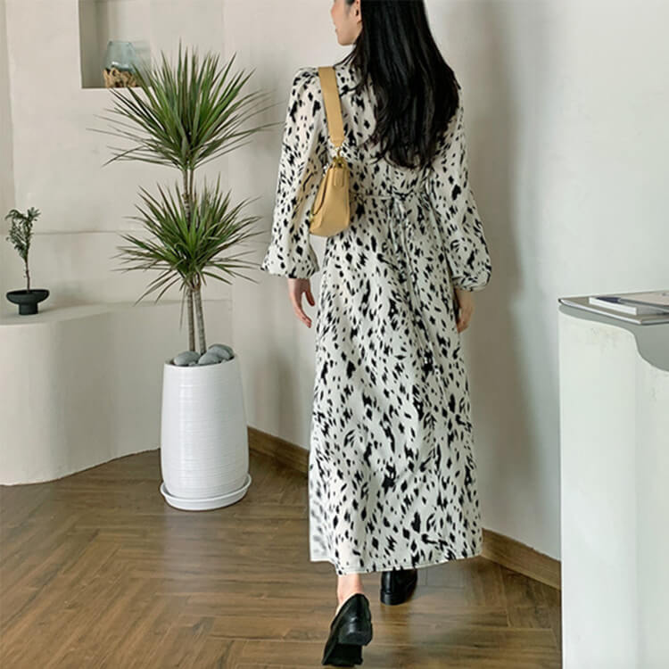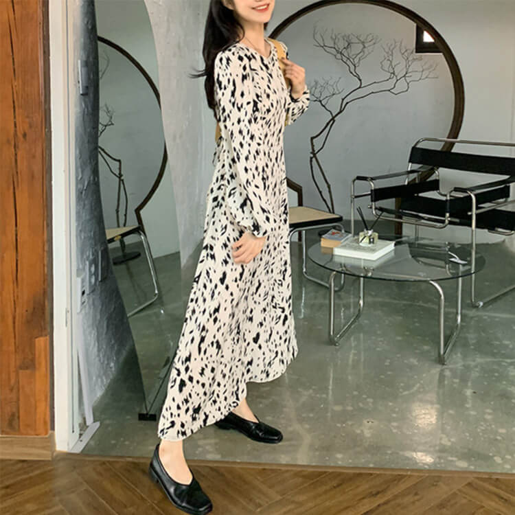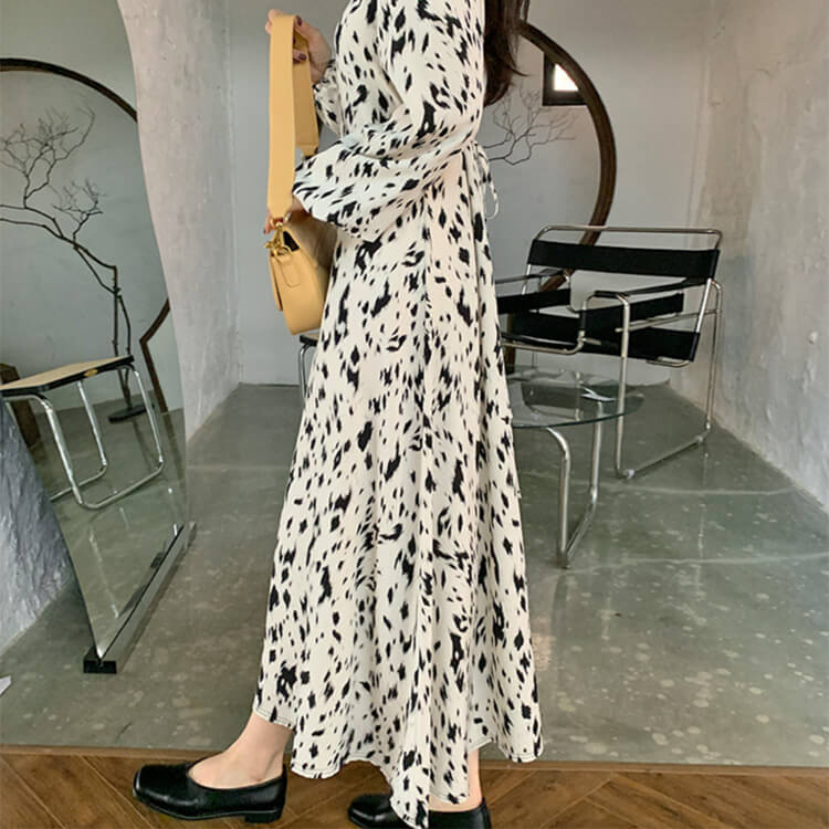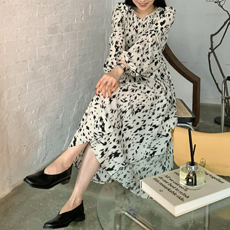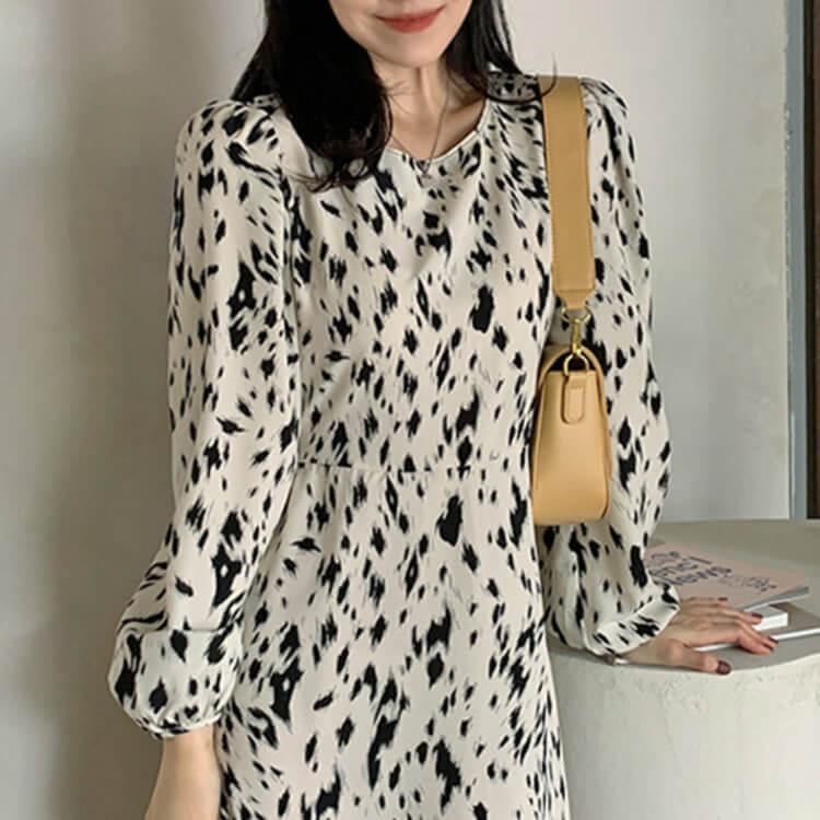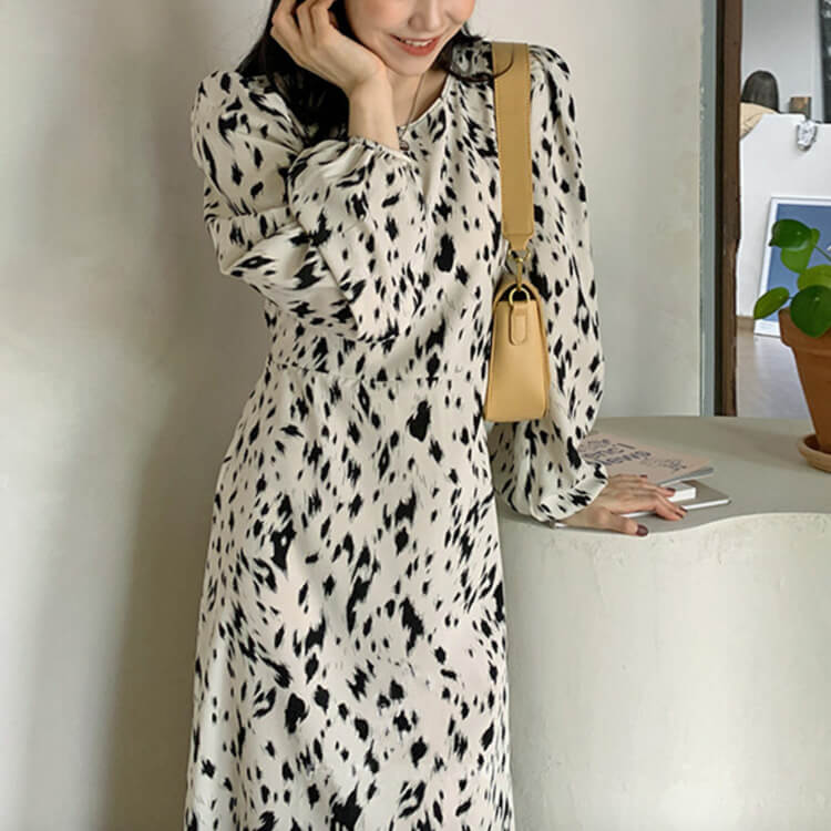 韓国デザインの上品キレイな牛柄ロング丈ワンピース。