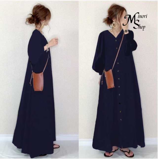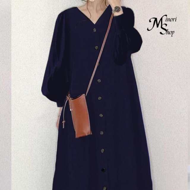 ワンピース レディース ロング丈 シャツワンピース ドッキングワンピ フリル おしゃ 長袖 ブラック 春夏秋 ボダン付き ネイビー Vネック