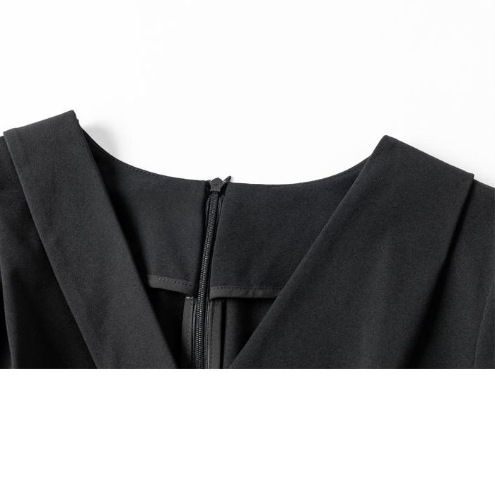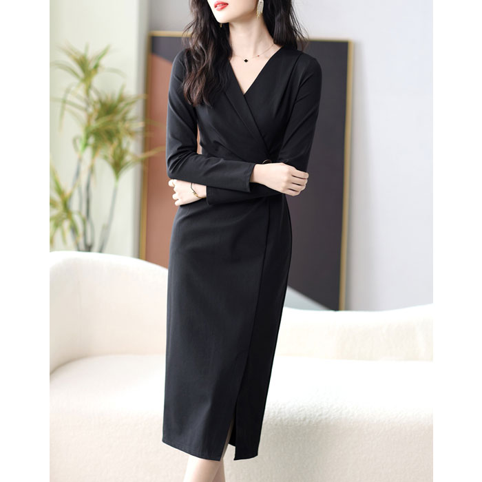 襟付きカシュクール ハイウエストボタン 長袖膝丈ワンピース 黒 発表会 結婚式 服 韓国 レディース パーティー