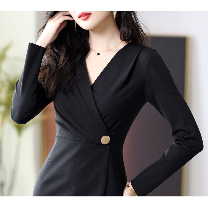 スッキリと細見えのスレンダーシルエットに、襟付きカシュクールVネック胸元が大人の上品さを醸し出す、ミディアム膝丈ワンピースです。 軽やかな長袖がアクセントとなり、ラグジュアリーな個性を演出。ハイウエスト部分のボタンが足長小顔効果も生みます。 パーティーや発表会、クラブ スナック ラウンジ キャバドレス等々、これ1枚で着回し可能なロングワンピです。