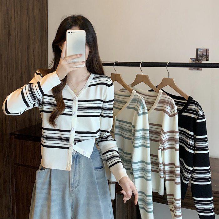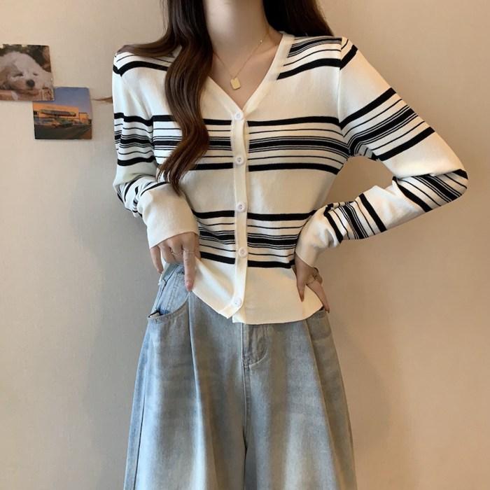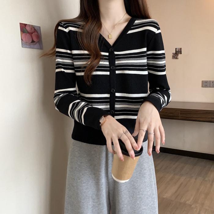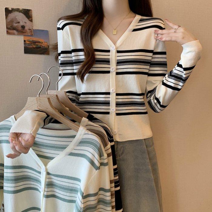 ニット カーディガン ボーダー レディース Vネック 配色 トップス ニット 羽織り 長袖 開襟 冷房対策 ストライプ 薄手 シンプル 秋 春 デイリー スタイリッシュ