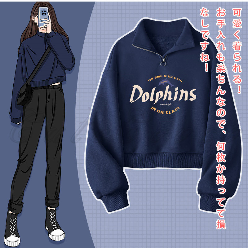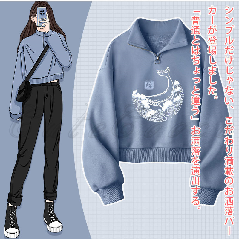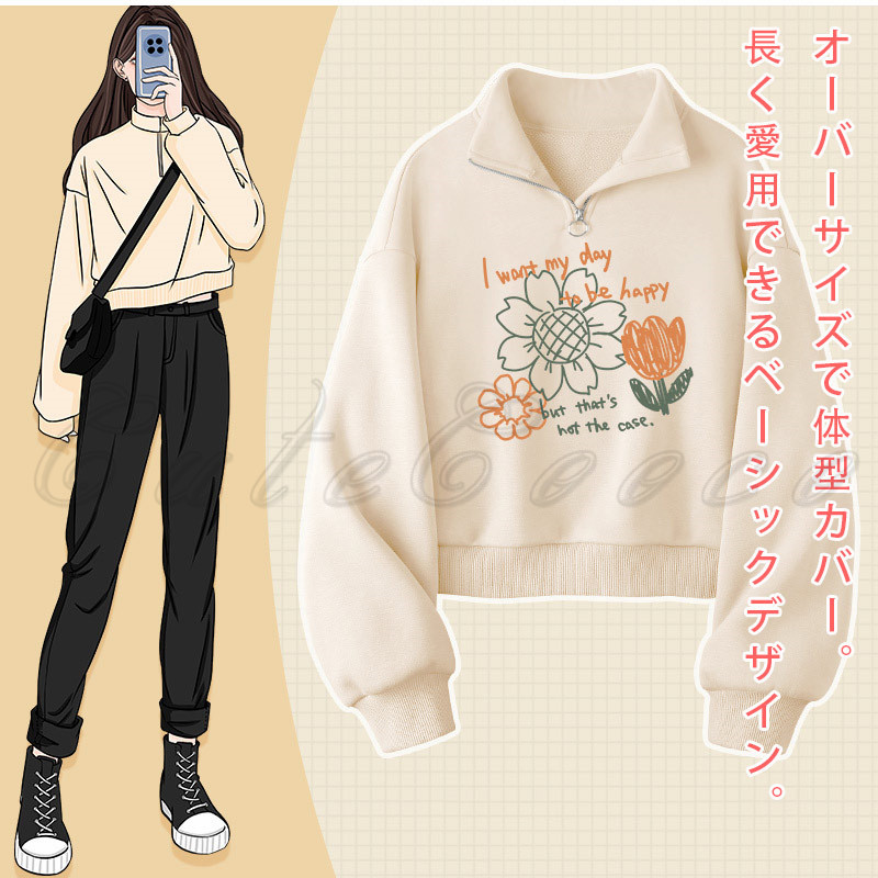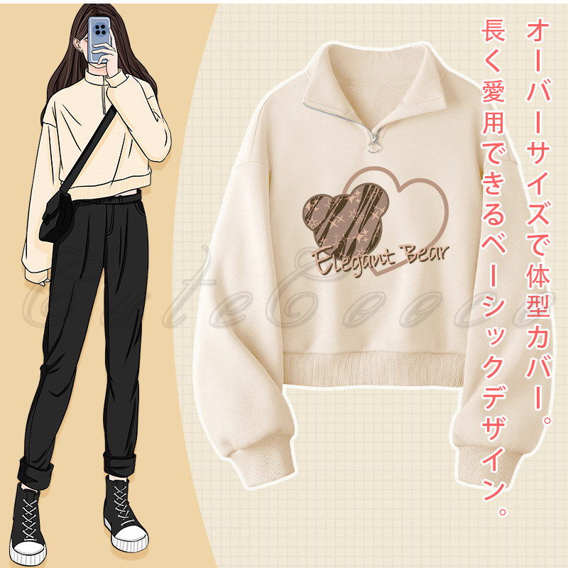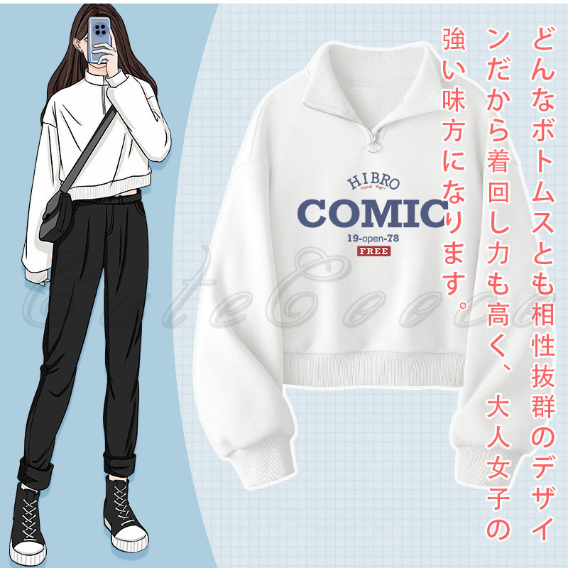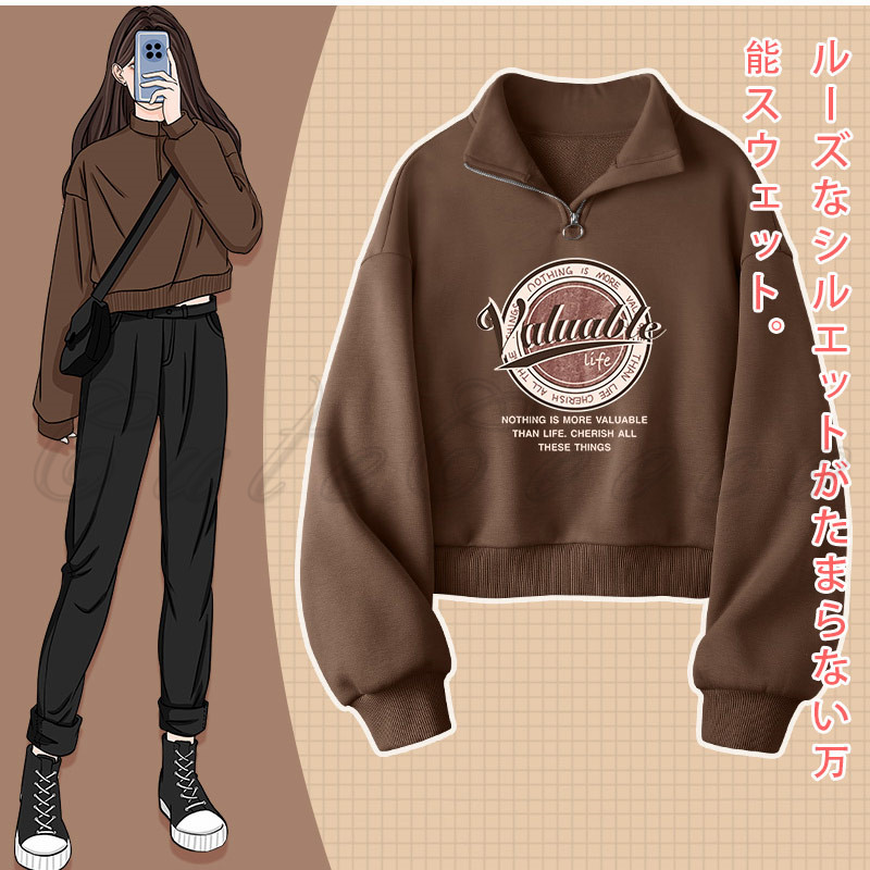 ハーフジップ スウェット ロゴ プリント ポロ襟 短め 送料無料 トレーナー 長袖 春 カジュアル 体型カバー レディース ゆったり 冬 トップス 秋