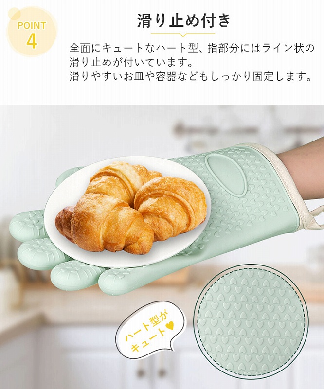 可愛らしいハート型の凹凸が全面に、指部分にはライン状の滑り止めが施されており、滑りやすいお皿やボールなどもしっかりとホールドします。