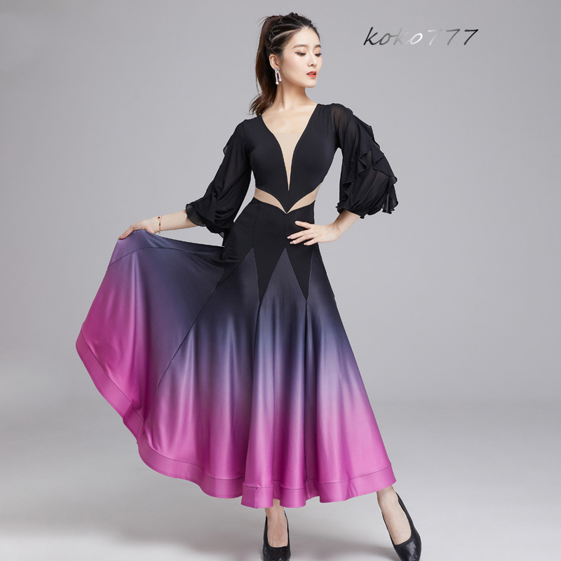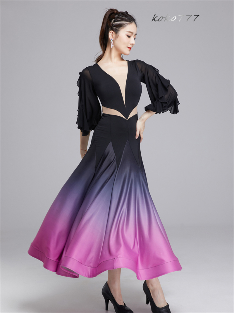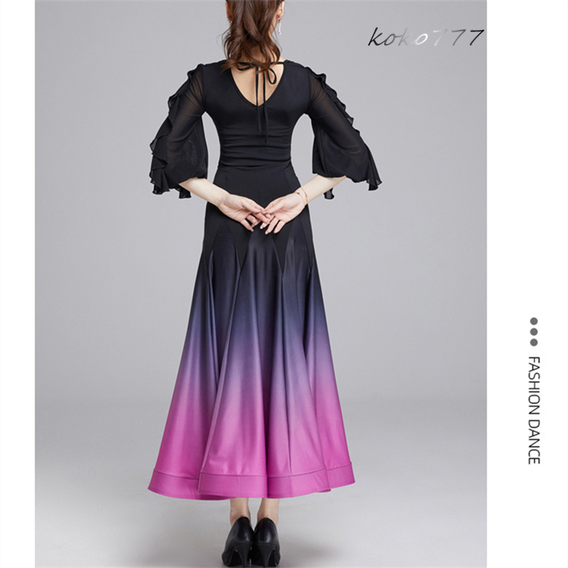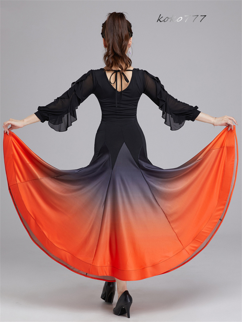 ロングドレス レディース ワンピース ラテンダンス フリル パーティー 公演 発表会 洋服 舞台衣装 部活 モダンダンス ワルツ グラデーション ナショナルダンス