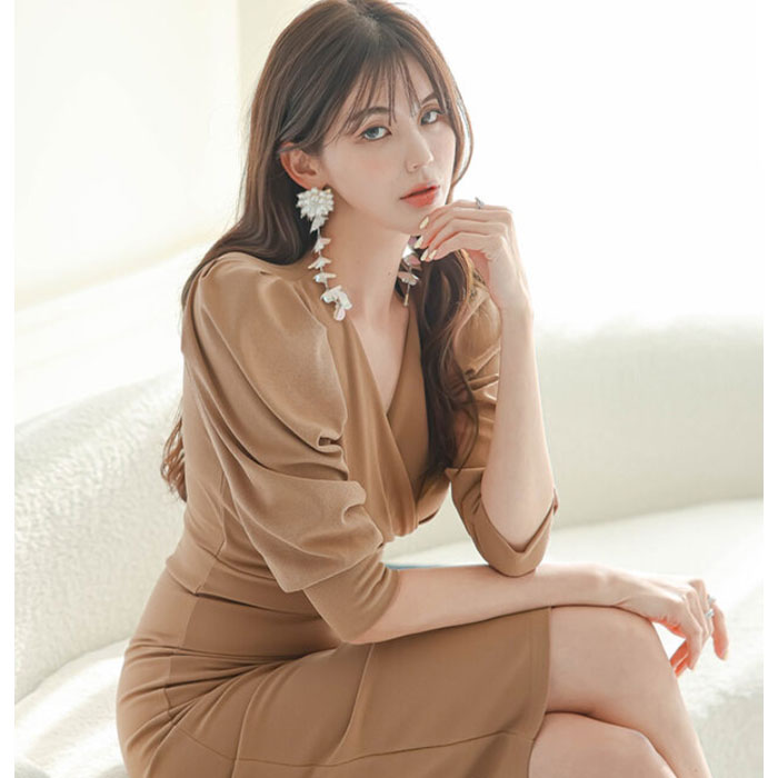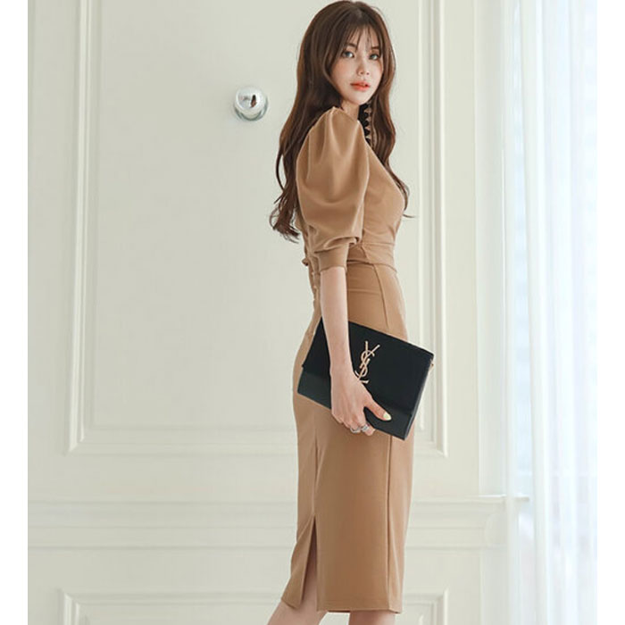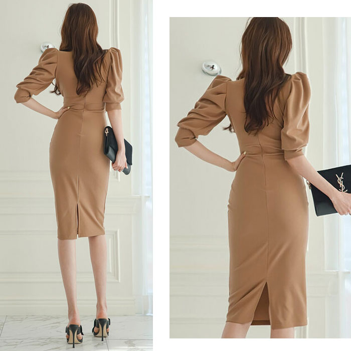 ふんわりとしながらもスッキリと細見えタイト気味シルエットに、ボリューム感溢れるパフスリーブ5分袖がエレガントさを醸し出す、ミディアムひざ丈ワンピースです。 Vネック胸元やハイウエスト切り替えがアクセントとなり、ラグジュアリーな個性を演出。足長小顔効果も生みます。 パーティーや発表会、クラブ スナック ラウンジ キャバドレス等々、これ1枚で着回し可能なドレスワンピです。