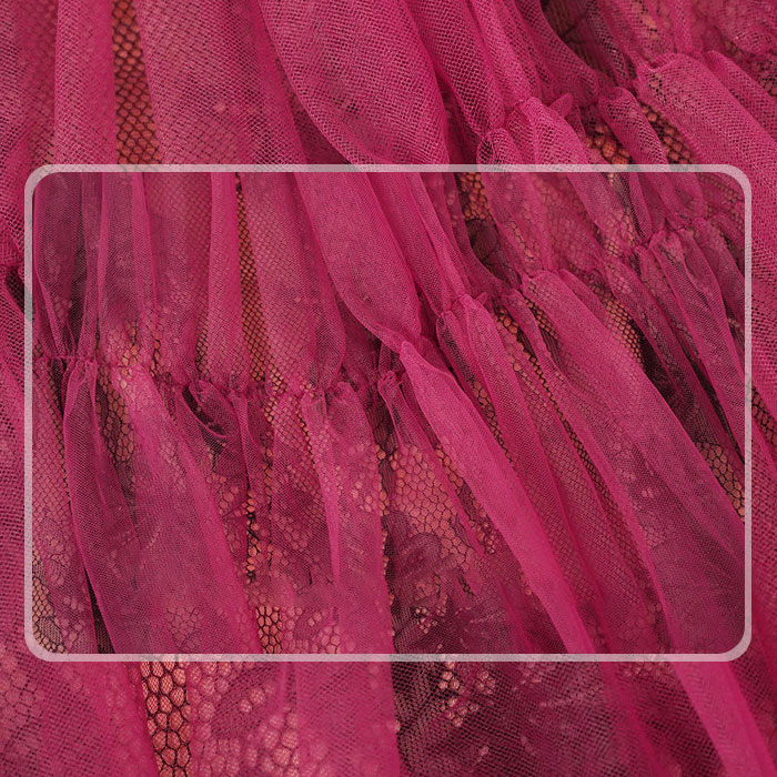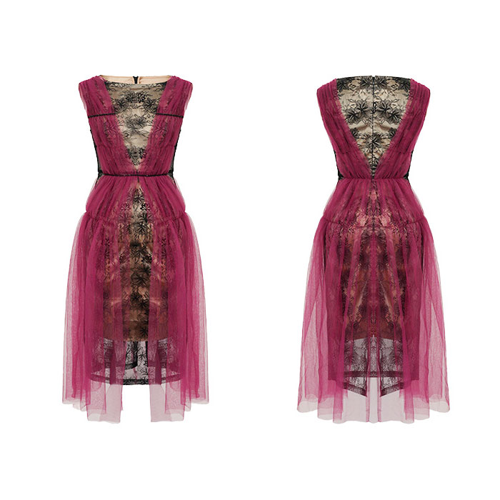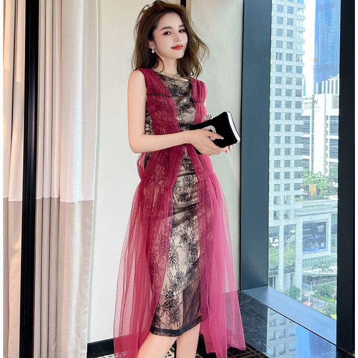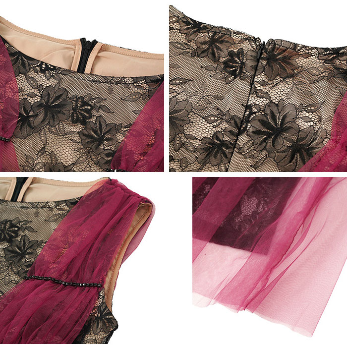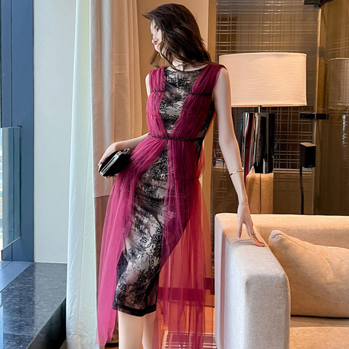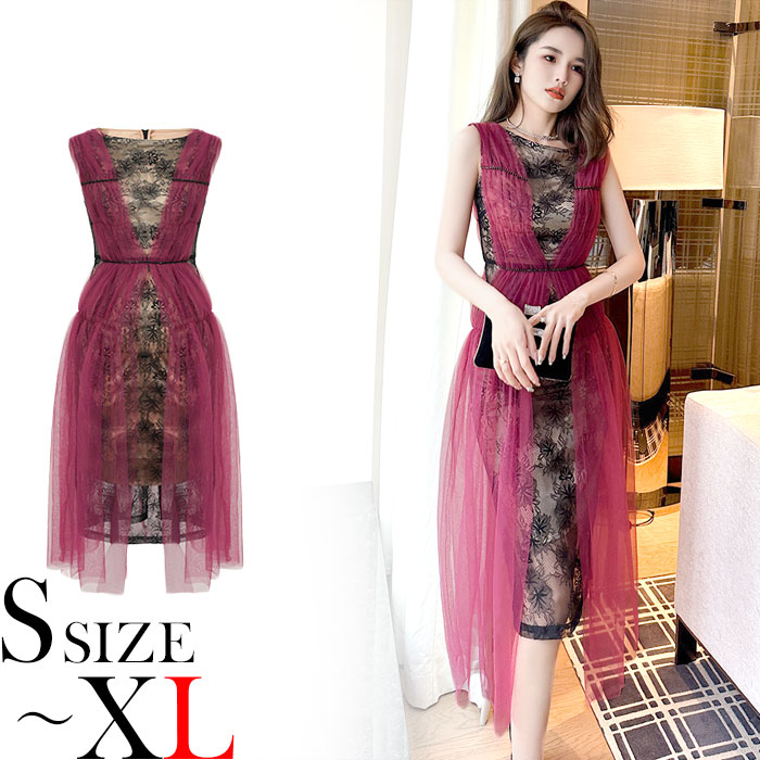シンプルで細見えのシルエットが大人のおしゃれな色気を放つ、ミディアムひざ丈ワンピースです。 シックなシースルーレースの黒色ワンピに赤色チュールスタイルを重ね着風スタイルがラグジュアリーなオーラを放ちます。軽やかな肩回りやノースリーブ仕立てが暑い季節にも良く合い、お呼ばれ結婚式やパーティーなどでもとてもお薦めです。 着心地も良い、大人スタイルのドレスワンピ。