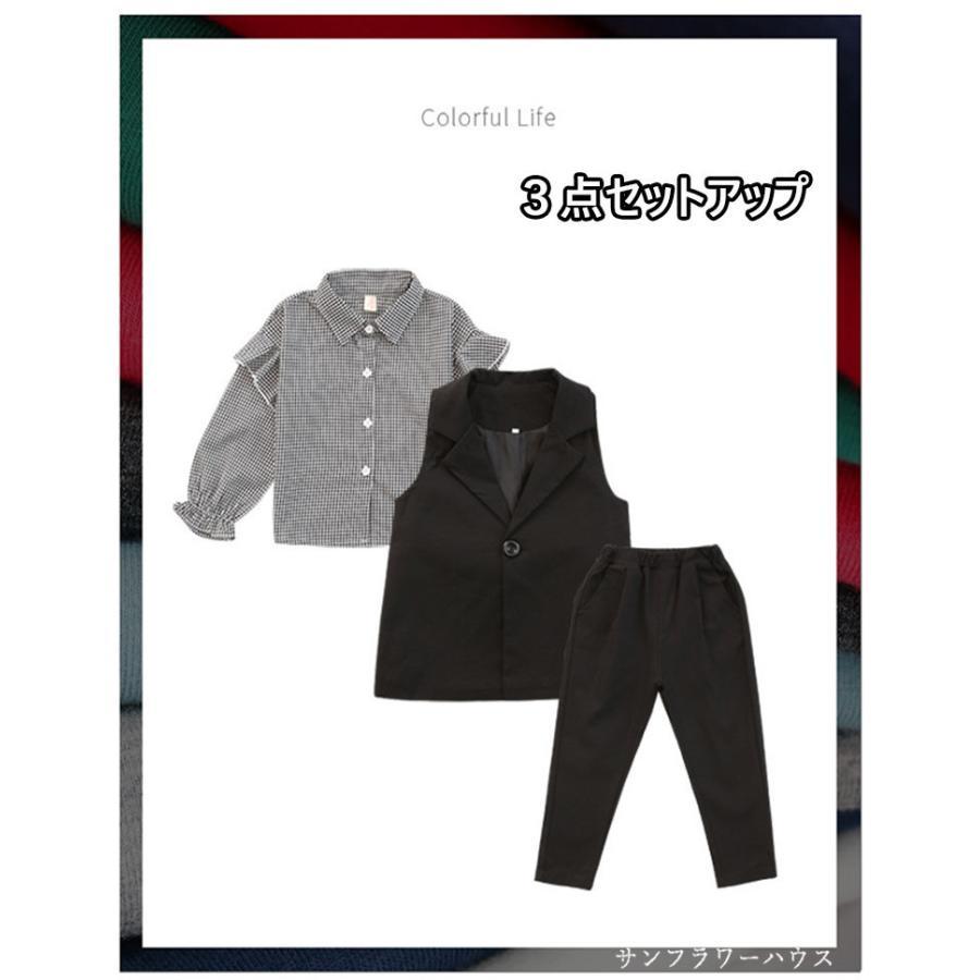 卒業式 入学式 パンツスーツ 女の子 スーツ 3点セット フォーマル セットアップ キッズ シャツ ベスト パンツ チェック柄 学園祭 結婚式 発表会 七五三 小学生 卒園式 韓国ファッション フォーマルスーツ 韓国子供服 リラックス 大きいザイズ 110 120 130 140 150 160